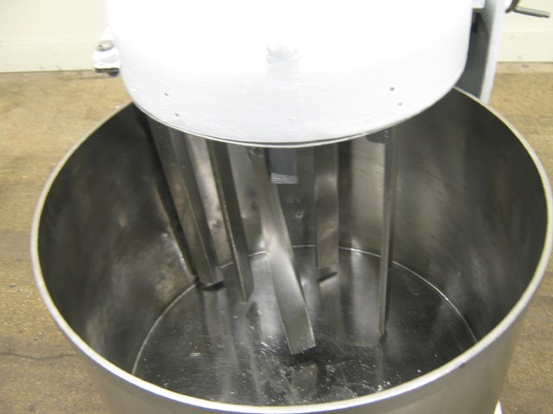 50加仑,双运动,行星式,立式小型搅拌机。配备一个28"直径× 20"深不锈钢搅拌碗,4个23"长× 2"宽不锈钢搅拌叶片,一个23"长× 2"宽不锈钢固定挡板,和一个手摇曲柄可调高度的搅拌头。