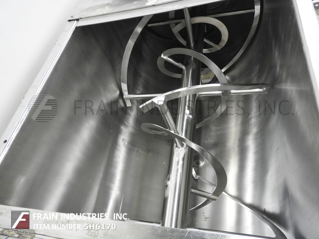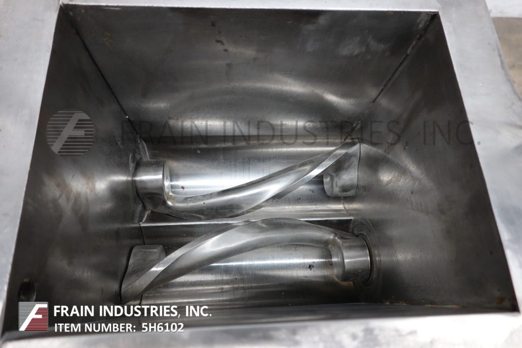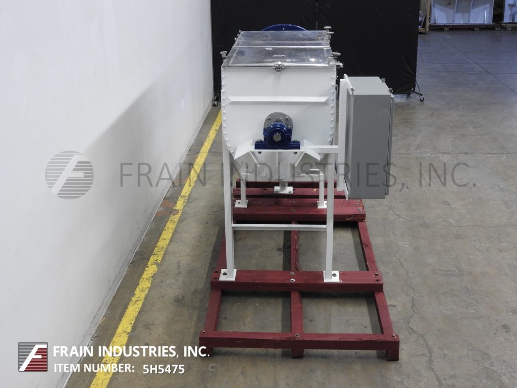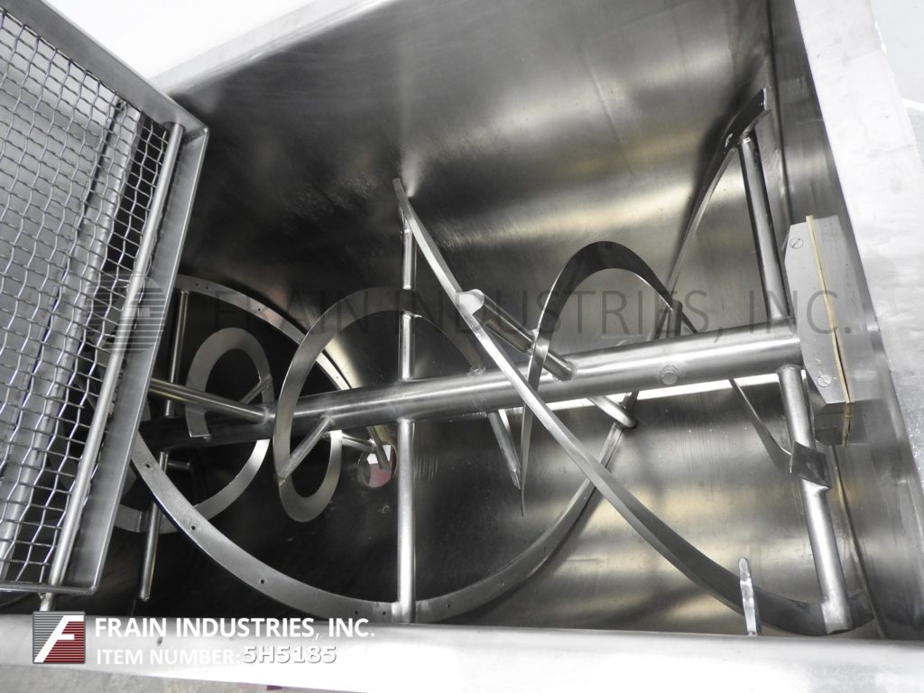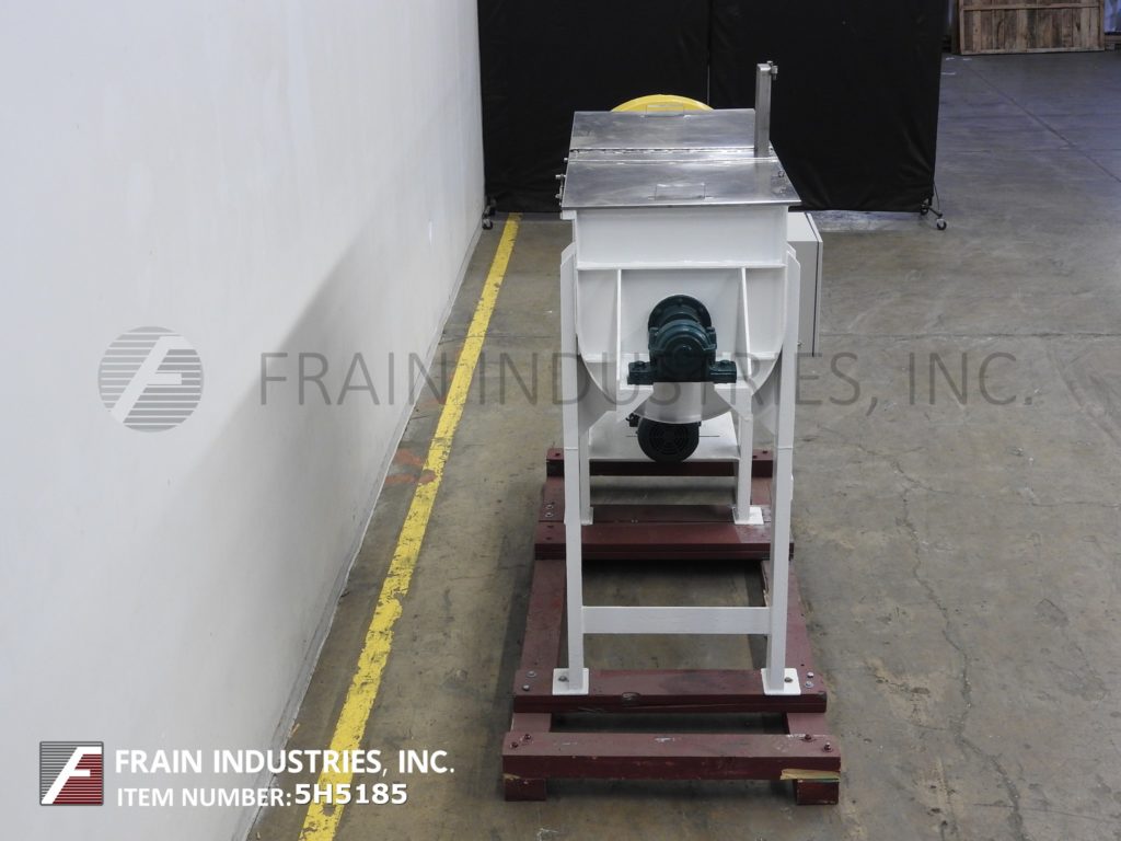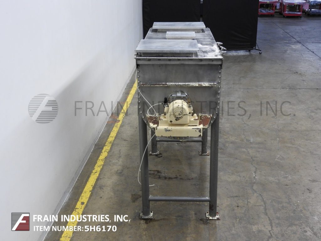 健华天,不锈钢接触件。内部混合室尺寸:60英寸长度;24“宽;26”的深度。配备翻盖,24"长x 20"宽x 16"深料斗底部(4)桨筛由1马力驱动,2½"外径1/ 4"宽x(3/8)"厚(外部)和1/ 4"宽x(1/8)"厚(内部)不锈钢带搅拌轴。4“外径中心底部手动滑排38”地面净空。安装在彩绘的基地上。