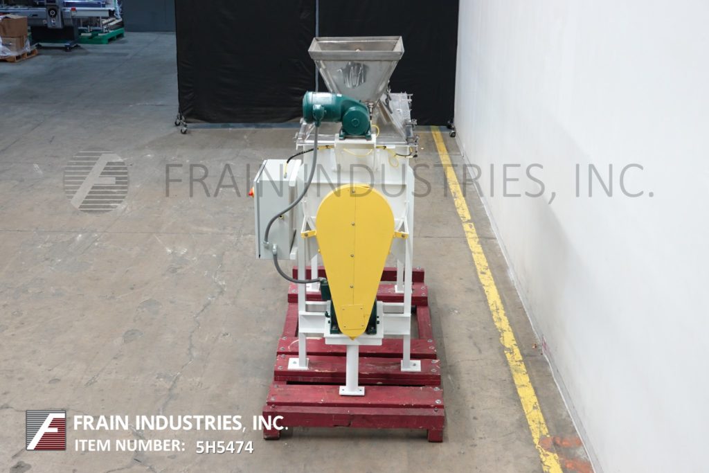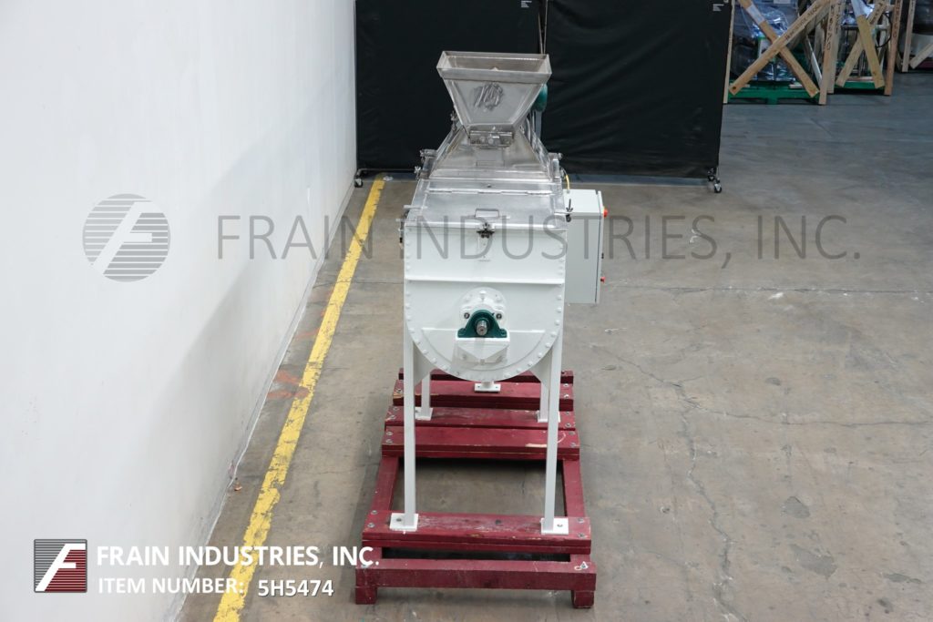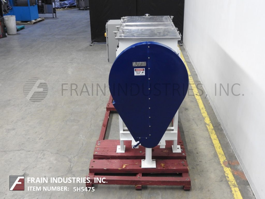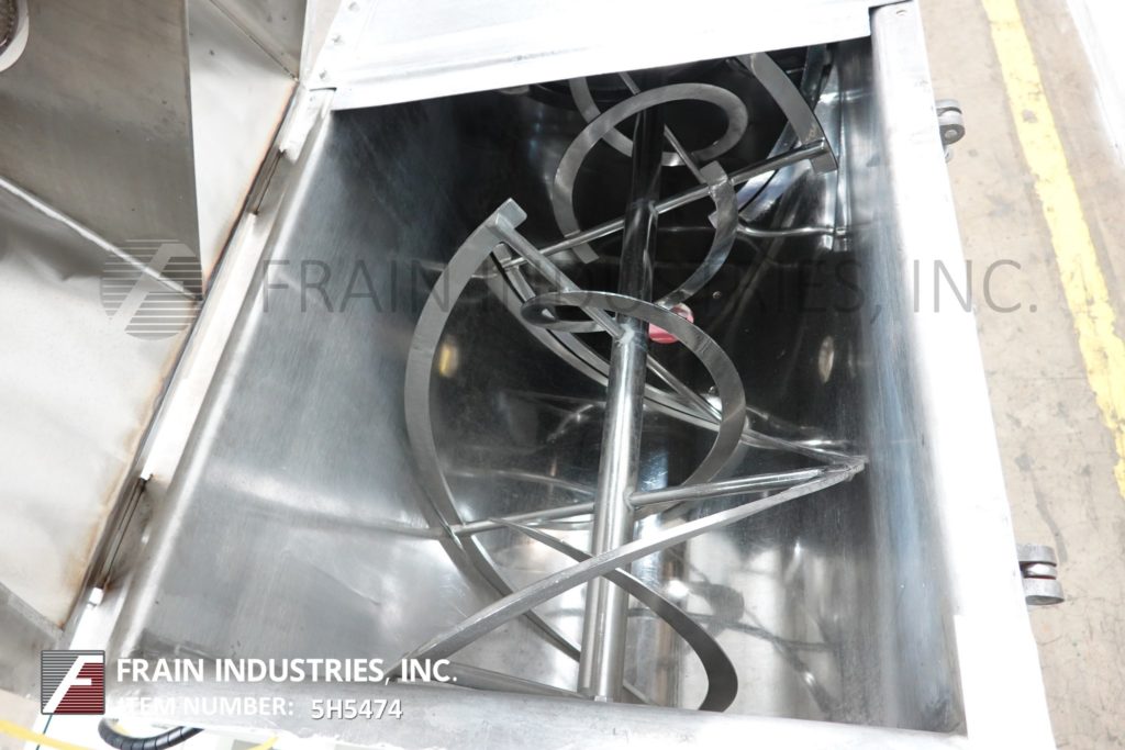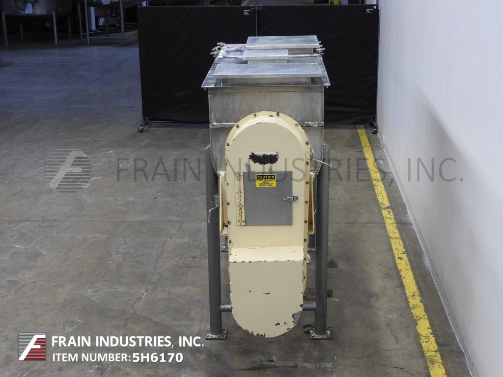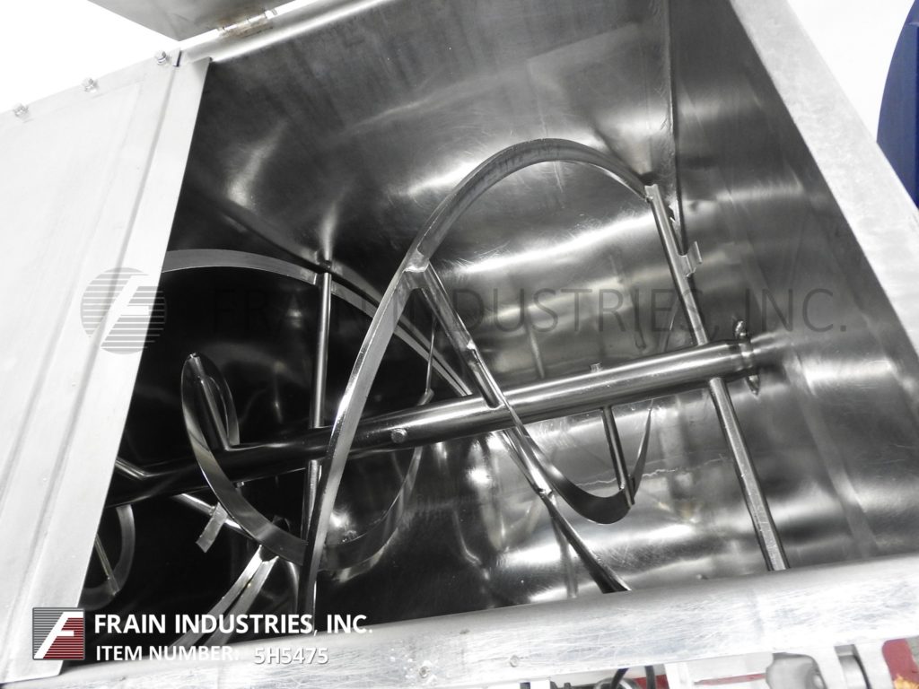 健华天,不锈钢接触件。内部混合室尺寸:60英寸长度;24“宽;26”的深度。配备翻盖,24"长x 20"宽x 16"深料斗底部(4)桨筛由1马力驱动,2½"外径1/ 4"宽x(3/8)"厚(外部)和1/ 4"宽x(1/8)"厚(内部)不锈钢带搅拌轴。4“外径中心底部手动滑排38”地面净空。安装在彩绘的基地上。