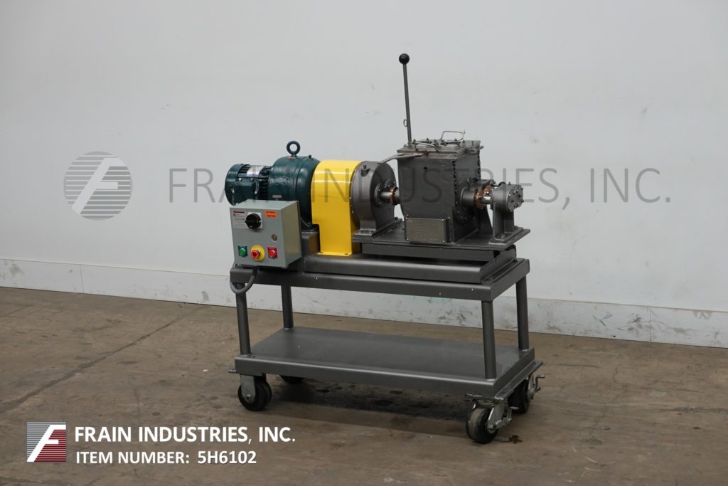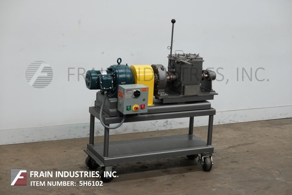 三个辊子分散磨机每小时高达350磅 - 取决于材料和应用。滚筒尺寸:10“直径; 22英寸”。滚动速度:围裙卷300 rpm;中间辊150 rpm;饲料卷59转。配有围裙,不锈钢端板,液压辊套,刮刀和不锈钢网格保护。