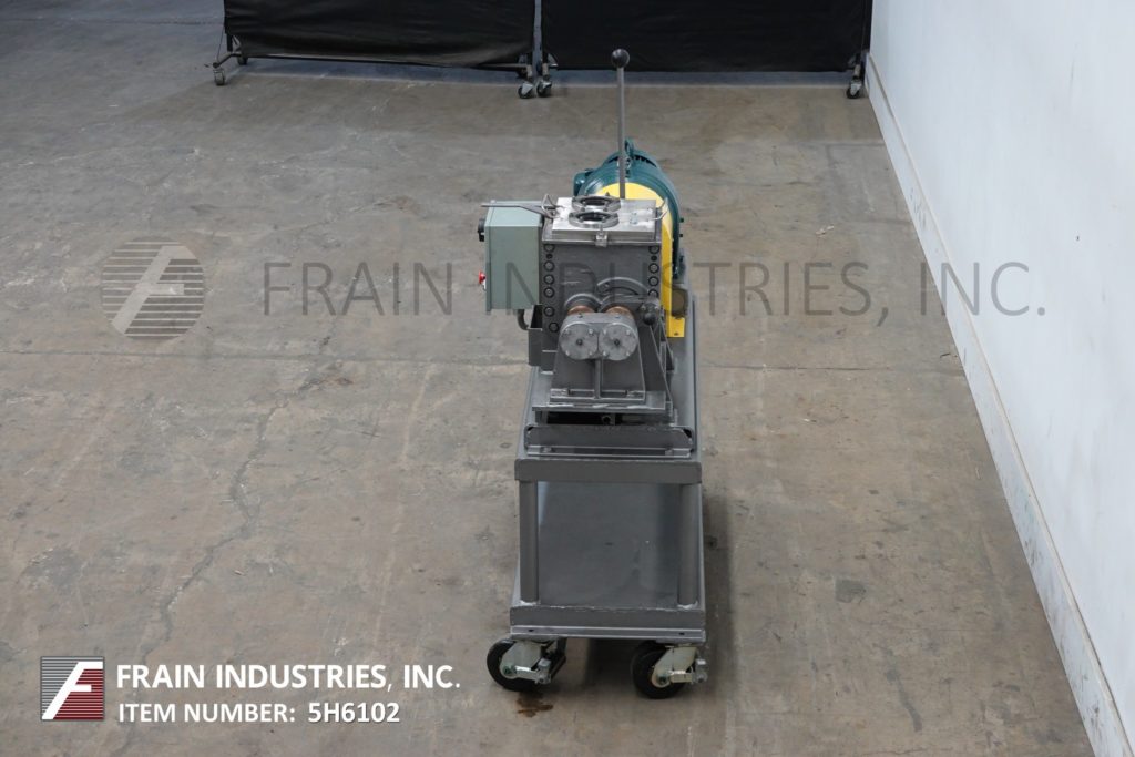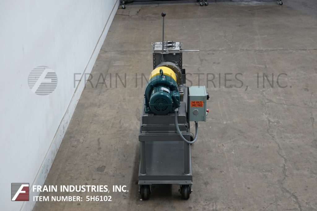 双臂不锈钢,夹套,重叠的Sigma刀片搅拌机,总共75加仑,45加仑的工作能力。混合室尺寸:26“长x 30”宽x 26“深。配备了翻盖安全篦,不锈钢接触部件,全套套额定值80 psi @ 324 f,15 hp主和1个带链驱动器的倾斜电机。按钮控制,电子停止和电气安全互锁。