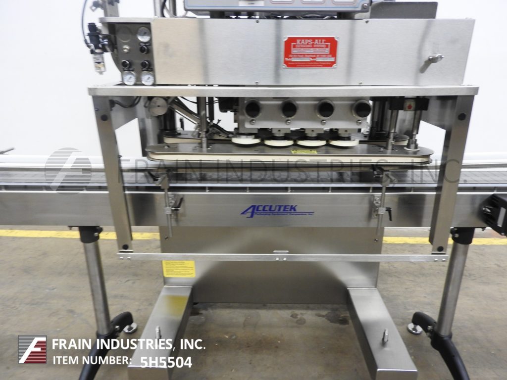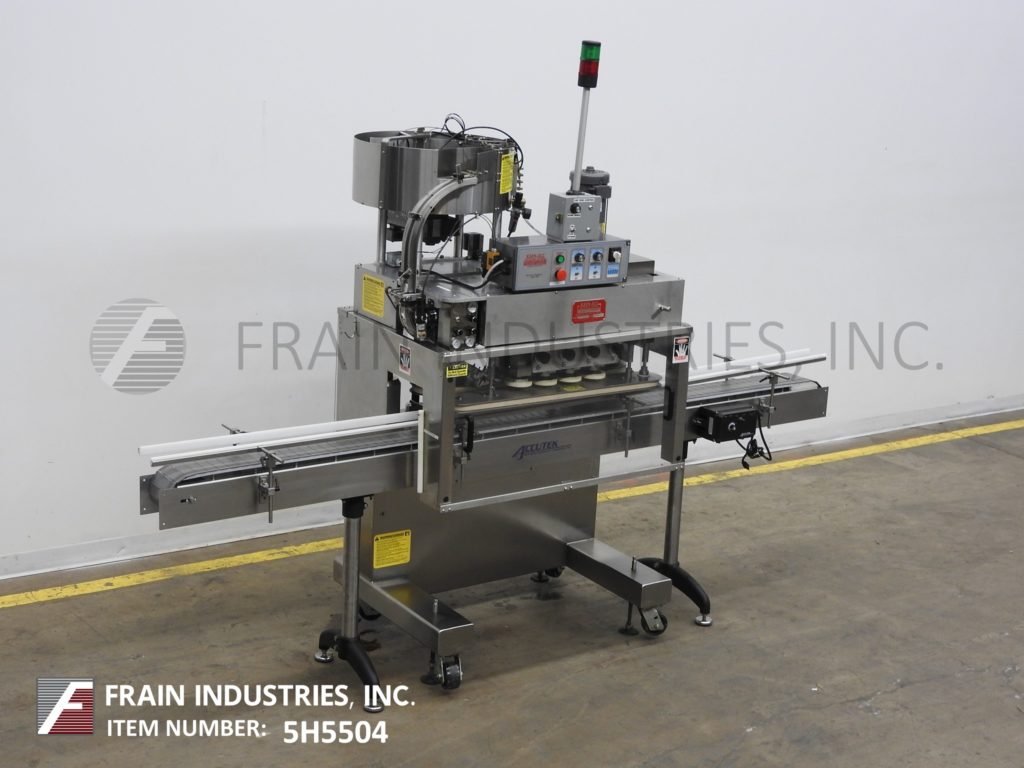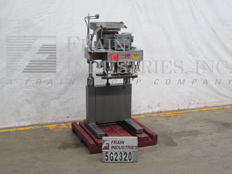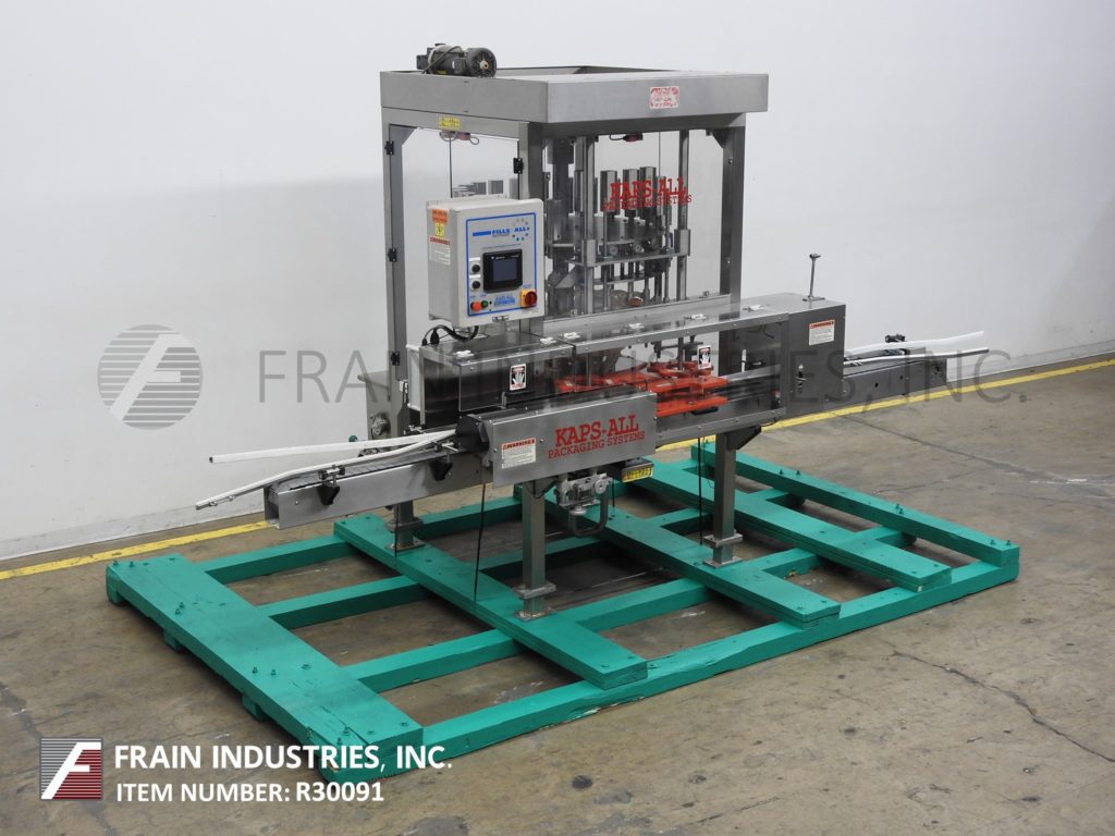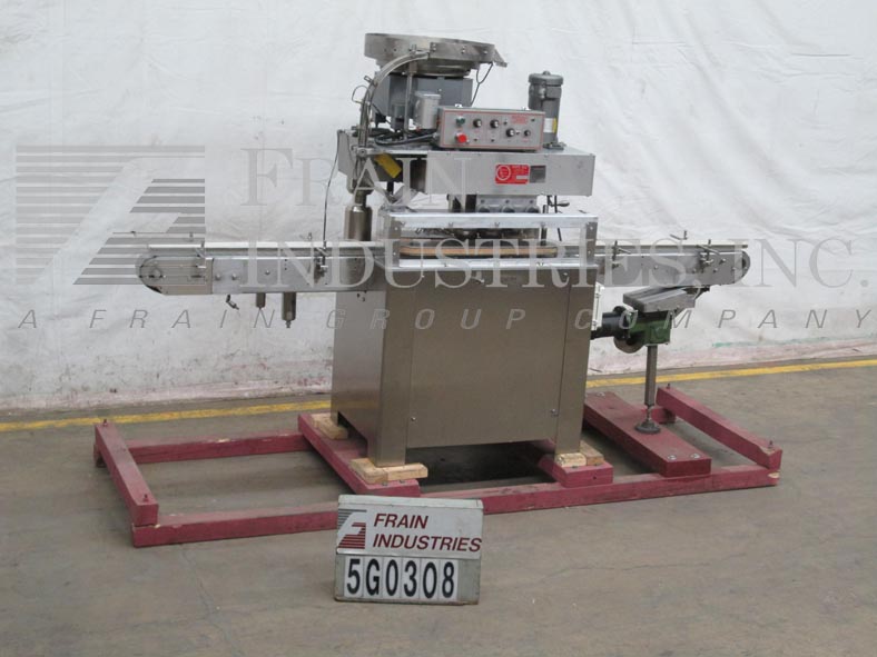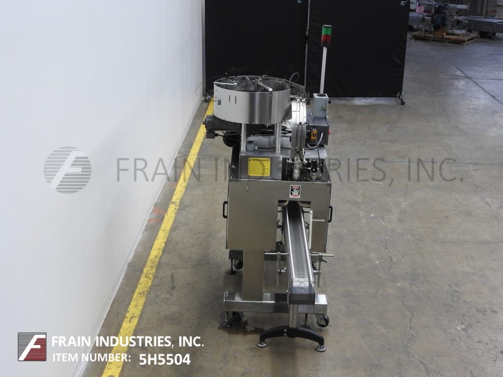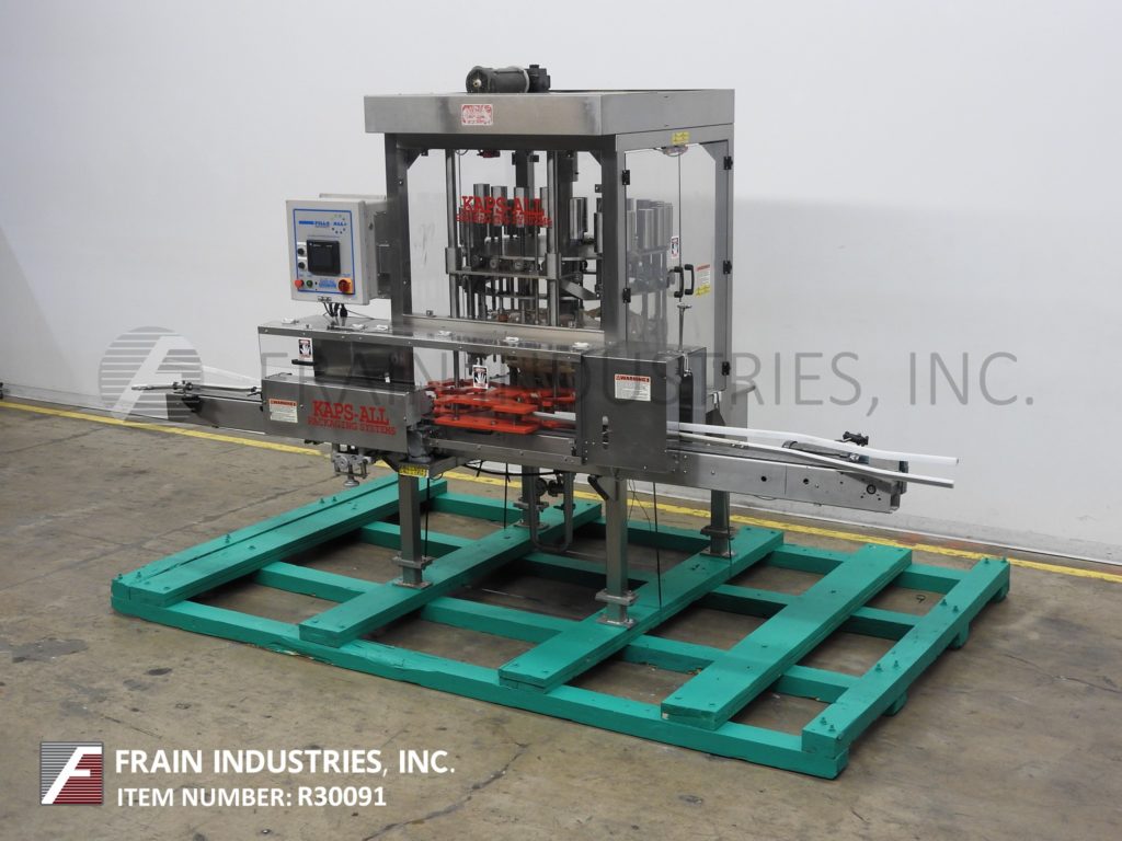 卡普,所有型号6,自动,内联,不锈钢,主轴压盖机额定从20到150容器每分钟-取决于材料,应用和机器配置。瓶盖尺寸范围:8mm至70mm,可适当更换零件。配备96"长3-1/2"宽输送机,撞击轮,24"直径送料斗,3工位/ 6主轴盖紧工位,单容器夹持带和e-stop。安装在不锈钢框架与调平腿。可能需要更换零件以适应尺寸范围。