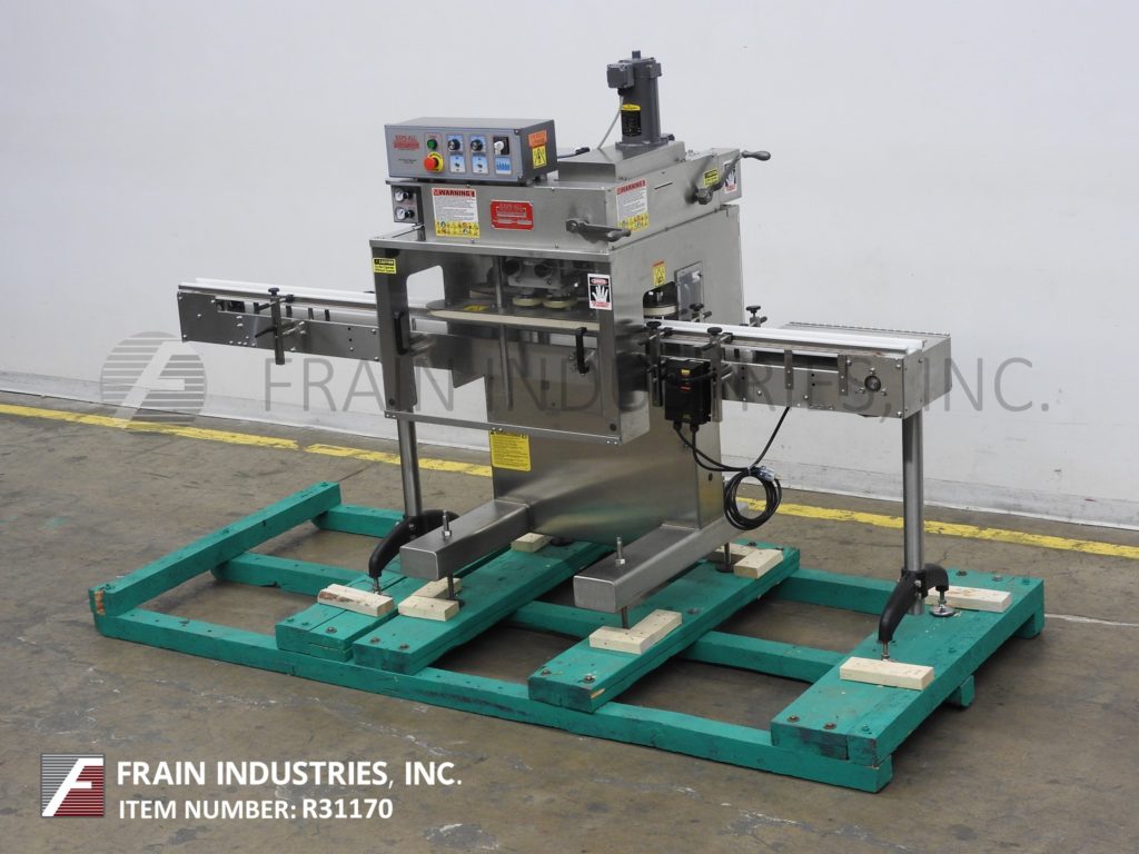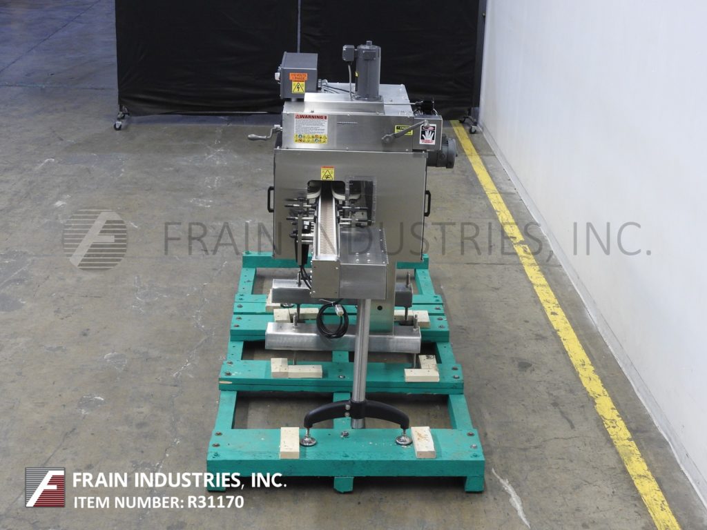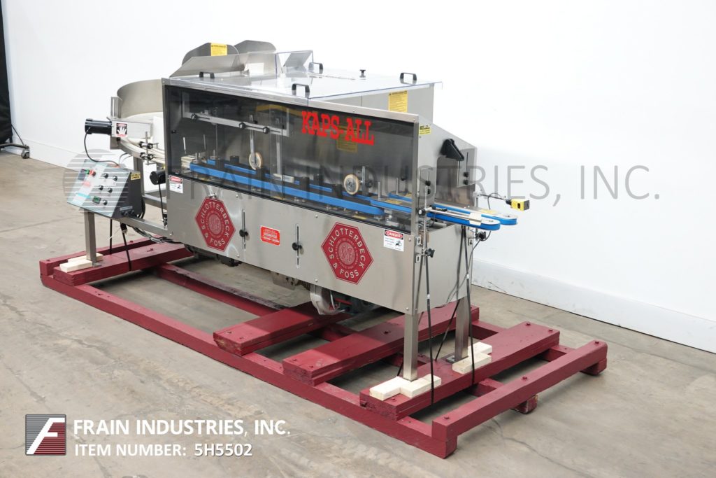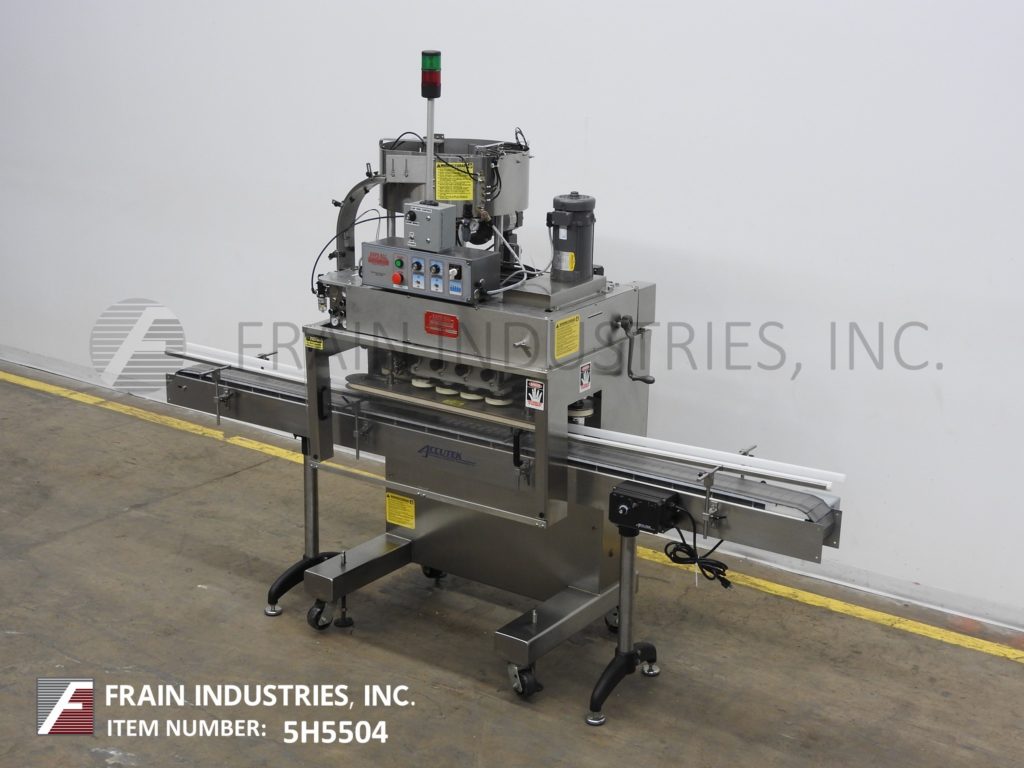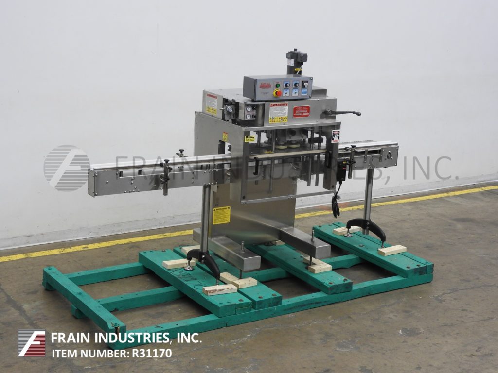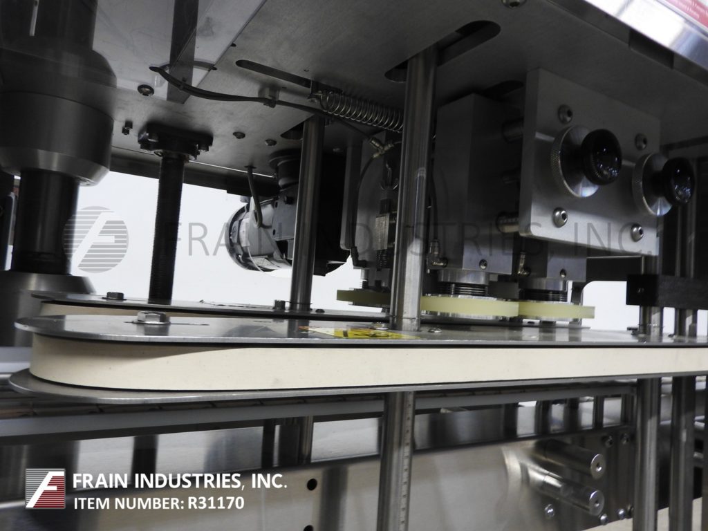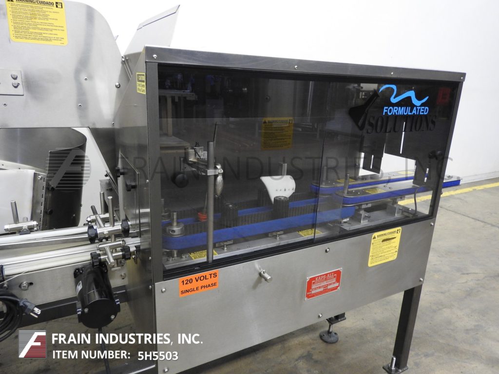 卡普,所有型号6,自动,内联,不锈钢,主轴压盖机额定从20到150容器每分钟-取决于材料,应用和机器配置。瓶盖尺寸范围:8mm至70mm,可适当更换零件。配备96"长3-1/2"宽输送机,撞击轮,24"直径送料斗,3工位/ 6主轴盖紧工位,单容器夹持带和e-stop。安装在不锈钢框架与调平腿。可能需要更换零件以适应尺寸范围。