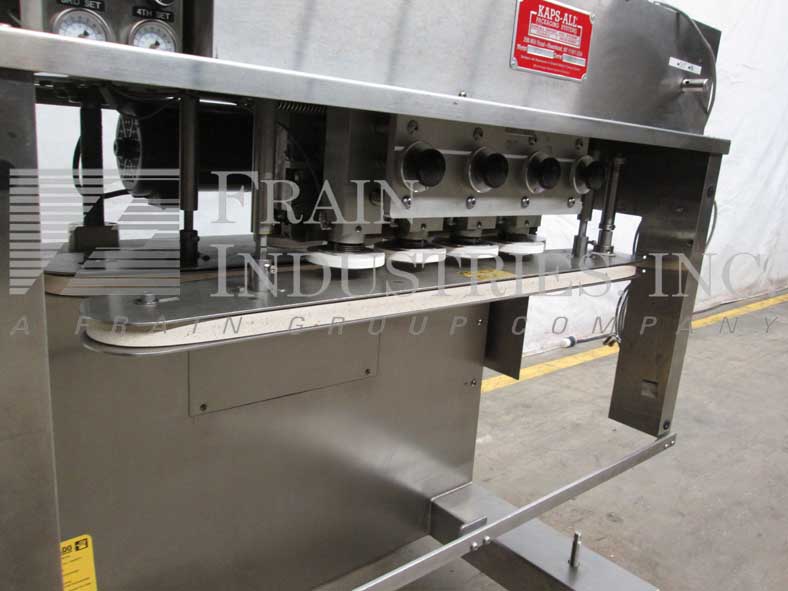 KAPS-All Model FC8,半自动,不锈钢4站,8个主轴卡钳,每分钟20到400个容器 - 取决于材料和应用。帽尺寸范围:8毫米至120毫米,集装箱尺寸范围:1盎司至2-1 / 2加仑,能够处理所有类型的帽,包括塑料,金属或玻璃容器,包括适当的变化部件和手曲柄可调节快速转换。配备36“长X 1”宽单个集装箱夹具带,3站,6个主轴非损坏盖帽,带可调扭矩离合器。带主轴和夹持带的控制面板开/关开关和速度控制拨号,提升和较低的开关,开始,电子停止按钮控制和Statis Light。安装在不锈钢底座上,带脚轮,卷起现有输送机。