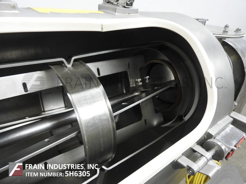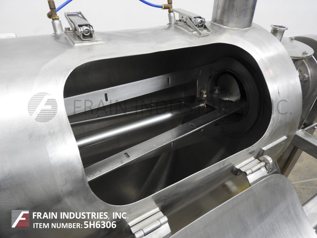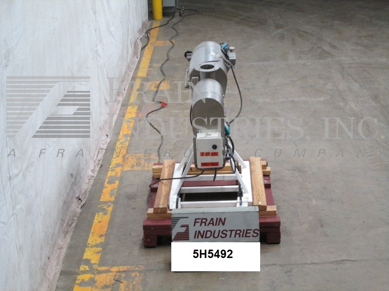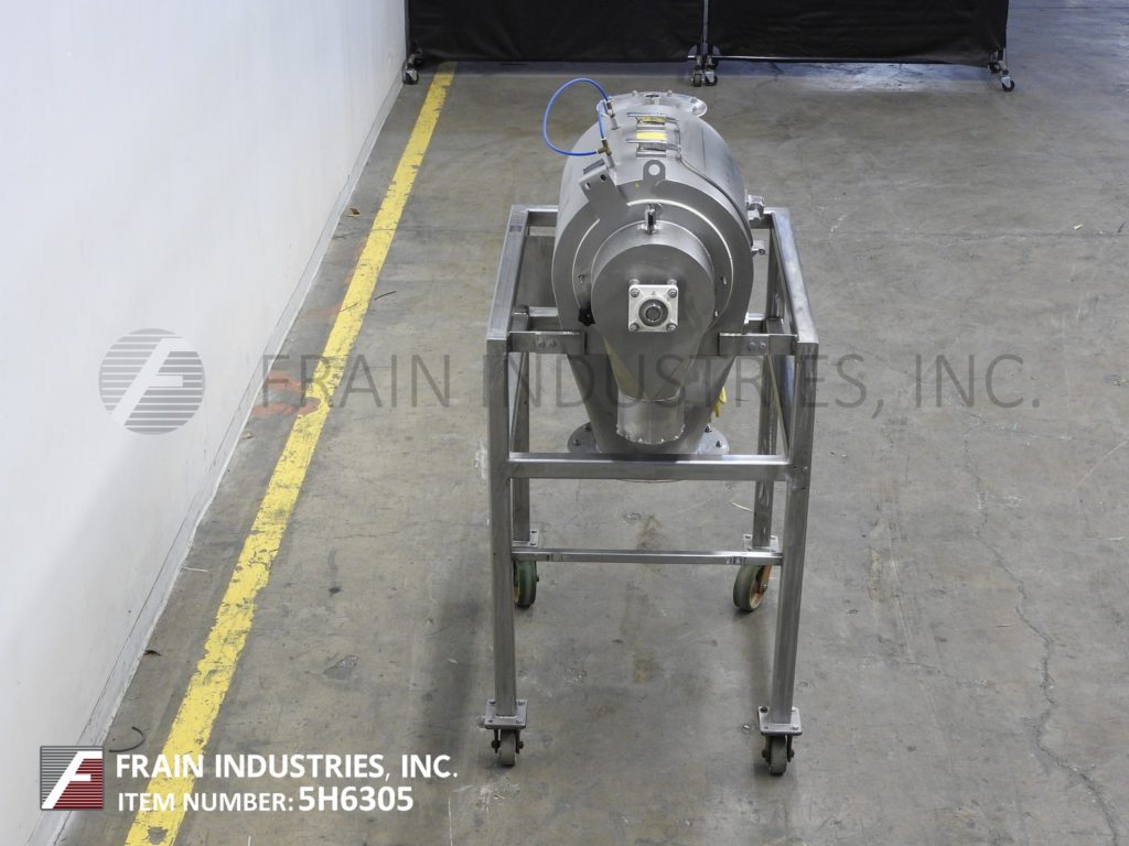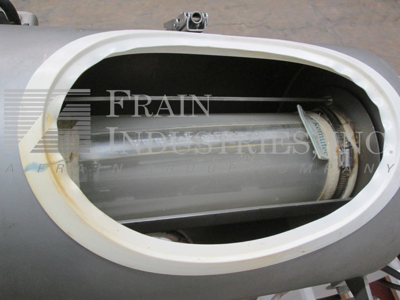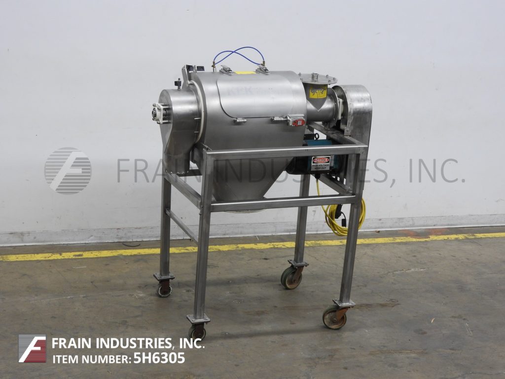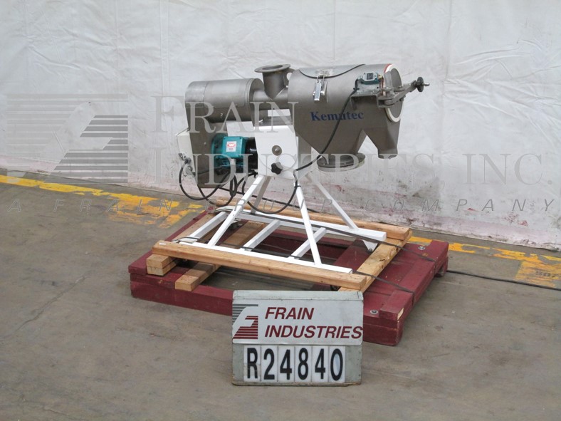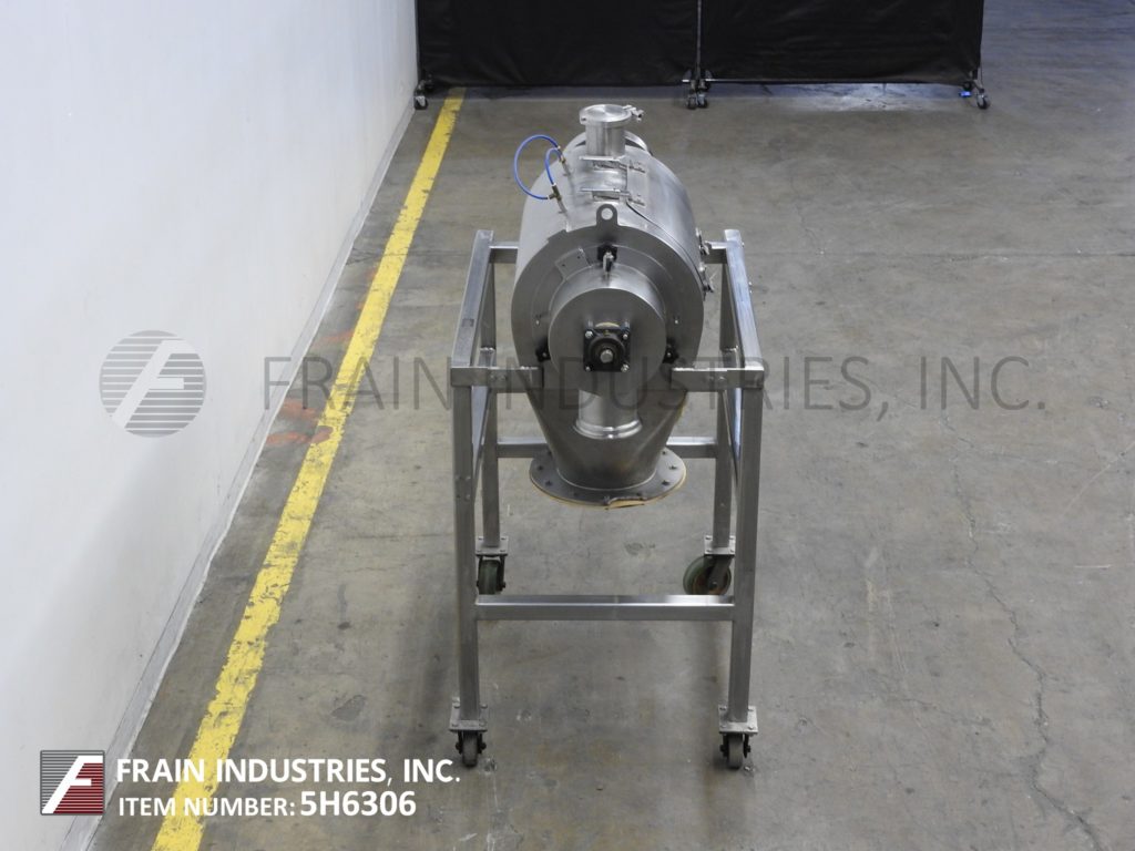 Kemutec不锈钢连续离心筛。配备6-5/8"外径/ 3-3/4" ID法兰进口,产品螺旋,14"由7"直径筛室,铰链螺栓下检修门联锁安全,12"由4-1/2"外径筛,刮桨,9"外径/ 5" ID排放和3" ID排放。安装在施法者。速率取决于材料,应用和机器配置。每个应用程序需要适当的屏幕。