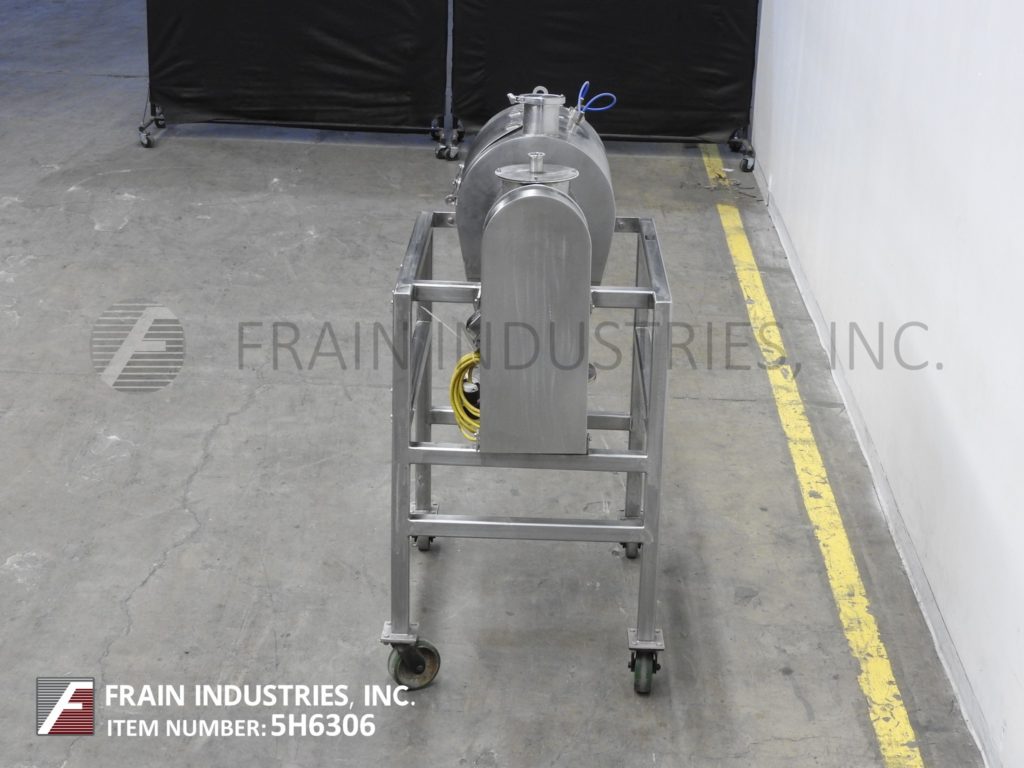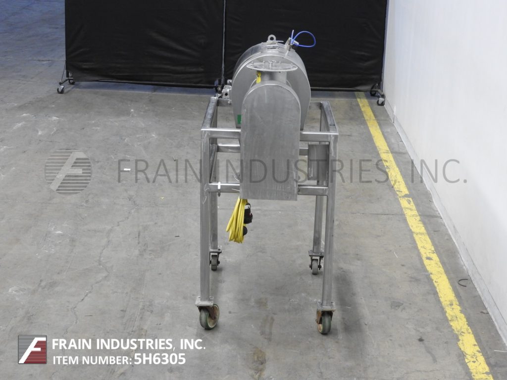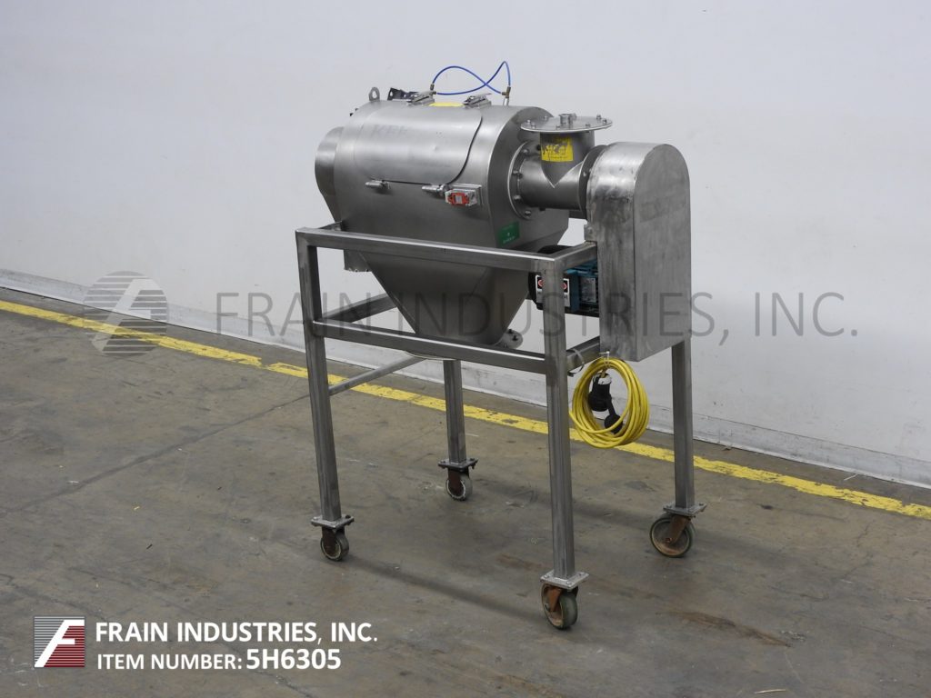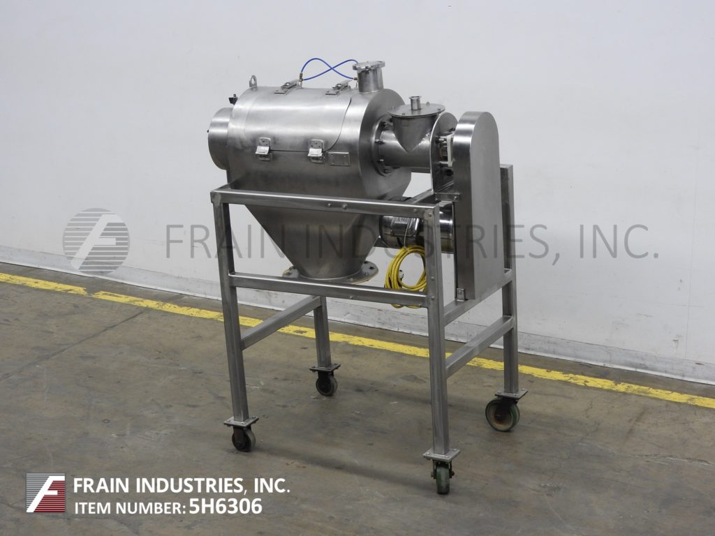 Kemutec,型号K65C,不锈钢,离心式筛,每小时可做从几公斤到多吨的产品-取决于材料和应用。配备6”产品在进料口直径,18“OD室10“OD x 24“长hygenic筛选屏幕与屏幕面积744²,铰链超大端门6“直径放电和10”底部卸料斜槽直径30“地板间隙,3马力马达驱动的安全保护。安装在(4)脚轮底座上。理想的去凝聚,头皮或分类产品到一个统一的大小。
