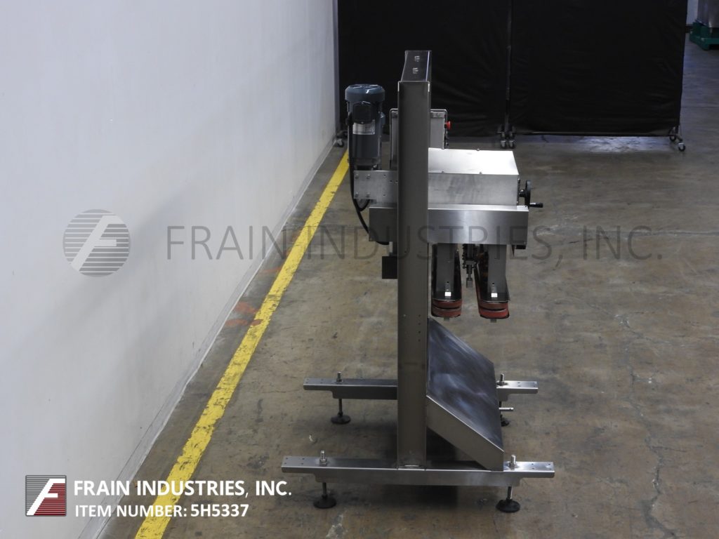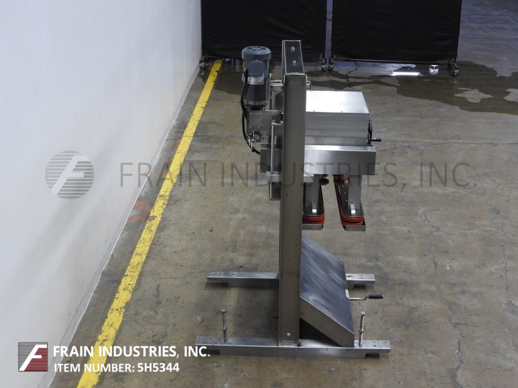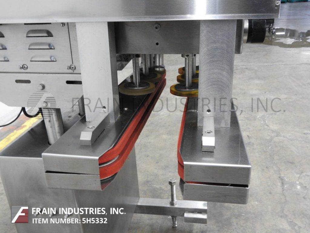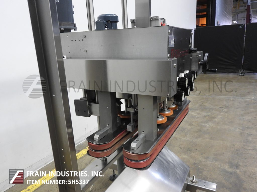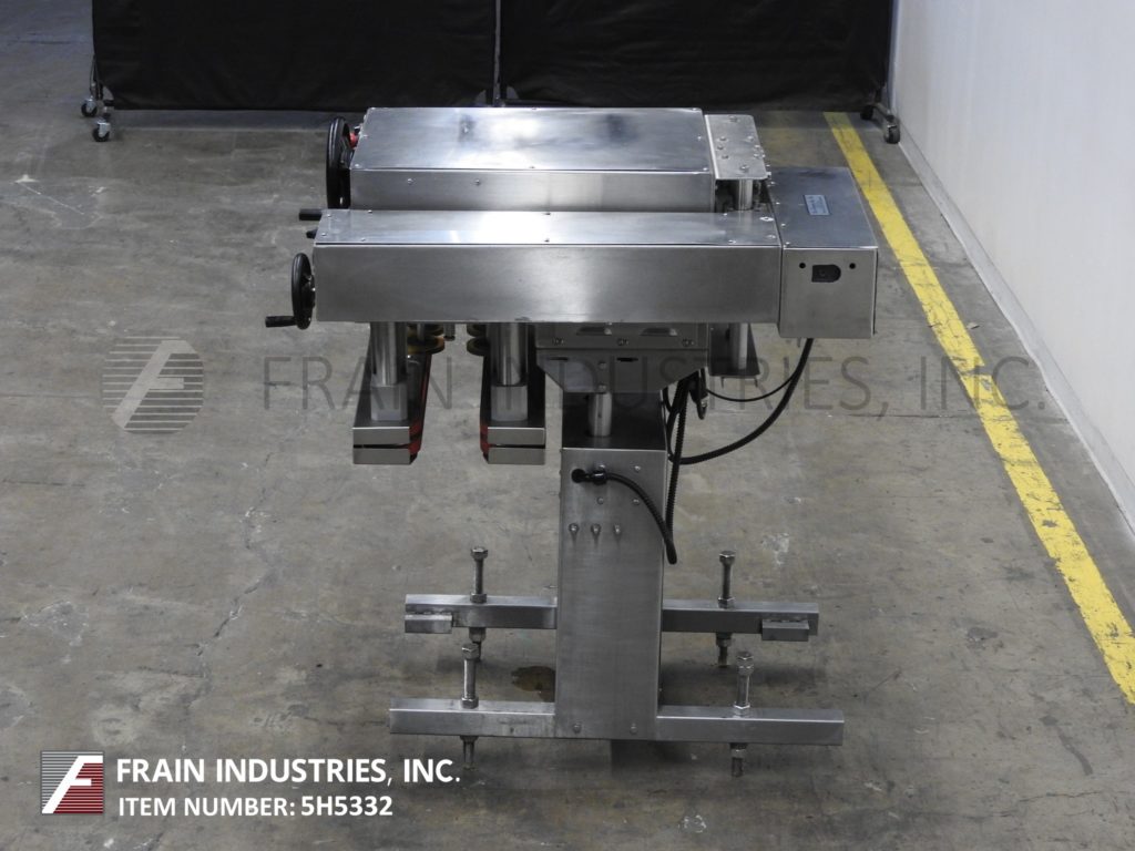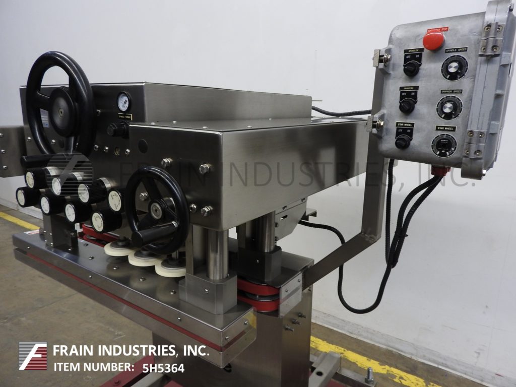吻,型号VCT-04,半自动,不锈钢2台,4主轴封盖机。盖尺寸范围:10毫米110mm时。配备有32" 长×1" 宽单容器抓持带和2台(4主轴)帽拉紧。与/主轴和夹持器带断开关和速度控制装置拨号控制面板。安装在不锈钢底盘,支撑垫。速度依赖于材料,应用和设备配置。