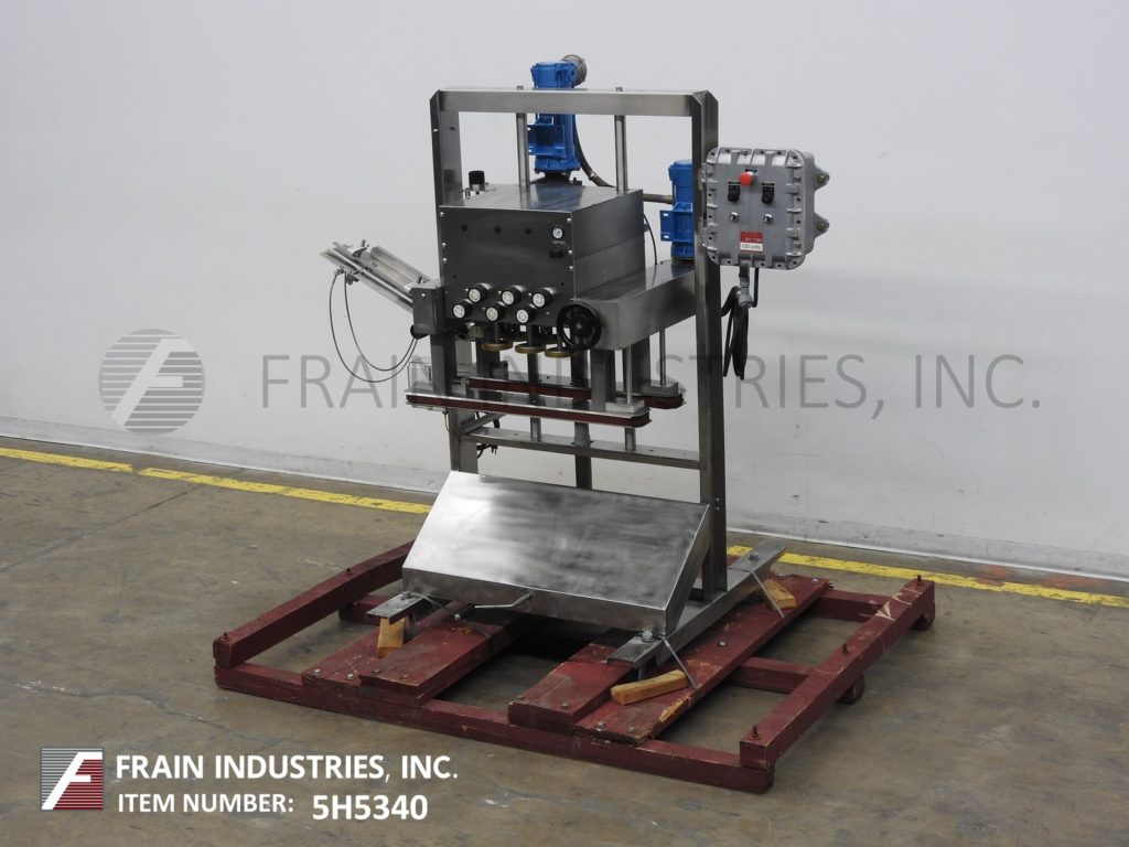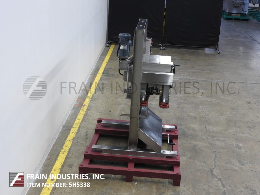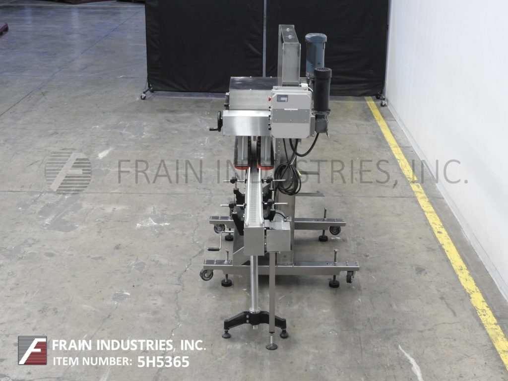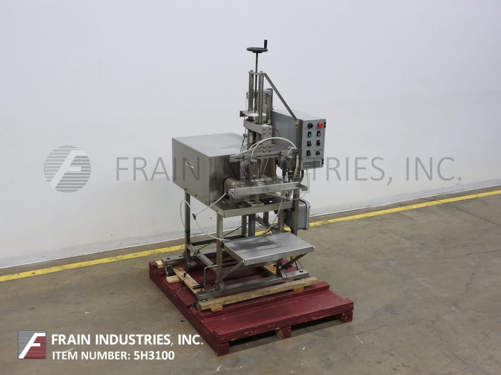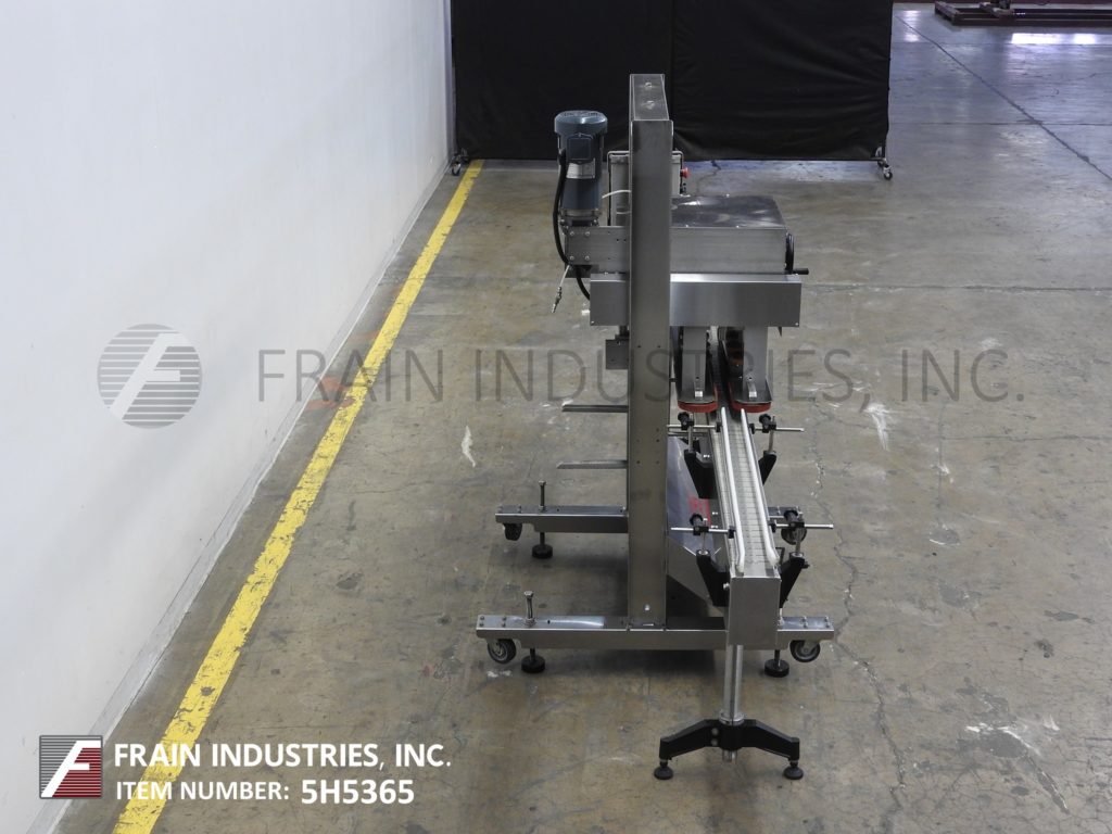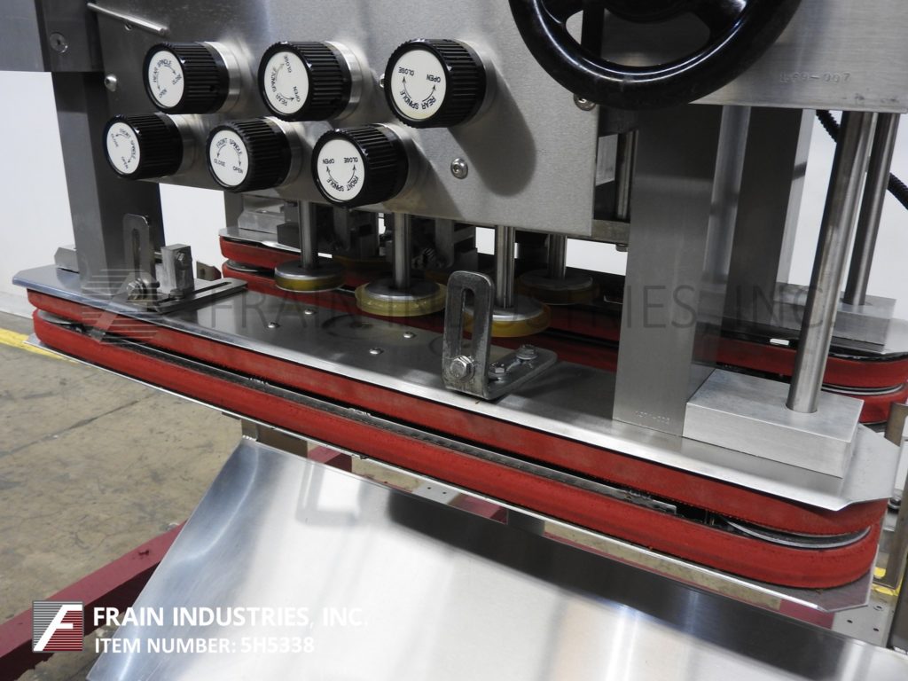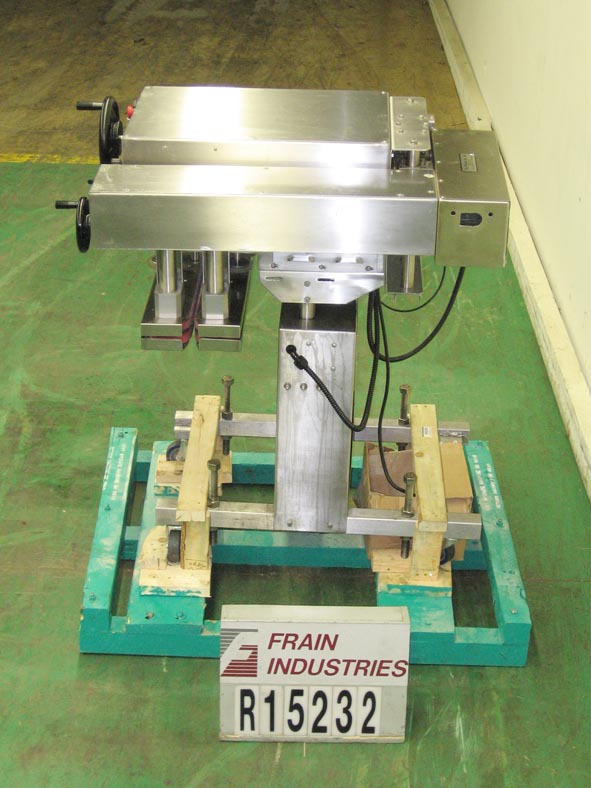 吻,型号VCT-04,半自动,不锈钢2台,4主轴封盖机。盖尺寸范围:10毫米110mm时。配备有32" 长×1" 宽单容器抓持带和2台(4主轴)帽拉紧。与/主轴和夹持器带断开关和速度控制装置拨号控制面板。安装在不锈钢底盘,支撑垫。速度依赖于材料,应用和设备配置。