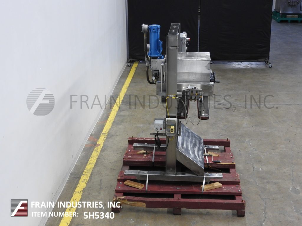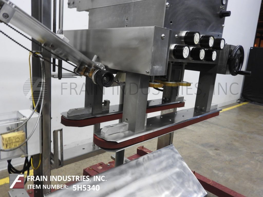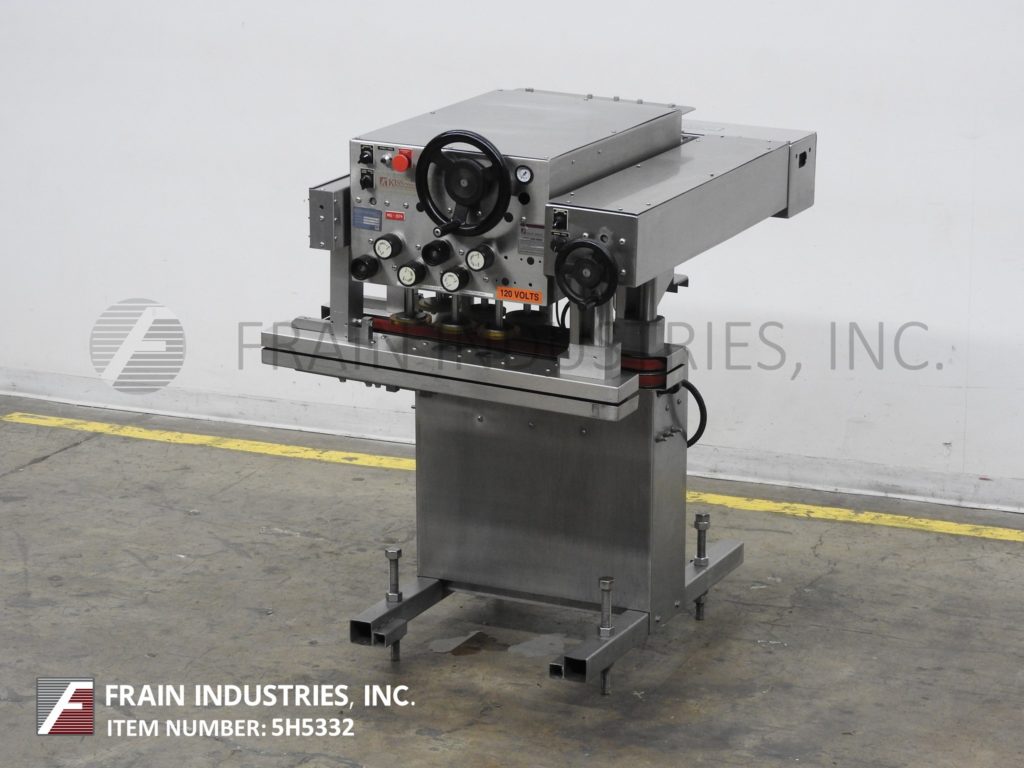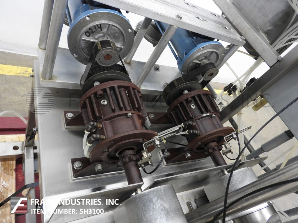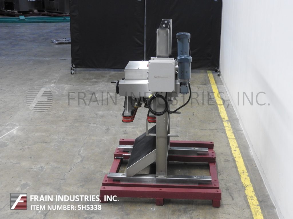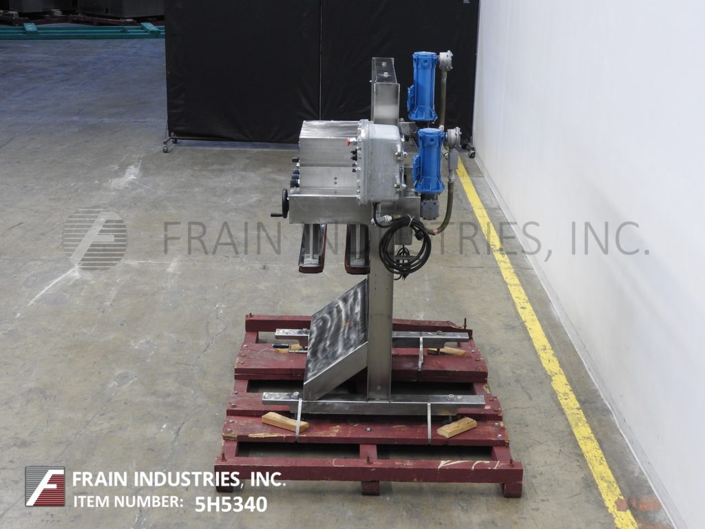 吻,型号VCT-04,半自动,不锈钢2台,4主轴封盖机。盖尺寸范围:10毫米110mm时。配备有32" 长×1" 宽单容器抓持带和2台(4主轴)帽拉紧。与/主轴和夹持器带断开关和速度控制装置拨号控制面板。安装在不锈钢底盘,支撑垫。速度依赖于材料,应用和设备配置。