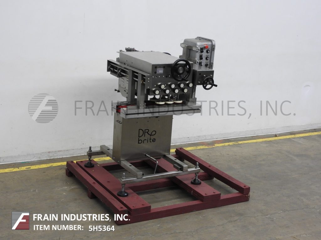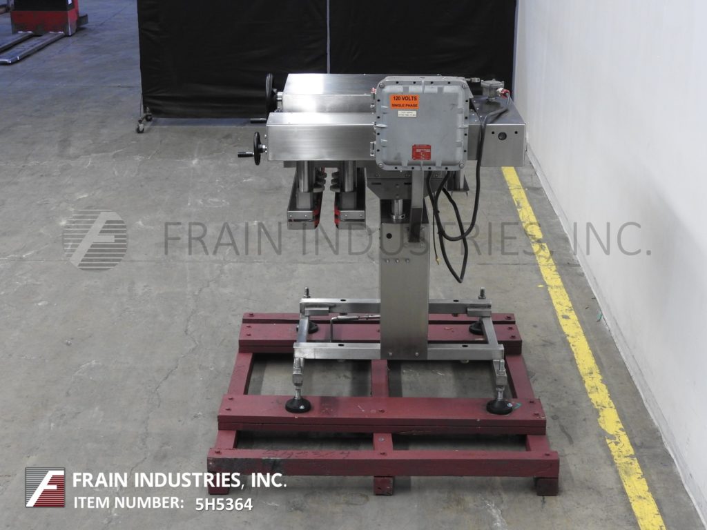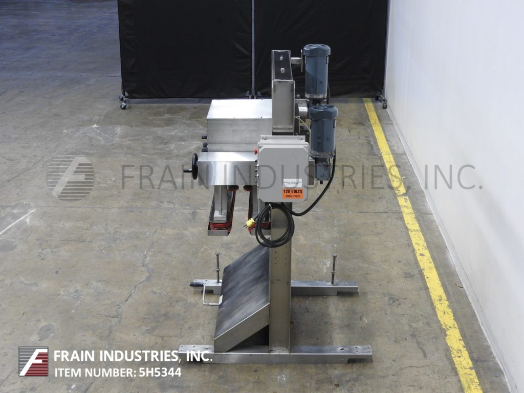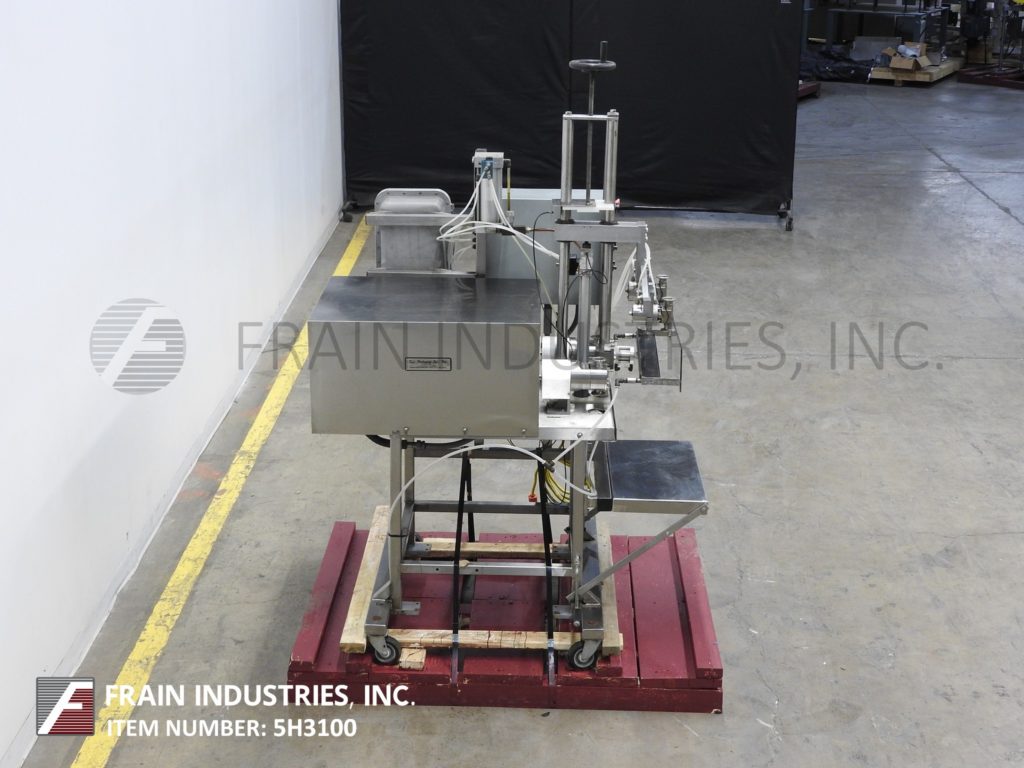 吻打包模型5011-007,半自动,直列,3台,6主轴不锈钢帽tightner每分钟的容器数 - 这取决于材料和应用。5- 1/8" (130毫米)和(6)可调节主轴与不锈钢容器带式输送机最大帽尺寸具有3/4与1725转。控制面板马力的电动机驱动装置具有的各种速度控制转盘和启动,停止,E-停止按钮控件。安装在具有脚轮和水平腿不锈钢基架。