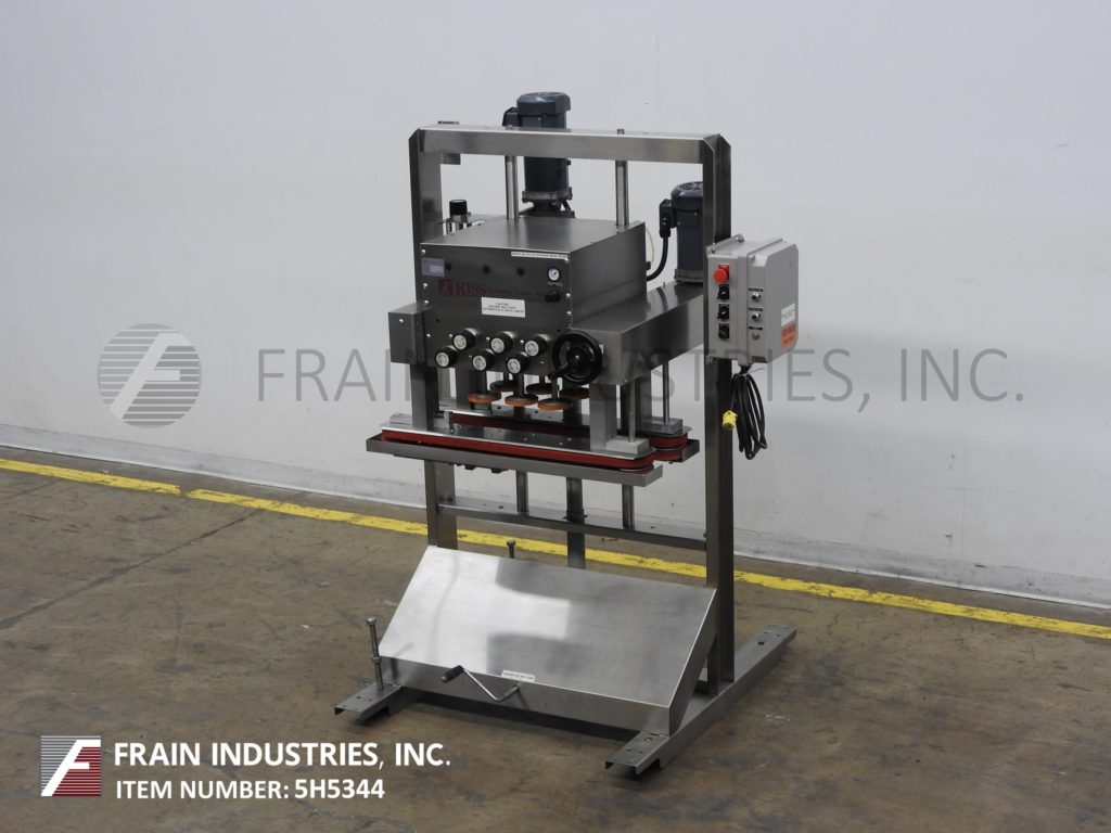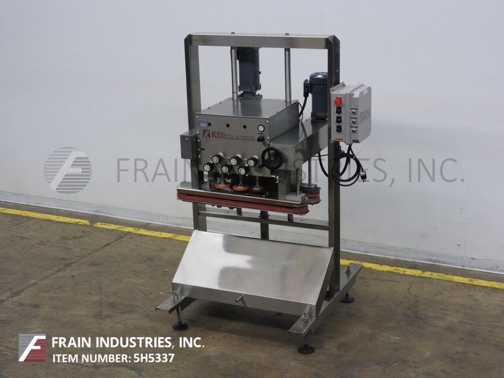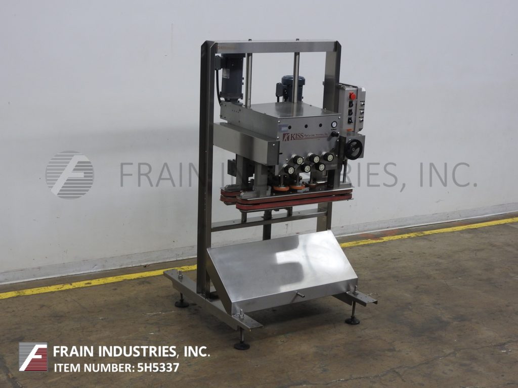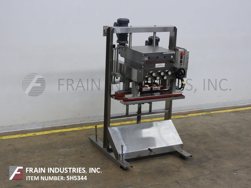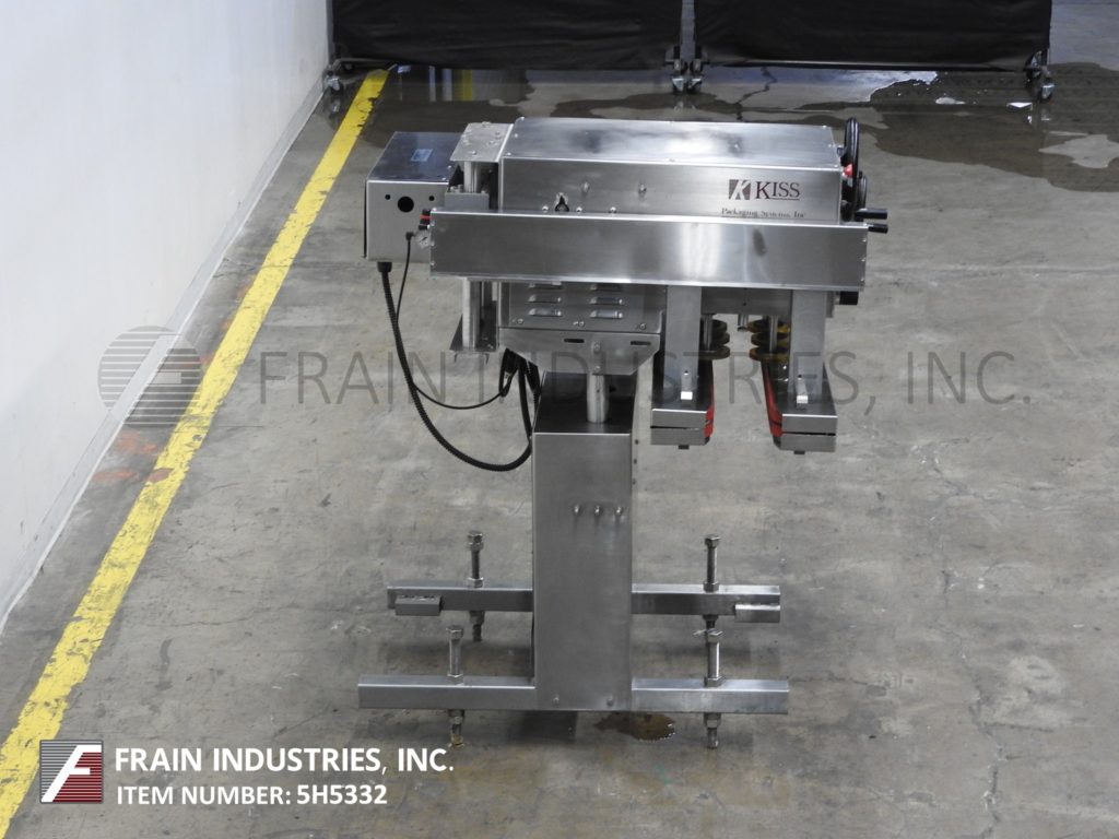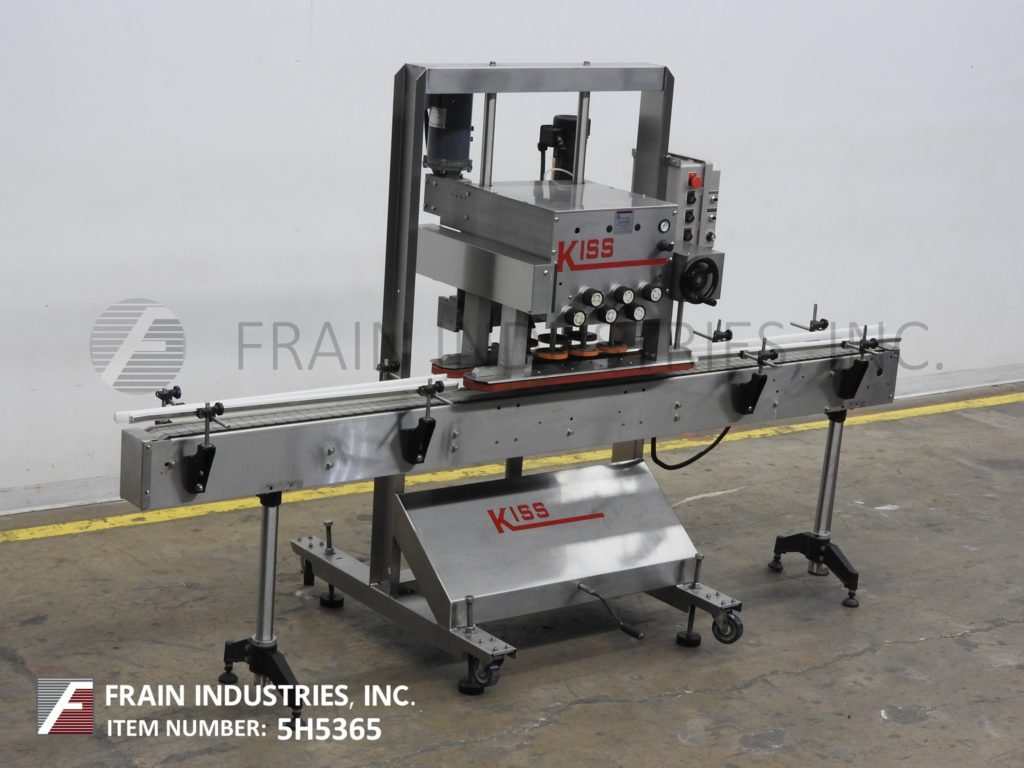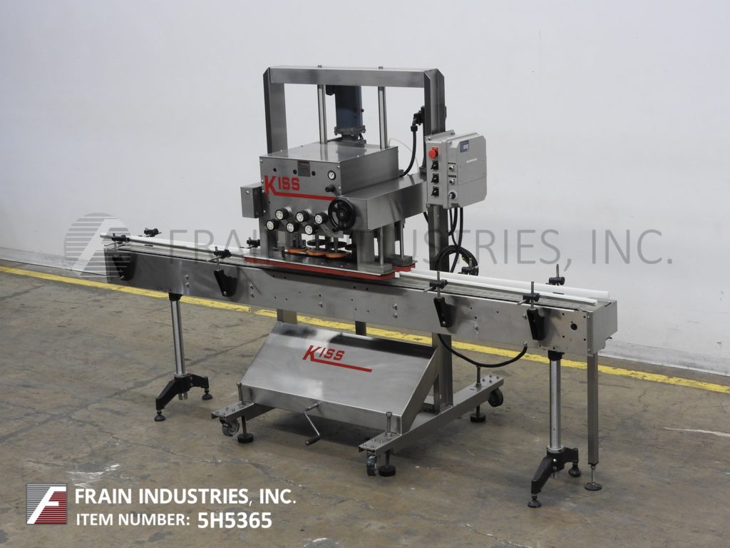 Kiss Packaging Model CTO8Exp,半自动,内联,3站,6个主轴不锈钢,每分钟容器上的数量的羽毛瓶盖 - 取决于材料和应用。配有3个站,6个主轴重型盖紧盖,空气离合器上一组主轴,用于一致扭矩。304抛光不锈钢底座和外壳,双夹具集装箱带。在封端头上的主轴和夹持带上的个人调整,电动高度调节。控制面板具有各种速度控制拨盘并启动,停止,电子停止按钮控件。安装在不锈钢基架上,带水平腿。