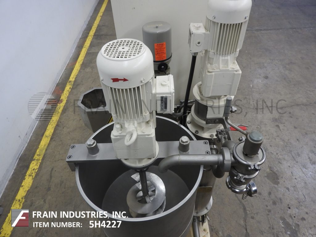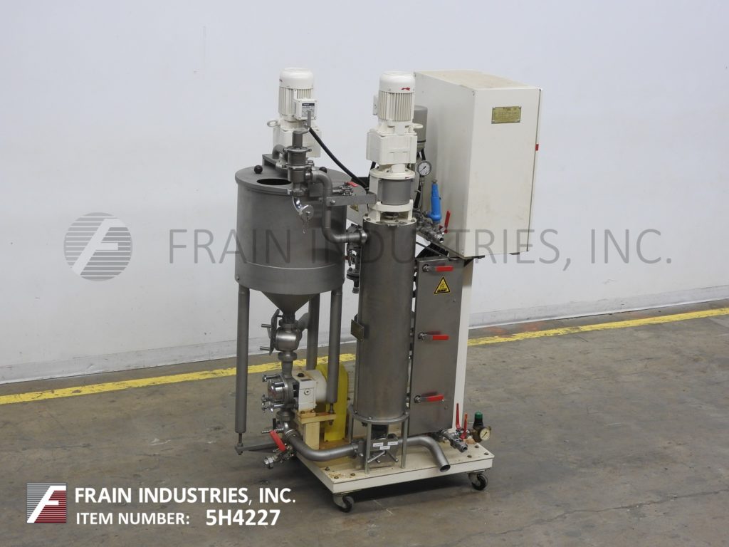 Klockner Hansel, Model HSF, skid mounted mixing and cooking system. Equipped with a 20" diameter x 16" deep stainless steel single wall mixing tank with sprial agitation powered by a ¾ hp drive. Fristam, Model FKFNSH 25, positive displacement pump powered by a 1 hp drive and a scrape surface heat exchanger with a 4½ gallon capacity powered by a ½ hp drive. Control panel with push button start / stop and digital temperature controller.