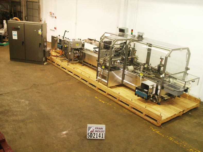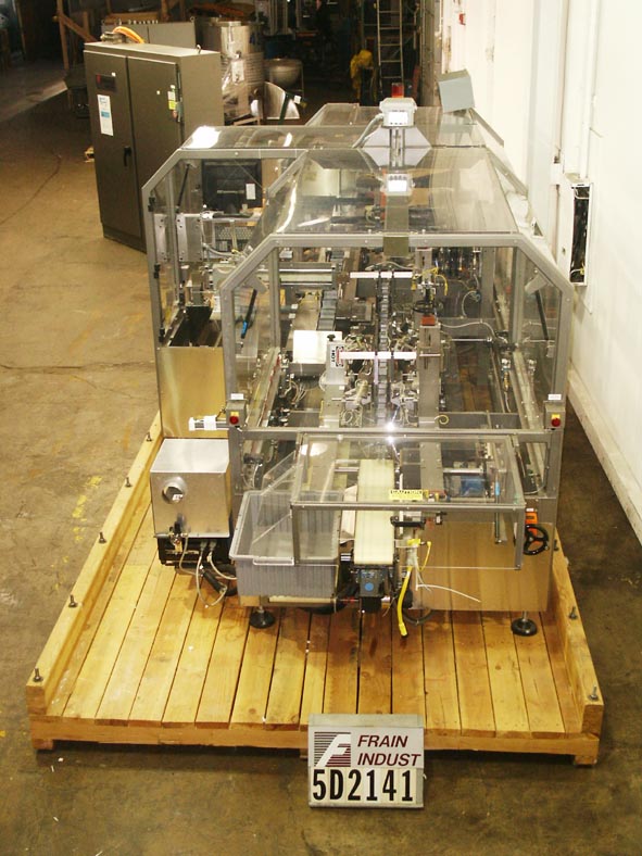 Klockner 2000系列IMC/SM,卧式,不锈钢,间歇运动,伺服驱动,热熔胶盒额定20至65次每分钟-取决于材料和应用。纸箱尺寸范围1"至4-1/2"长度;3/4"到3-1/2"宽度;深度3-3/8"至9"。配备4条可调链设置在6"中心,72"长的3带产品饲料部分,210"长的饲料输送机有6"长x 9-1/2"深固定产品斗与分配器2个产品每斗。72"长自动空白纸盒杂志,4头旋转PIC n地方,纸盒按住,4头ram装载机,热熔胶系统,皮瓣折缝和关闭与压缩部分。控制面板,A/B PLC与Nematron摆动臂控制器,启动/停止,无产品/无纸箱传感器,低空白传感器,e-stop。安装在不锈钢框架上,采用联锁安全保护。