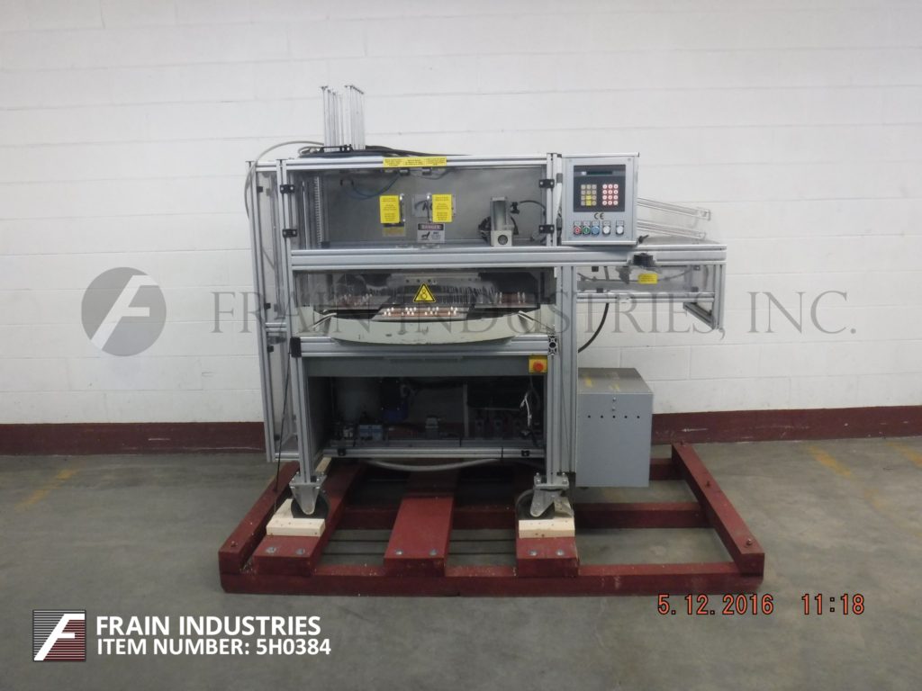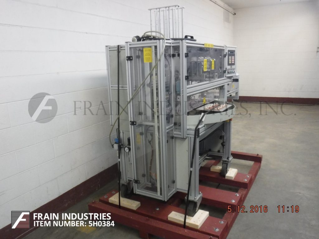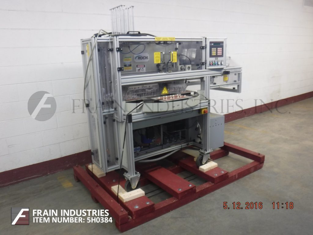 科赫,KDT-NP型,自动,4工位,旋转吸塑封口机。每分钟5到12次,根据材料,应用,机器配置和操作者灵巧度的不同,有不同的产品数量。配备40"直径转盘与(4)产品站,13¾" x 9¾"密封压板区域,吸罩和卡片馈给部分真空pickoff和手动负载产品区域。控制面板有按钮启动和停止与触摸板控制器。安装在底座上,有安全防护和脚轮。