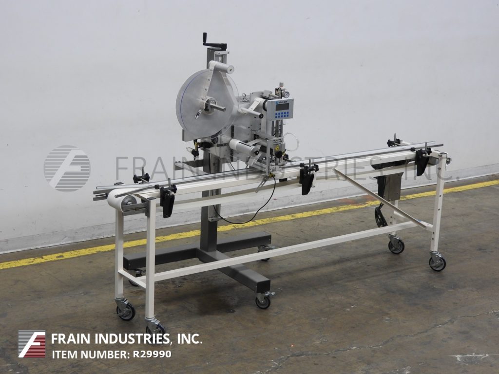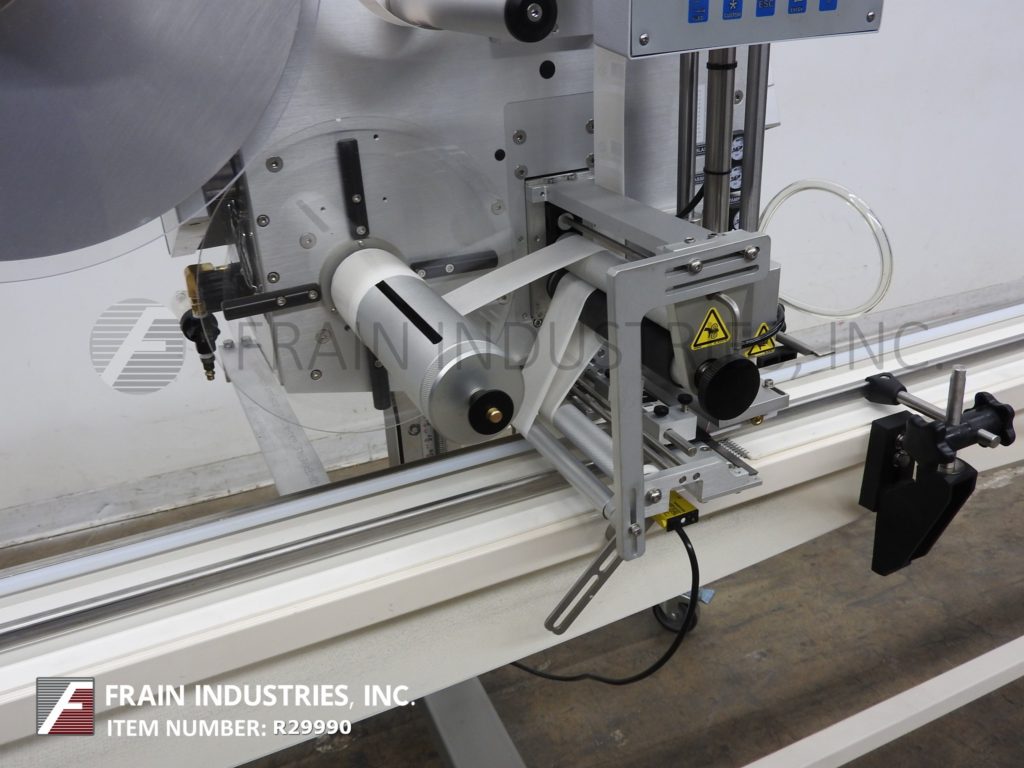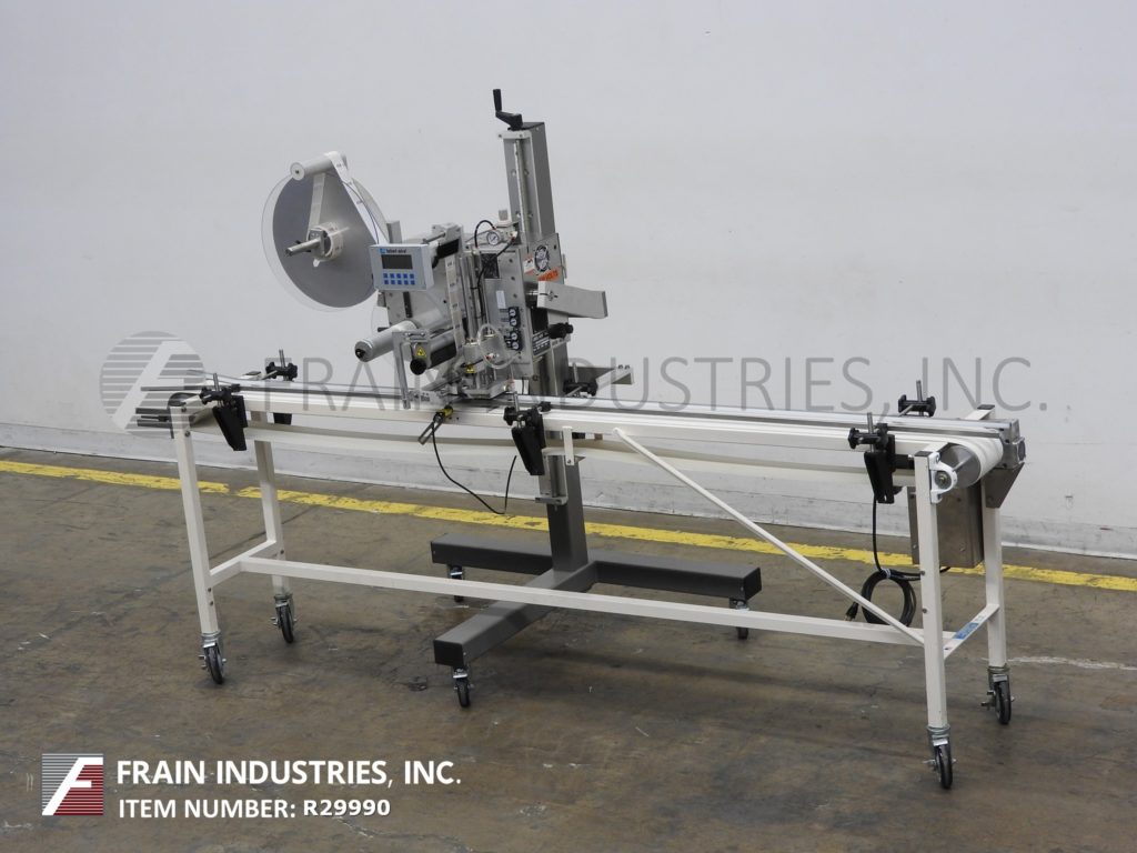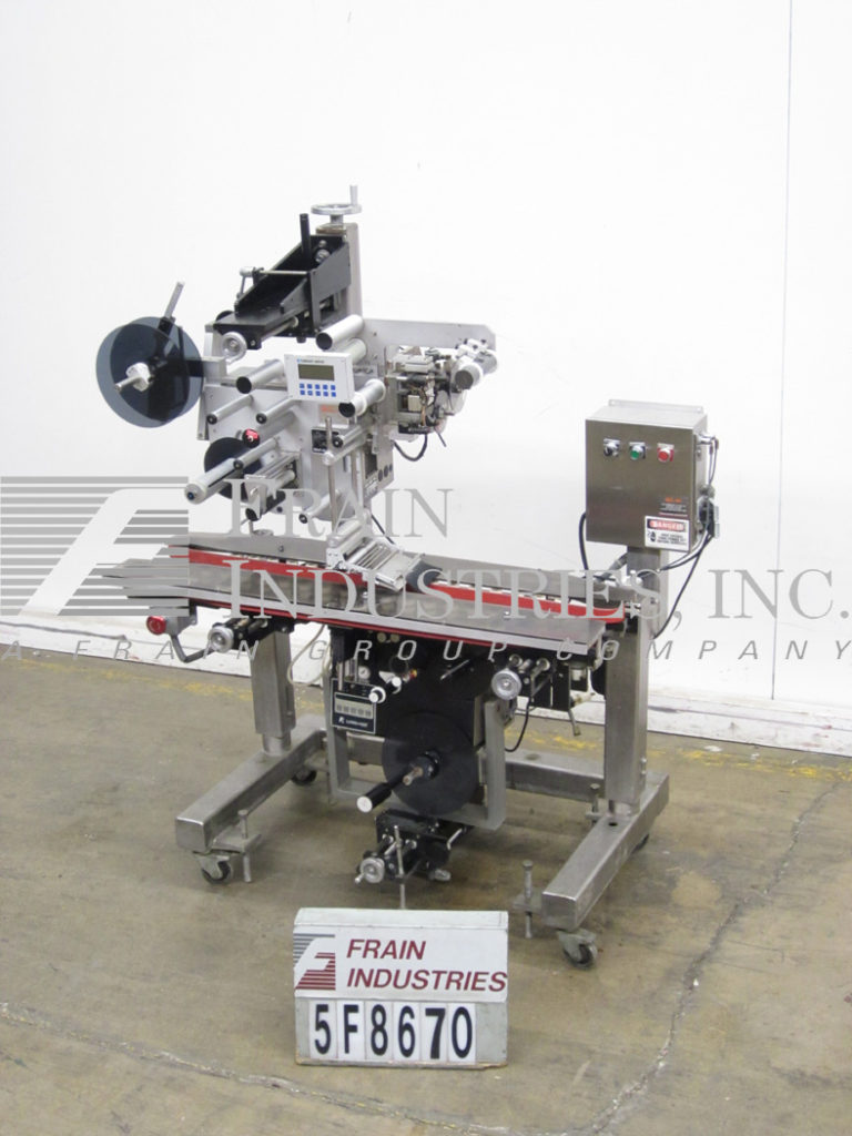 双标签艾尔型号3114,压力敏感,现货夯实在即,防篡改标签系统。从每分钟600至1500线性英寸产品的数目额定 - 根据材料和应用。配备有(2)旋转地安装托架标签头,12" OD标签卷和7" OD供电标签倒带,(2)1" 宽×14" 长的塔顶产物压紧带(2)侧辊折叠围绕拐角标签。步进驱动的具有用数字显示触摸板控制器和STATIS光条。安装在8" 宽×165" 长带带脚轮输送机。