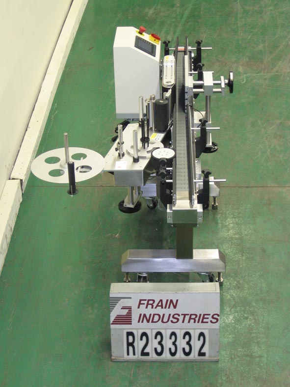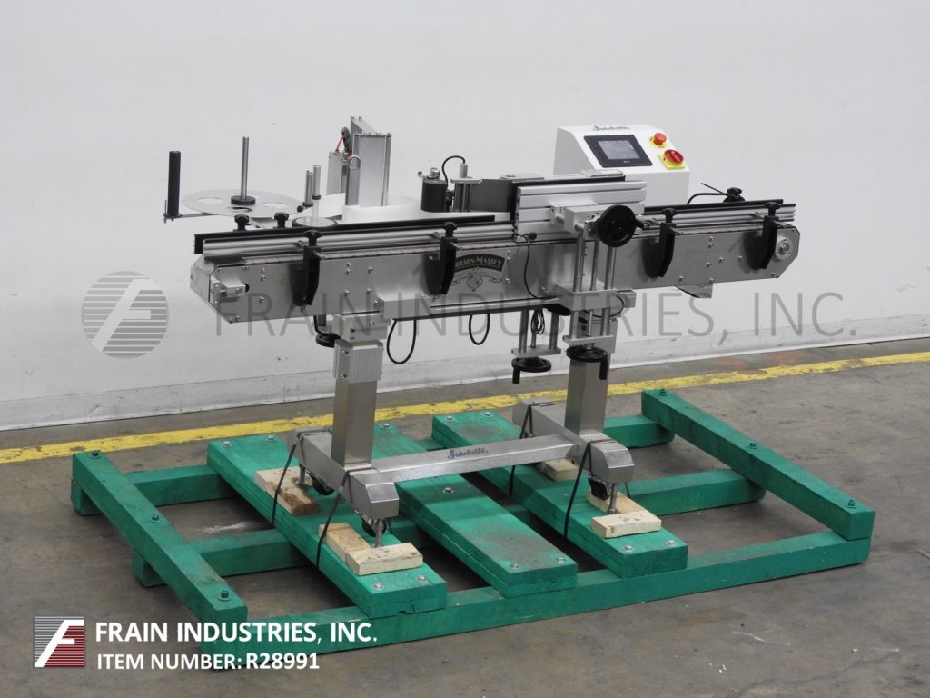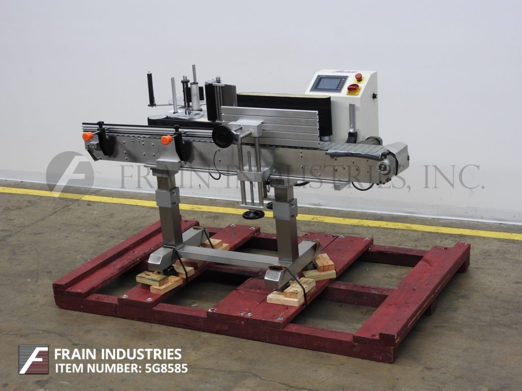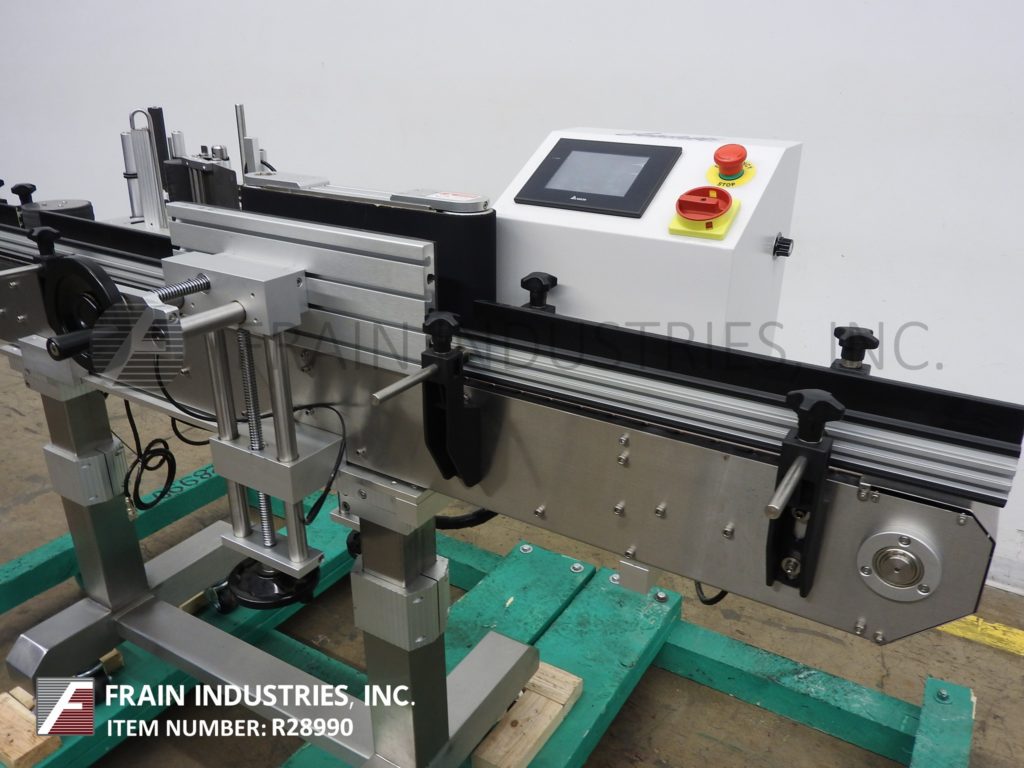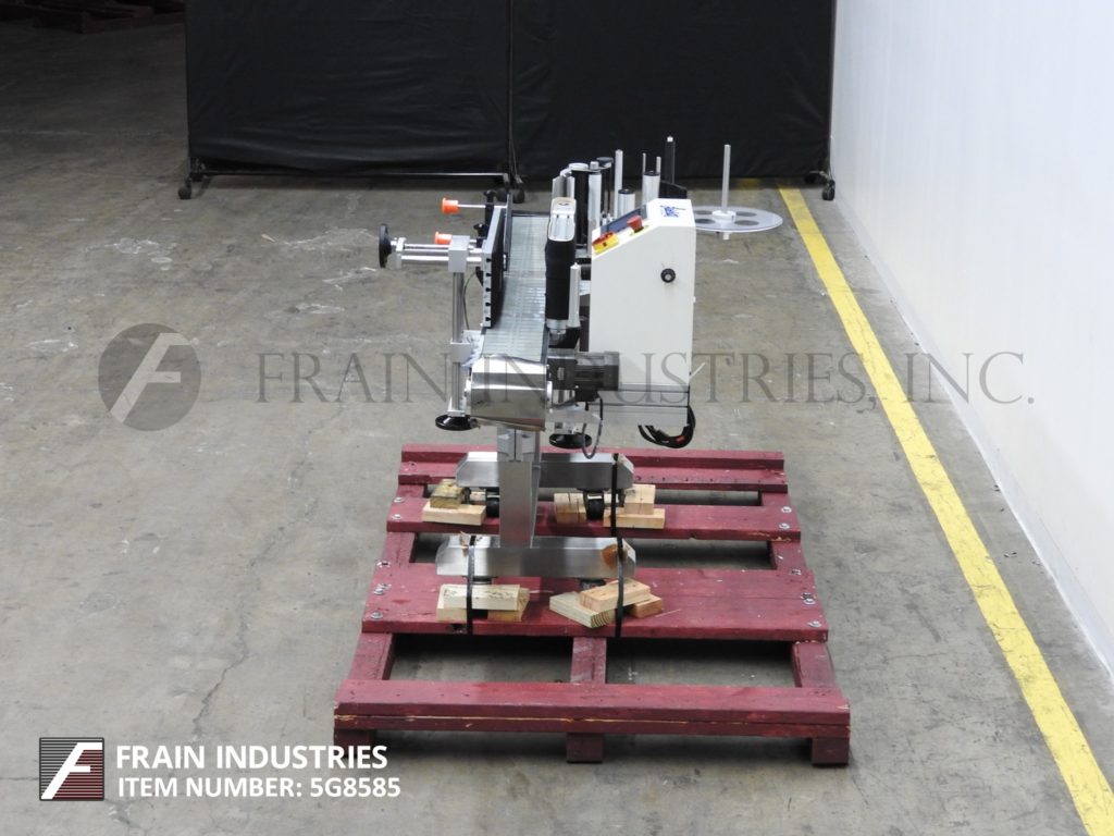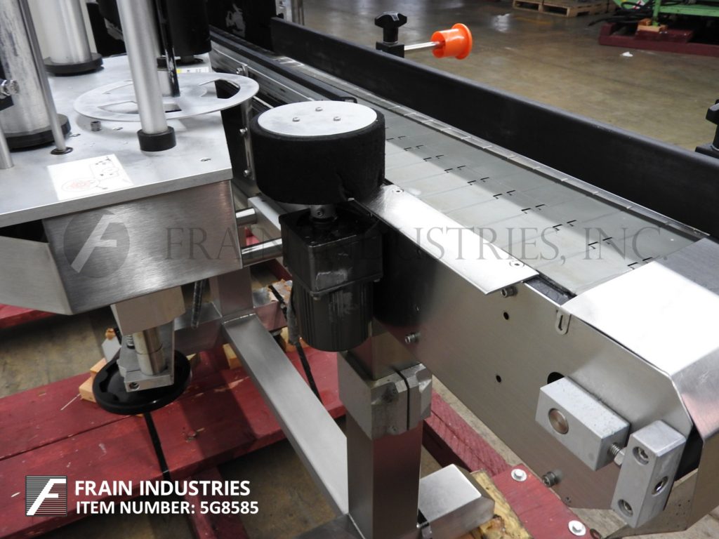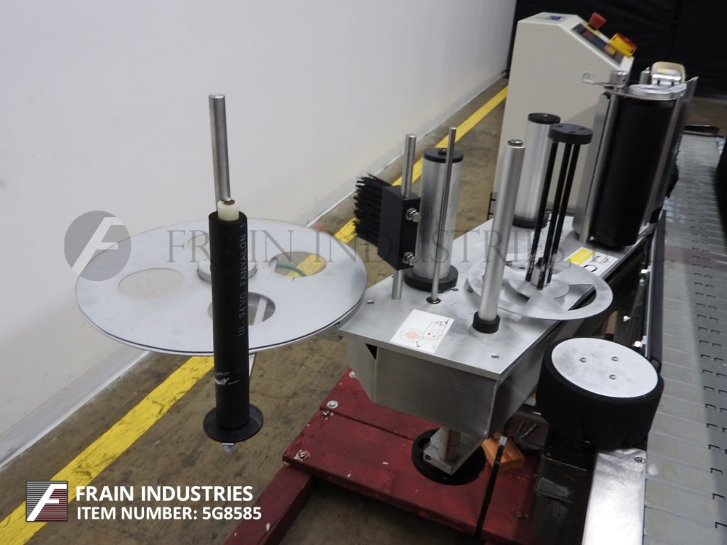 自动,内联,压敏包装标签,速度可达175cpm(取决于容器直径,标签长度)。”标签的尺寸范围:(0.5 - 11“L) x(3/4”- 6”W)和容器的尺寸范围:(7/8 - 4 3/8“dia)(14“H)。有一个(84 L x 6 W)塑料德隆链产品输送机与产品分离器轮,和(17“L x 6 1/2 " H)包装。触摸屏控制器,步进电机驱动,动力辅助标签卷筒纸,8个速度选择,有e-stop开关按钮,安装在焊接不锈钢管架上。