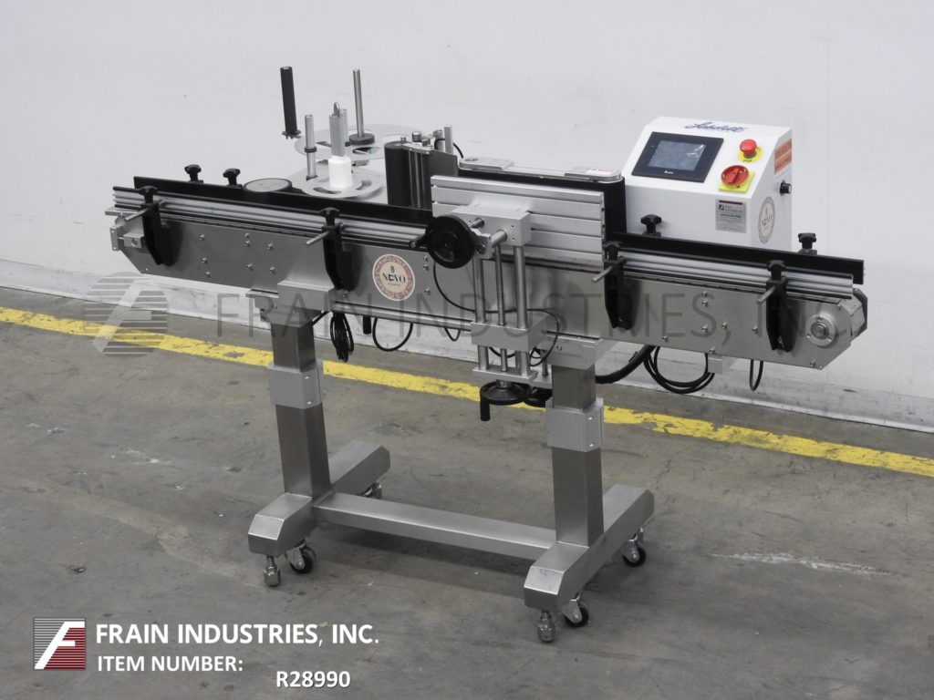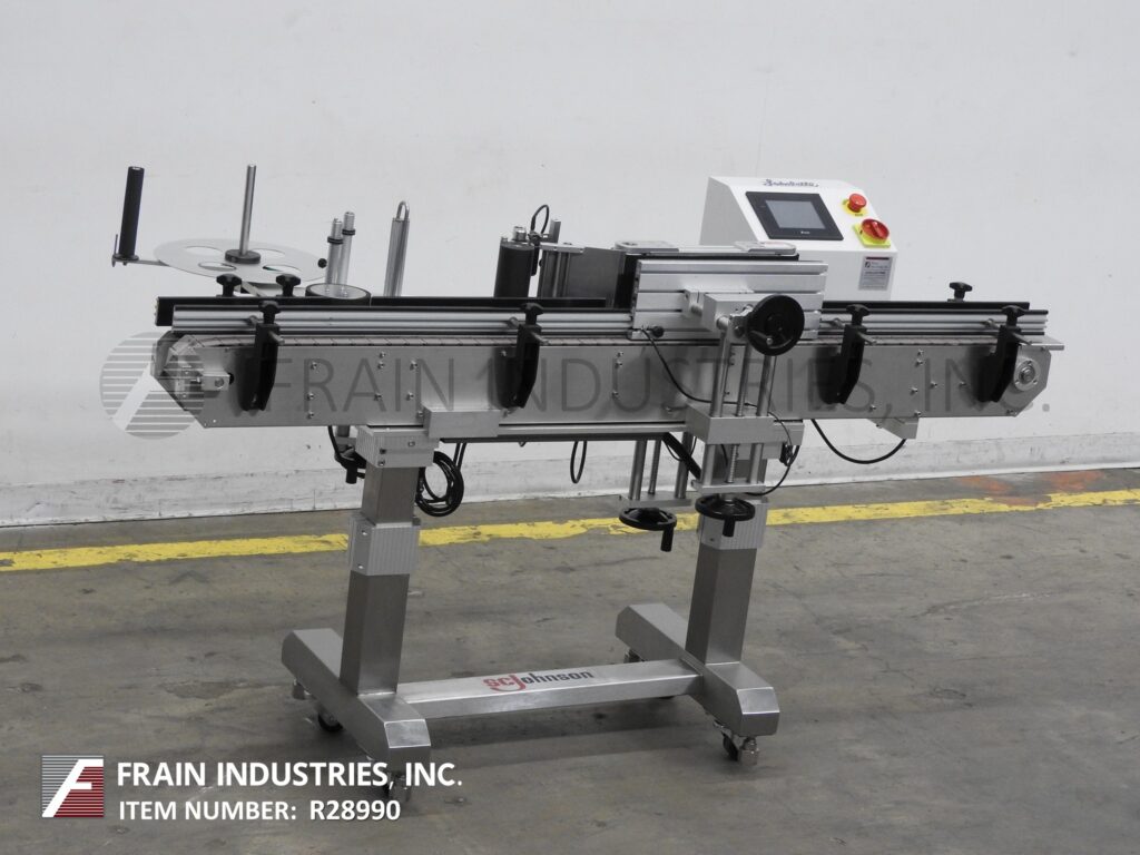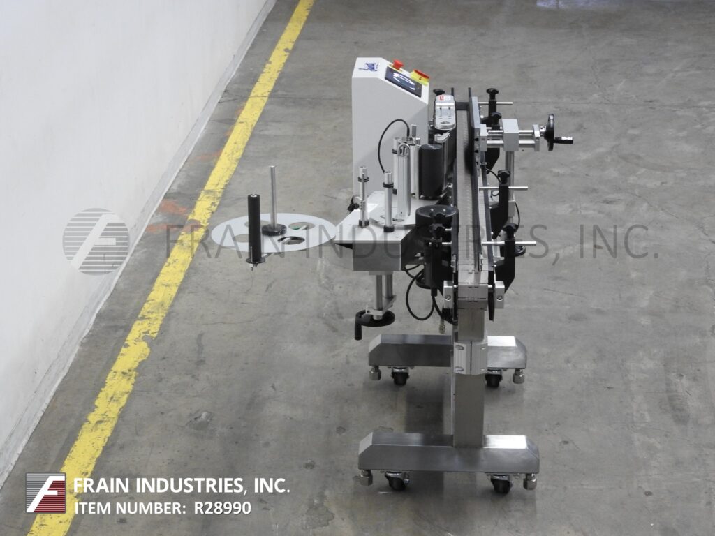 标签,型号24-APS-108,自动,在线不锈钢,压力敏感,步进驱动包装标签。额定20至175个集装箱每分钟-取决于材料,应用和机器配置。标签尺寸范围:½“至11”长度;3 / 4“到8”的高度。容器尺寸:(7/8)“到直径6¼”。配备72"长x 6"宽德龙输送机可调节导轨,间隔轮,9"高标签剥皮板和22"长x 9"高皮带包装站。触摸屏控制器,具有读数和E-stop功能。安装在带脚轮的不锈钢底座上。标签卷:14"外径3"芯。