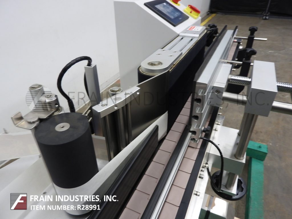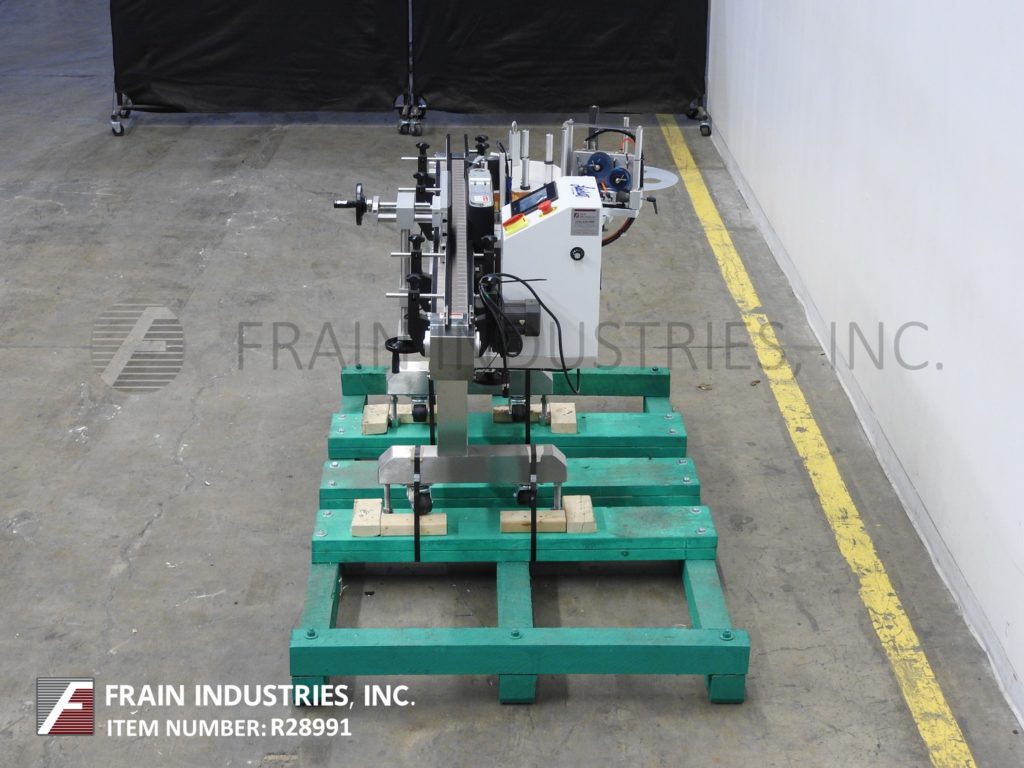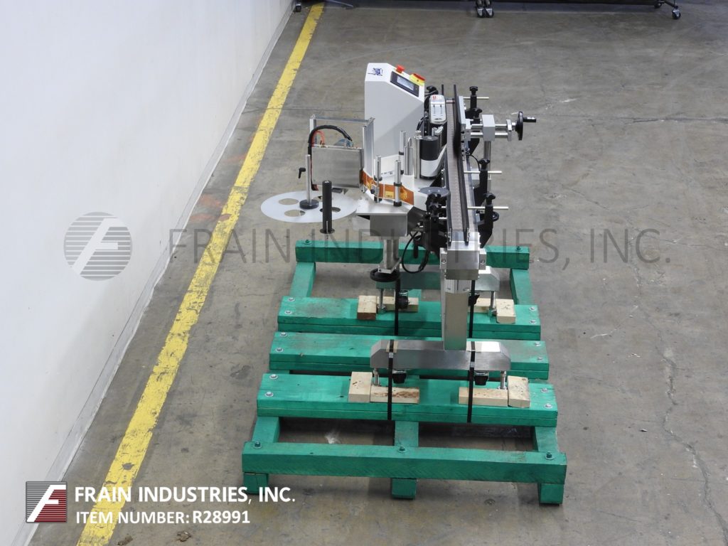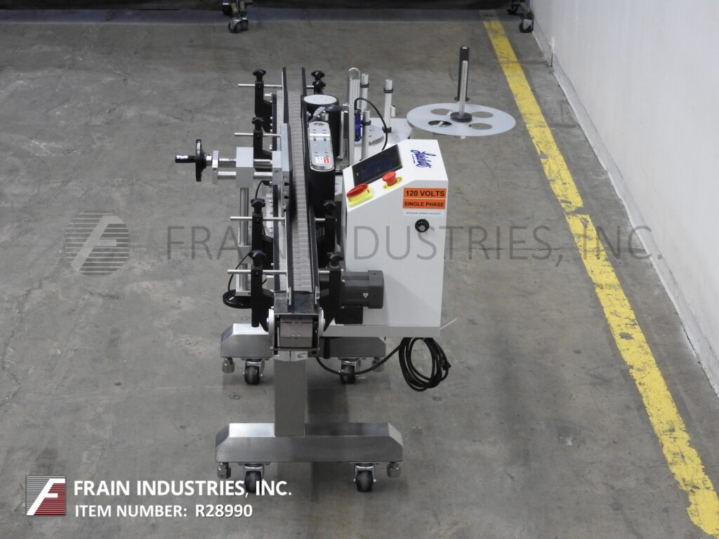自动,内联,压敏包装标签。标签尺寸范围:0.5"至11"长度;3/4“到6”的宽度。配备84" L x 6" W德龙输送机,产品分离器轮和一个17" L x 6 1/2" H包装站。触摸屏控制器,步进电机驱动,动力辅助标签卷筒纸,8个速度选择,有e-stop开关按钮,安装在焊接不锈钢管架上。速度取决于材料,应用和机器配置。