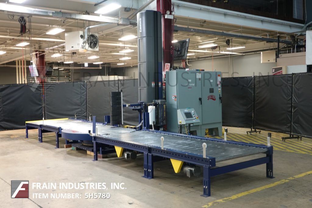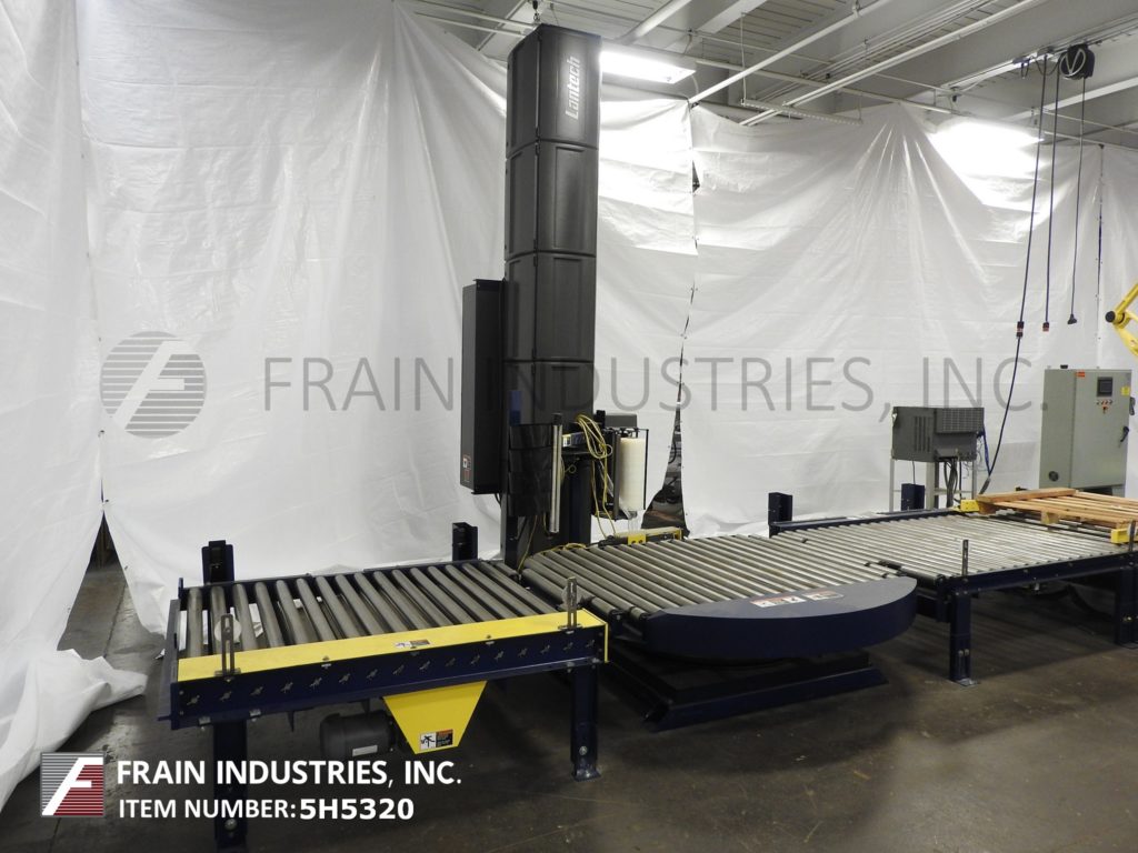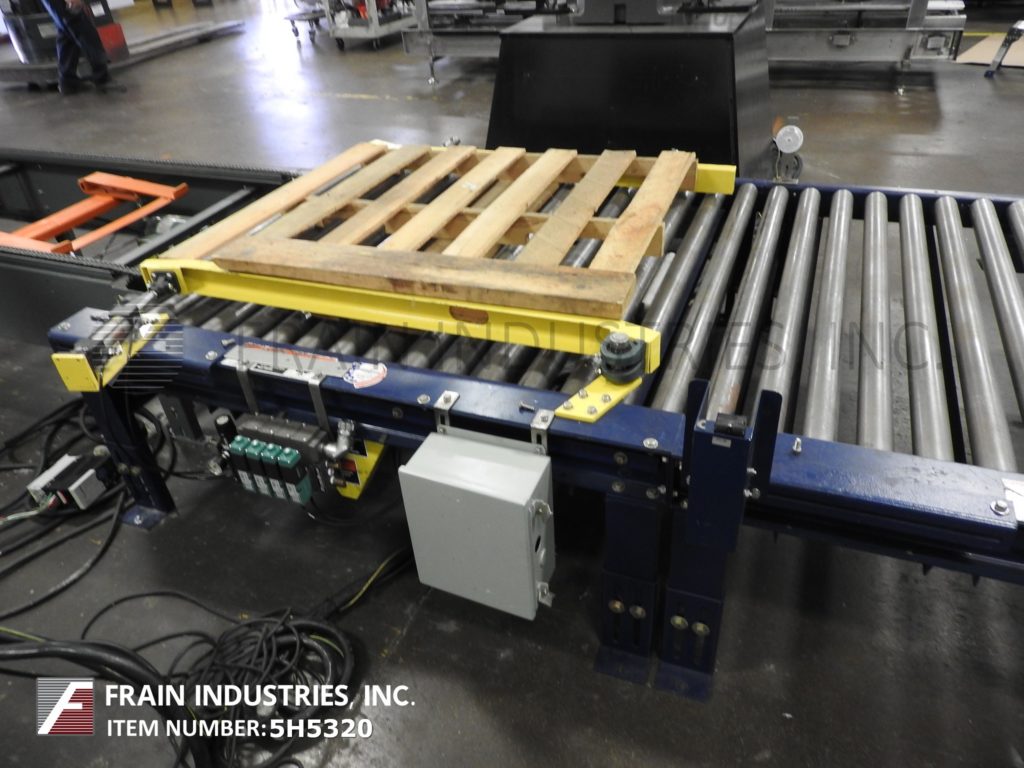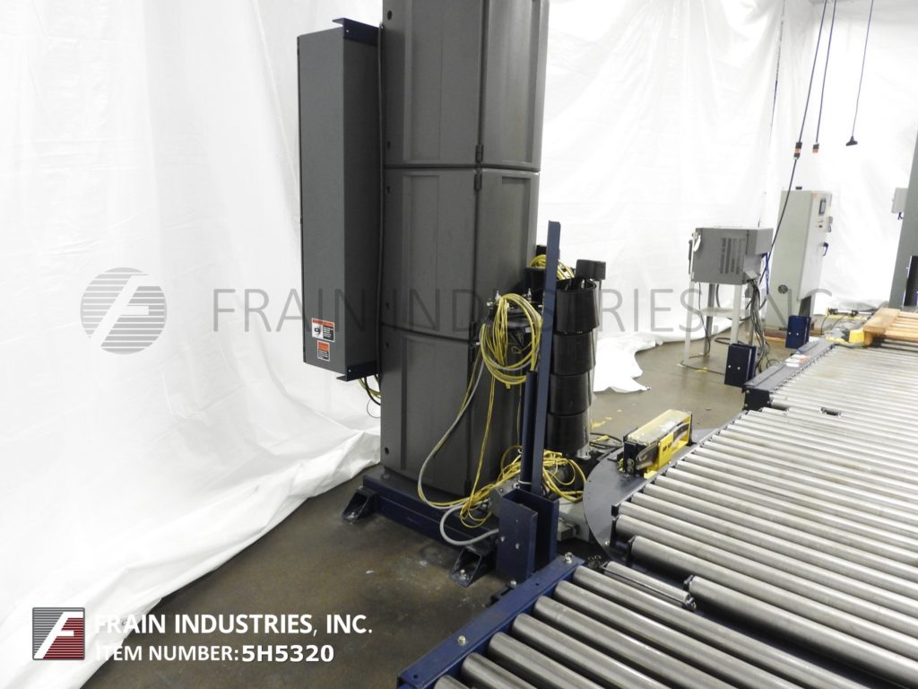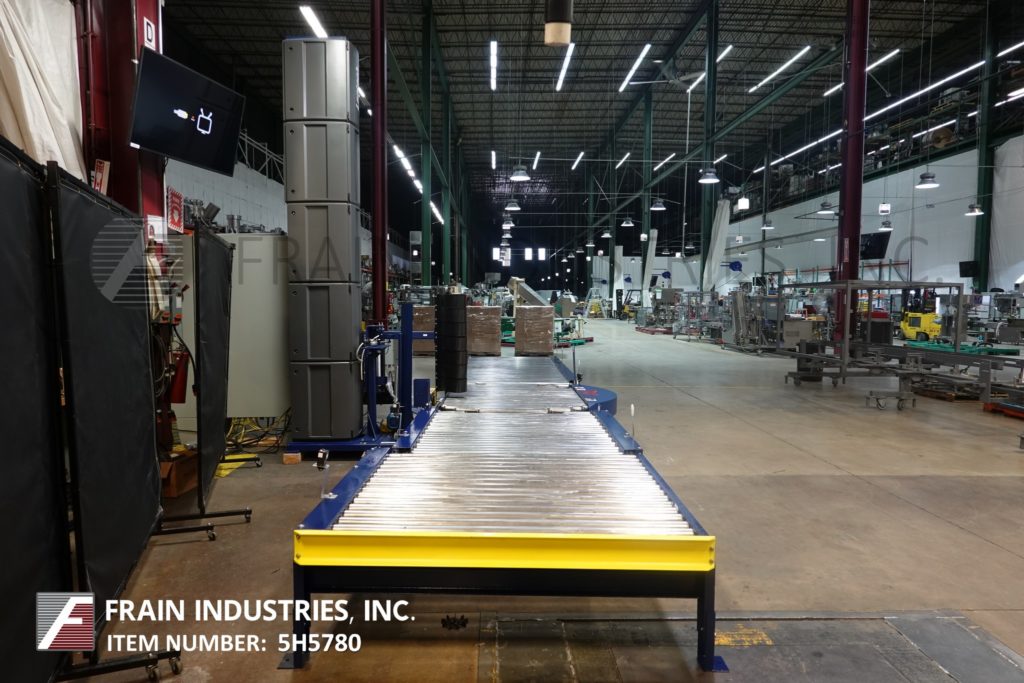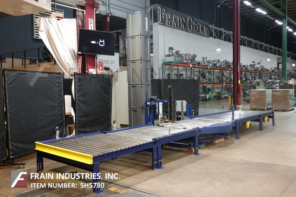 Lantech, Q1000型,自动,柱式拉伸包装机。额定负载为每小时10至45 -取决于材料,应用,环境和机器配置。可以处理36"至54"长度的负载;宽度36"至48";24"至130"高度,最大载重量4000磅。配备80"直径辊子转盘52"长x 2½"外径辊子设置在4"中心1½"间隙,辊子架E-Z螺纹20"宽x 10"外径薄膜辊,热刀切断,擦拭站和笼式安全防护。柱安装的控制面板与包装力,转盘和滚轮马车速度控制刻度盘,与启动和e-stop按钮。(2) 5 '段动力在进料和出料辊输送机52"长x 2½"外径辊设置在4"中心1½"间隙。