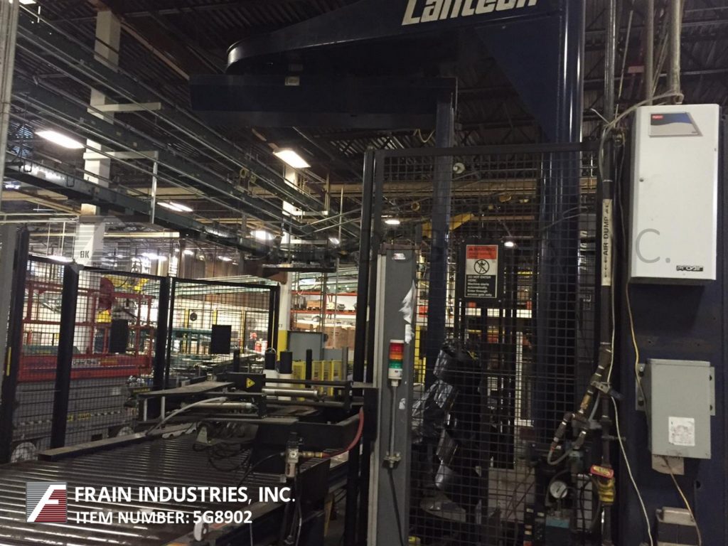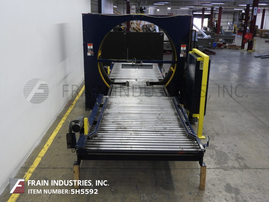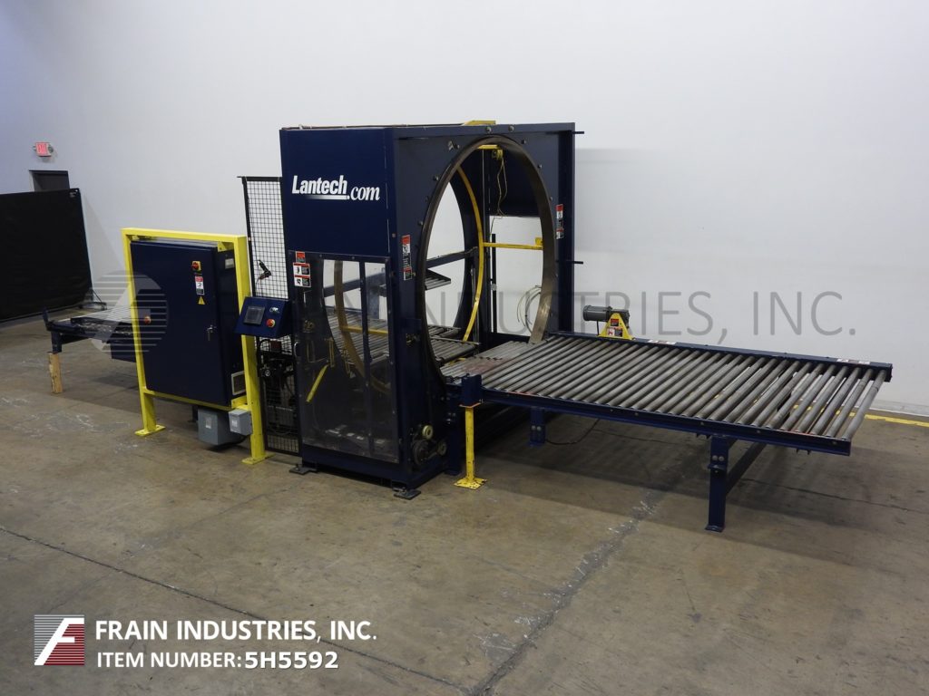 Lantech型号LR9000系列lan-ringer,自动,连续运动,轨道拉伸包装纸,每小时产品数量,具体取决于材料和应用。配备了90英寸的总和82英寸可用的OD环形环截面,旋转速度高达25 rpm,并且具有20英寸宽的胶片滚动至10英寸的OD,其胶片胶片预脱毛前标准标准为150%,最小产品长度为24”。安装在重型框架上,(2)部分为84“长x 62”宽x 32“高功率滚子输送机(1),用于饲料,(1)用于排放,带有54英寸长x 2-1/4” OD滚筒设置在3英寸的中心,并有1/2英寸的差距