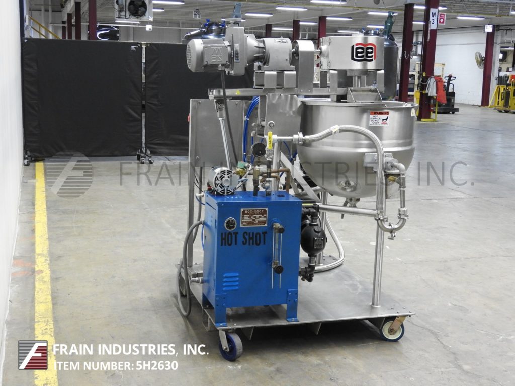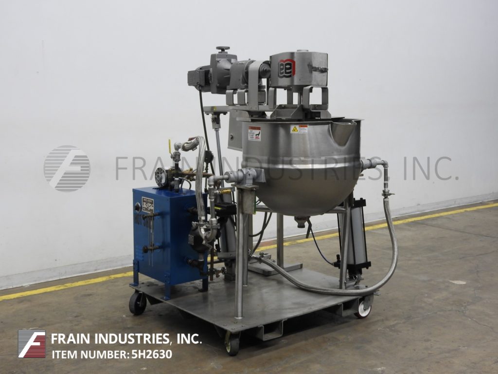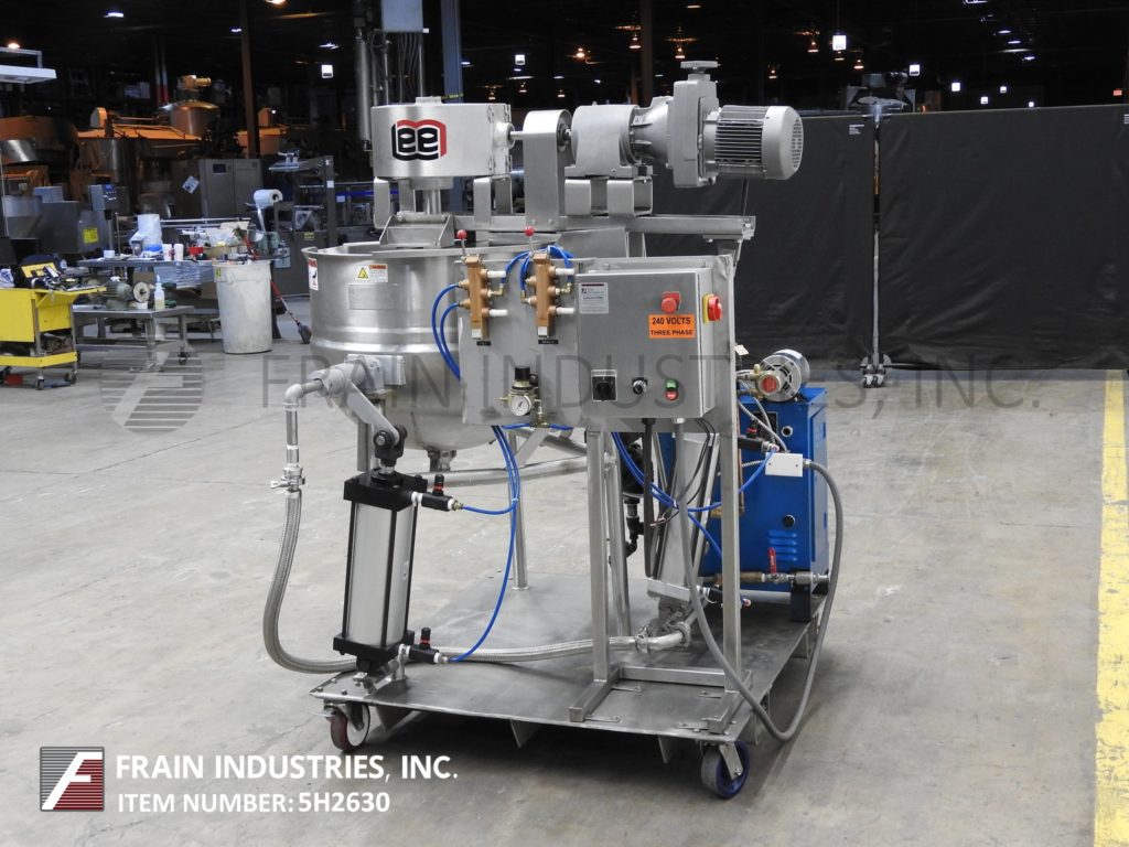 李,50CHD9MT型,50加仑,316不锈钢夹套双动水壶。容器尺寸:30"直径x 22"深与10"直壁。配备倾斜安装刮搅拌由2马力驱动器与变速变速箱,2"外径/ 1½"ID阀座斜角式底部卸料与球阀和20"地间隙和倾斜釜卸料。安装在一个48“x 48”涂有脚轮的基地。基地包括一个Sussman, MB-6型,“热射”6千瓦电锅炉。