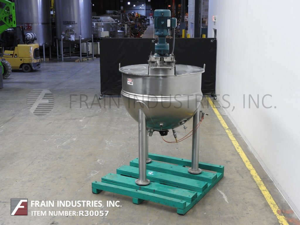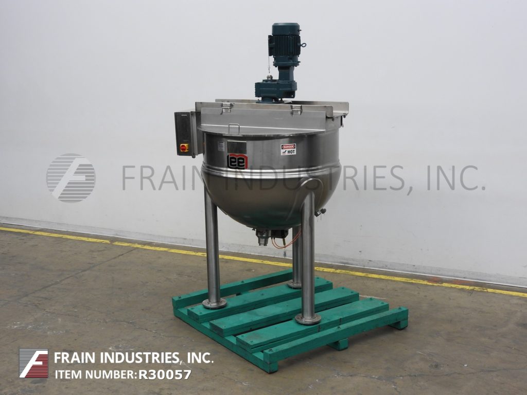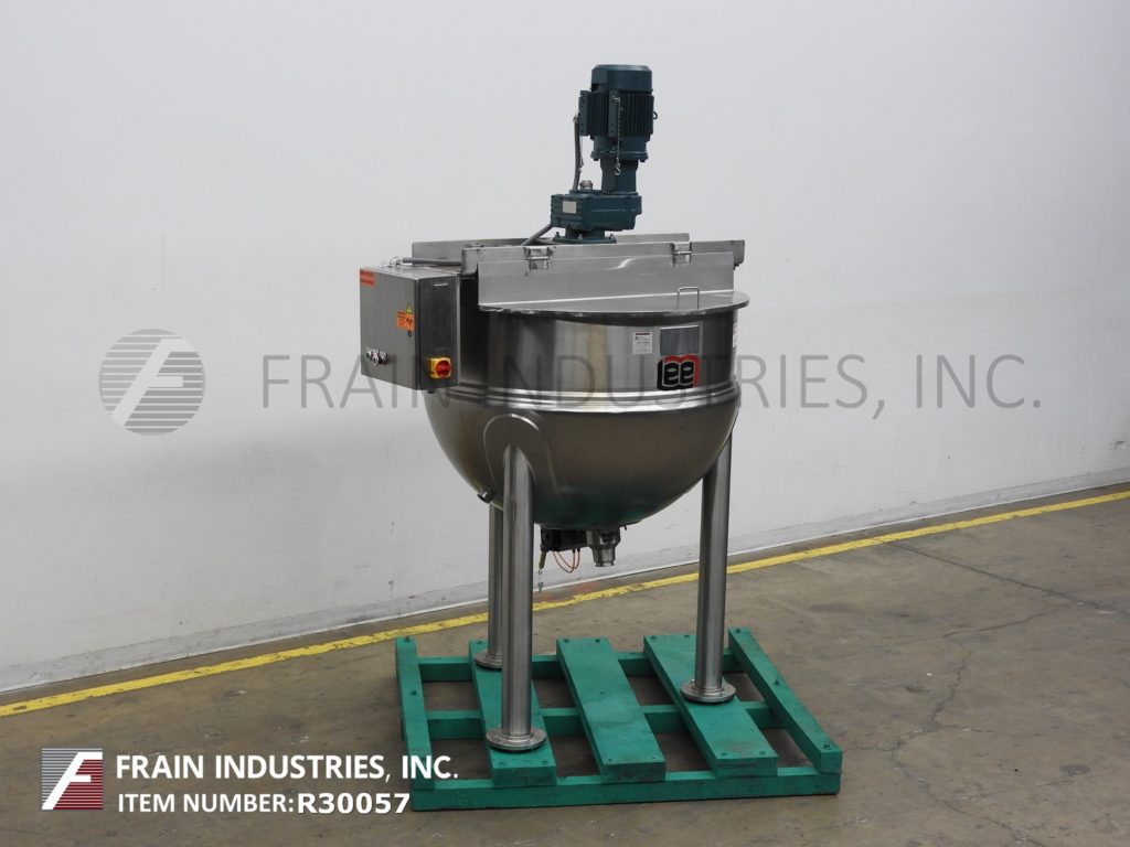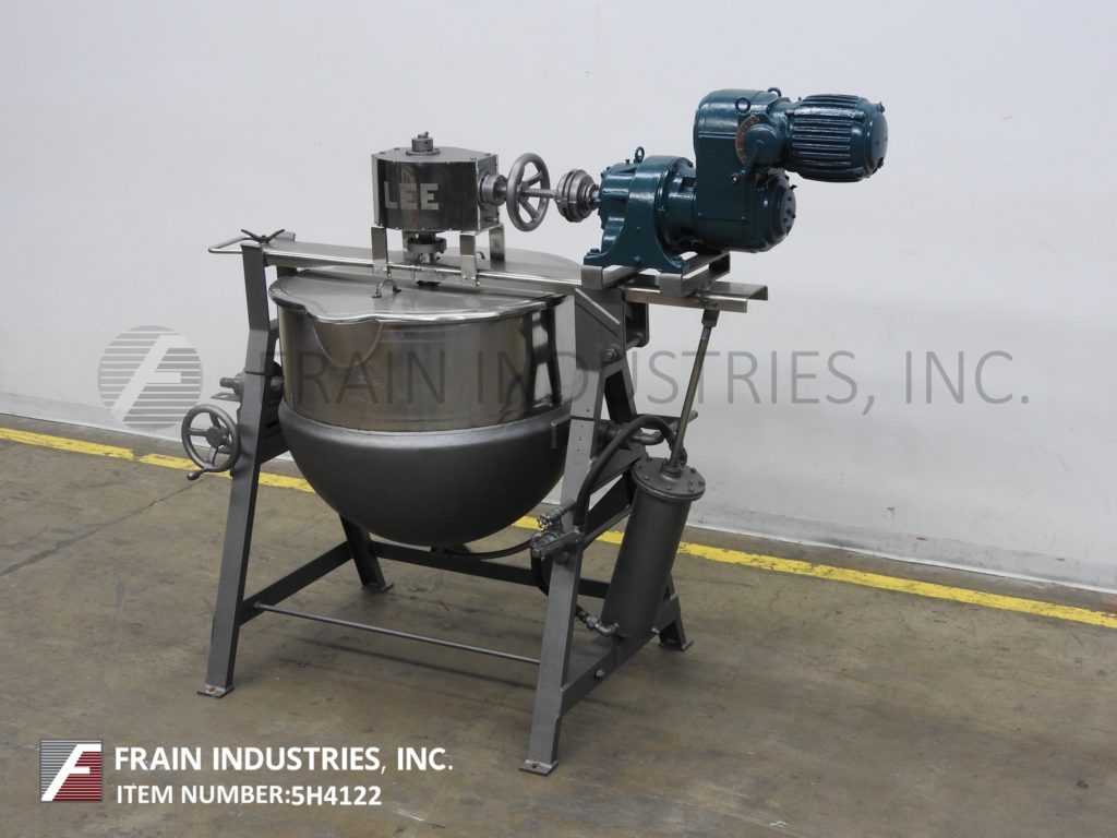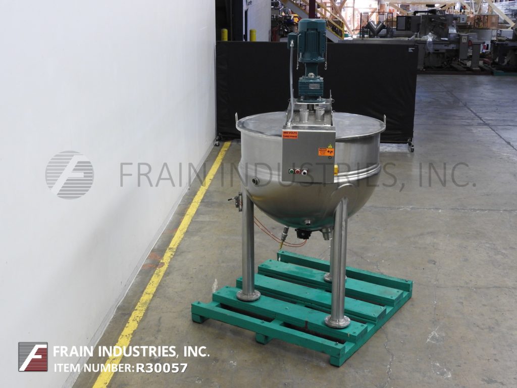 Lee, 250D7S型,250加仑304不锈钢夹套水壶。容器尺寸:52"外径x 36"深,13"直壁。顶部桥架装有3马力双动刮面搅拌和翻盖。碟底有3½"外径/ 2" ID三夹式放电与18"地间隙。