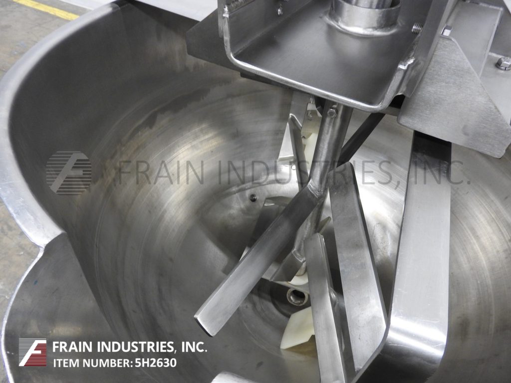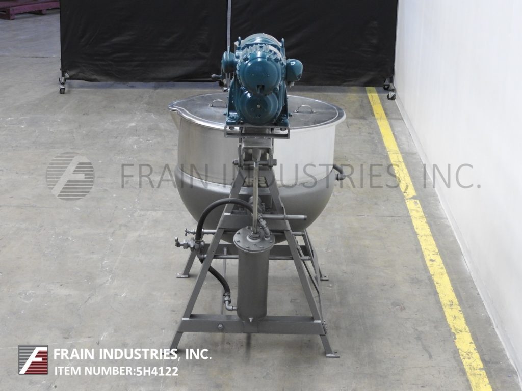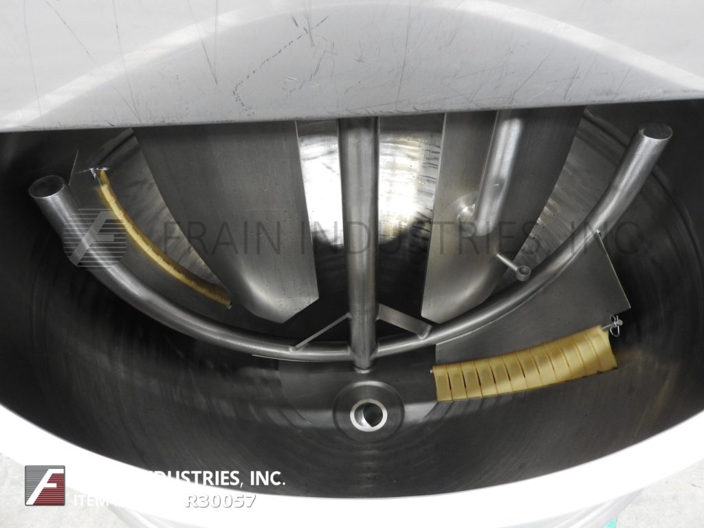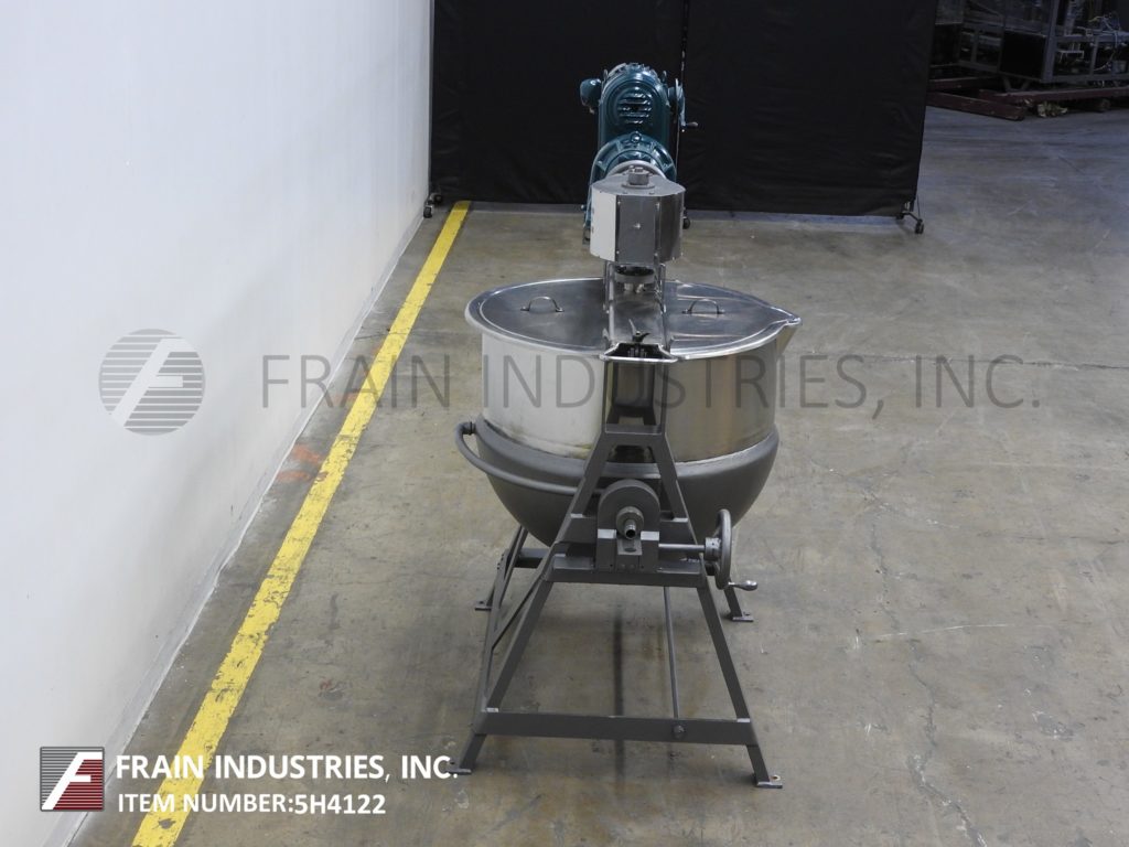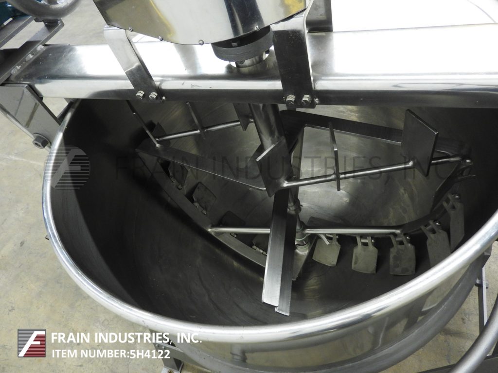 Lee, 250D7S型,250加仑304不锈钢夹套水壶。容器尺寸:52"外径x 36"深,13"直壁。顶部桥架装有3马力双动刮面搅拌和翻盖。碟底有3½"外径/ 2" ID三夹式放电与18"地间隙。