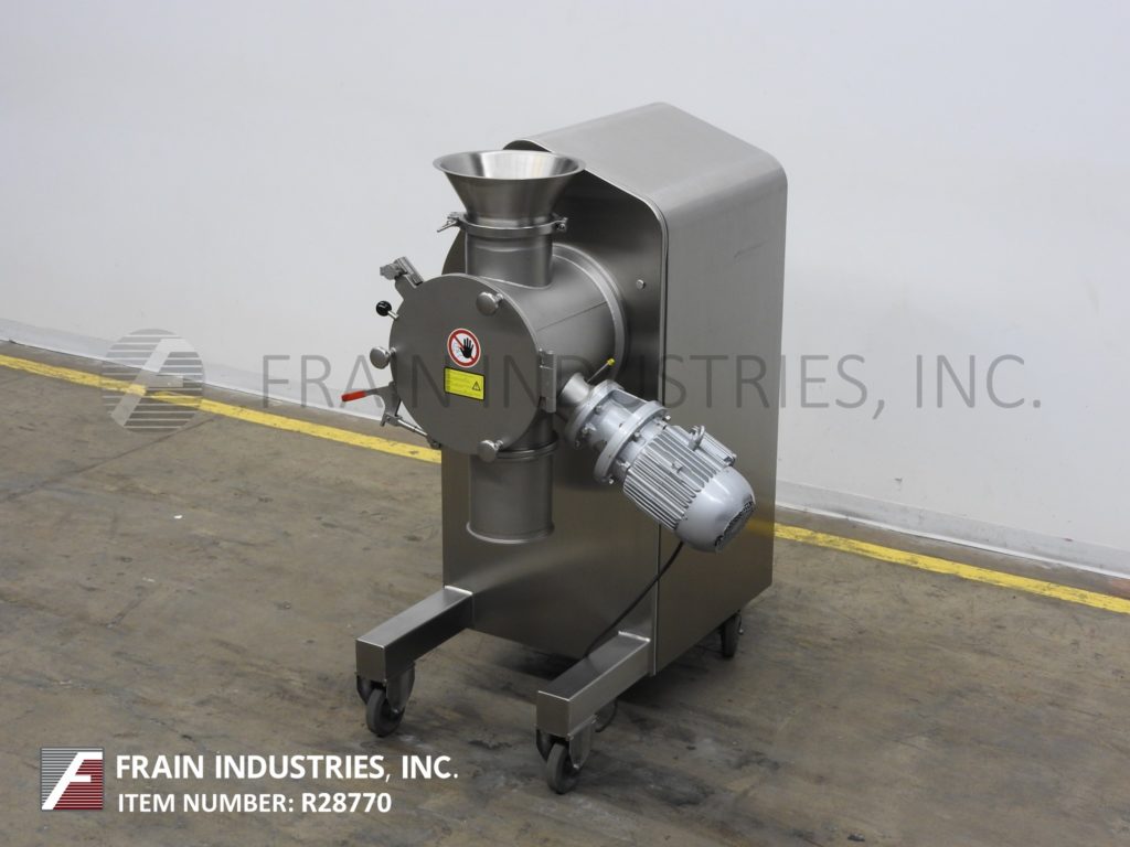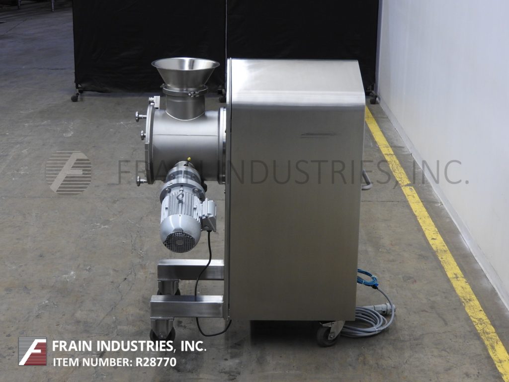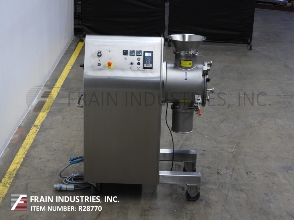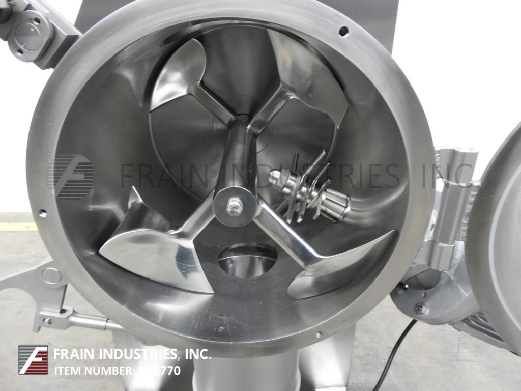 Lodige, Model L50, 50 Liter ( 1¾ ft³), 316 stainless steel mixer. Chamber dimensions: 15¾" diameter x 15¾" long. Equipped with (4) plows on 2" diameter shaft powered by a 5.3 Hp motor, 7" diameter (12) blade chopper with 5.3 Hp drive, front mounted bolt down access door, 13" diameter x 7" deep conical charge hopper and 9" OD / 8¼" ID Tri-clamp center bottom discharge with flush mounted flow valve and 25½" ground clearance. Control panel with push button start / stop and variable speed controls. Mounted on stainless steel frame with casters.