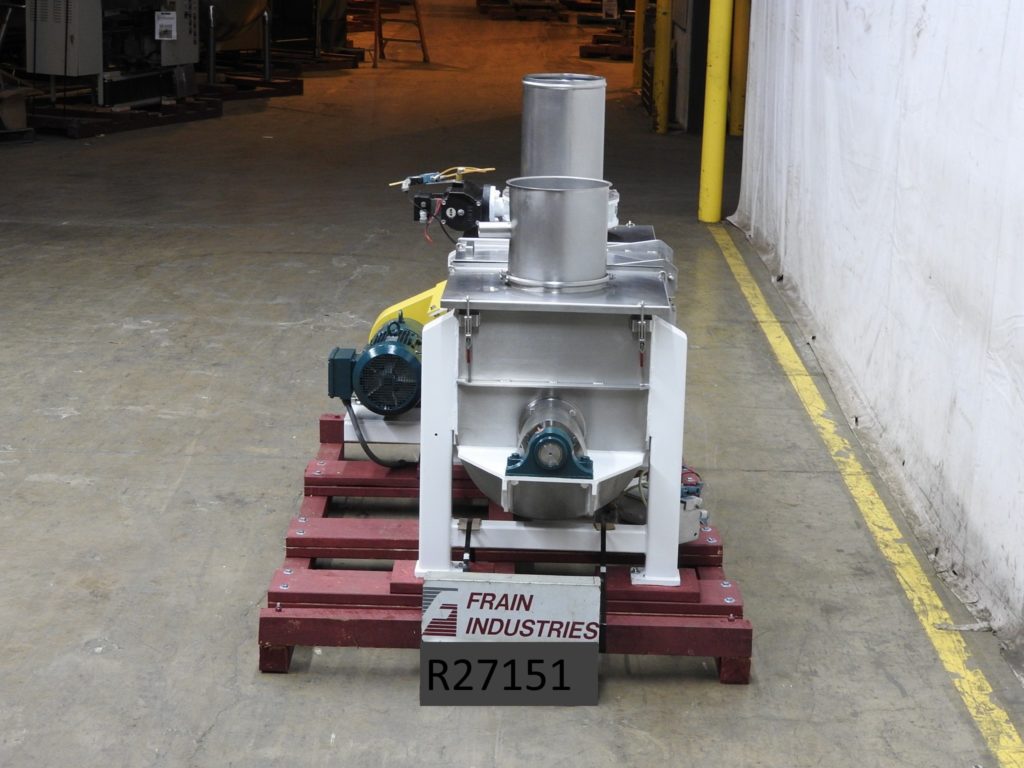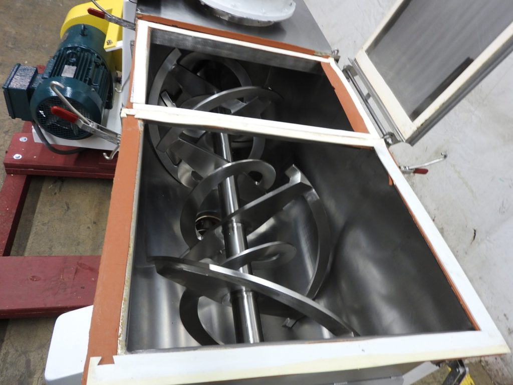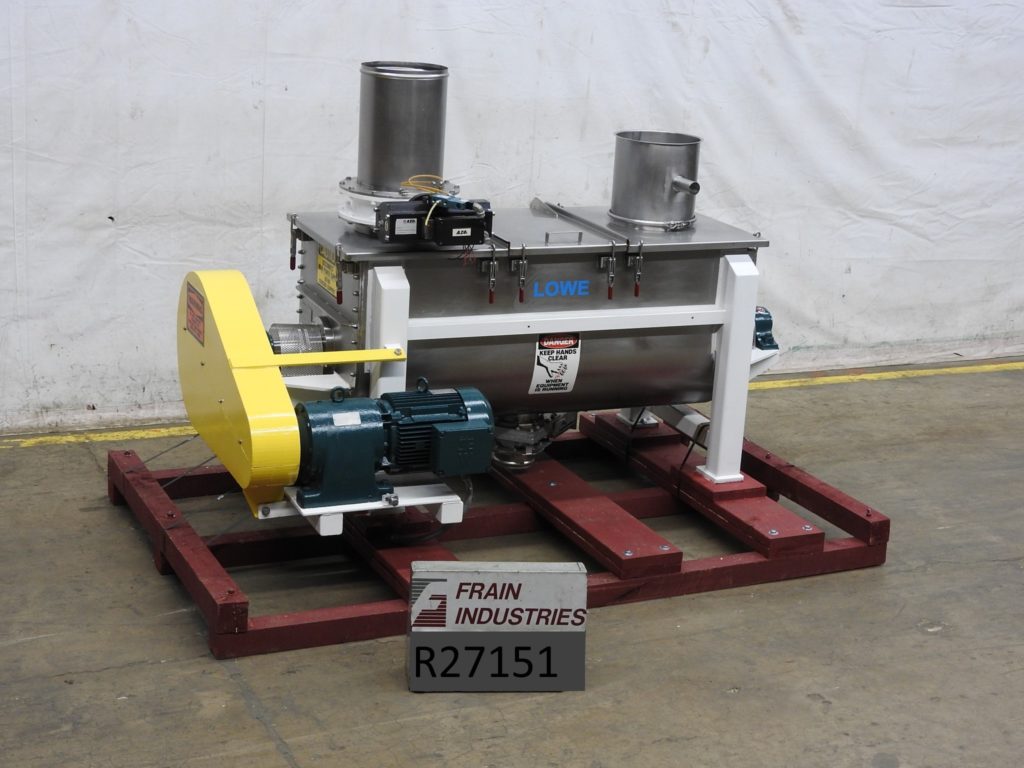 劳氏,型号C-16, 20立方英尺(16立方英尺可行),双带搅拌机,304不锈钢接触部件。内搅拌室尺寸:60英寸长;24“宽;26”的深度。配备(3)节翻盖,12“直径充电端口气动蝶阀,12“直径打开vent, 2½“直径电机轴,3“直径搅拌轴1½“宽x½“厚(外)和2“宽x¼”厚(内)不锈钢带。6英寸直径中心底部卸料带气动滑阀,地板净空为0英寸。动力由一个10马力的马达和安装在低碳钢(4)腿基础框架