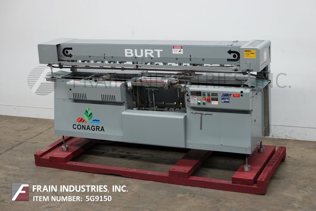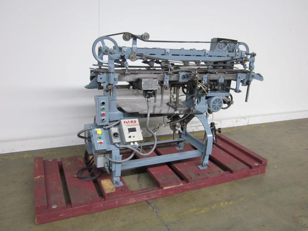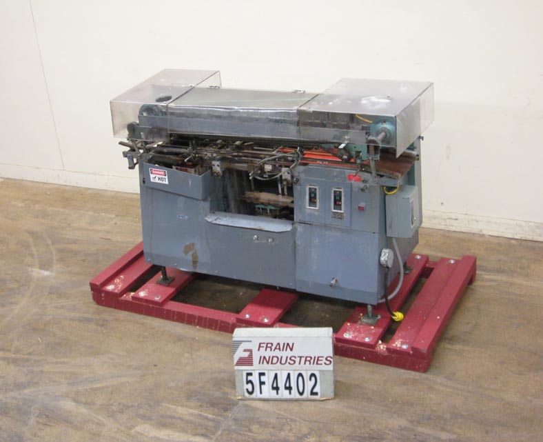 Mateer Burt AU404自动,热胶包装标签。配备在饲料升降机,单皮带集装箱处理,标签杂志,热胶锅与手指应用器,手曲柄集装箱调整Valco lap密封系统。安装在高度可调的框架上。