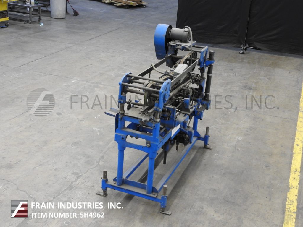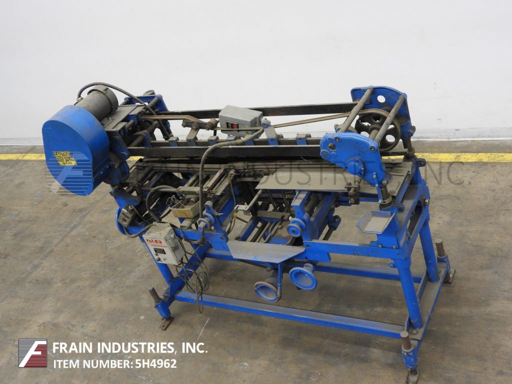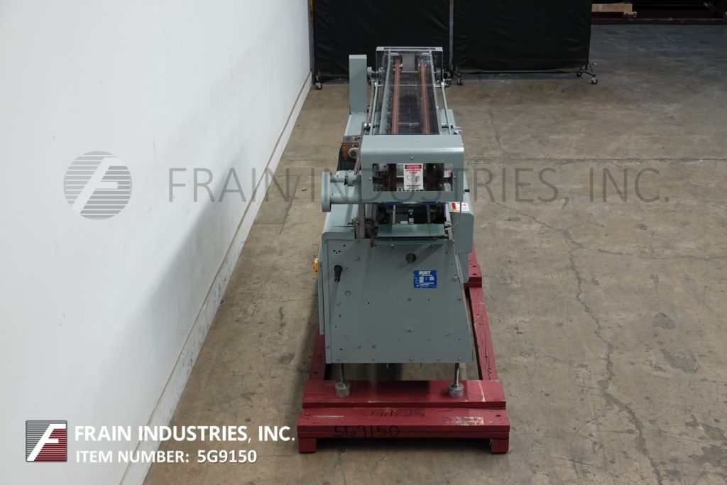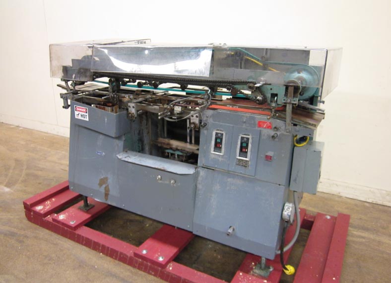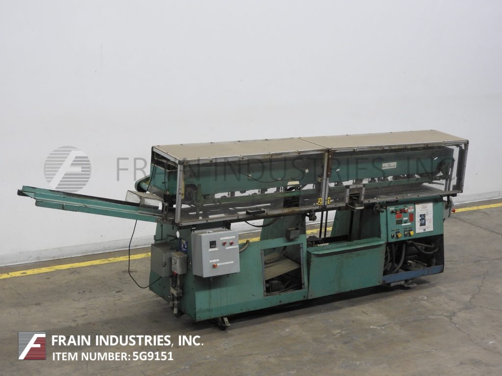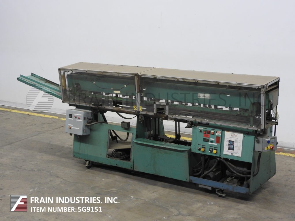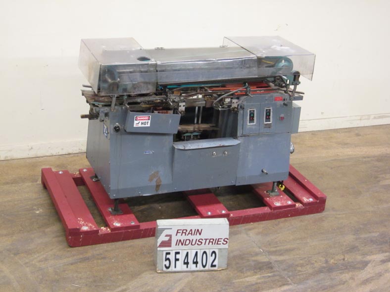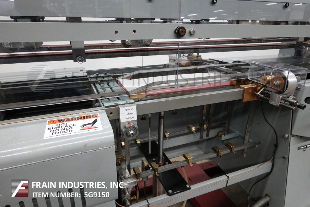 Mateer Burt,型号704D MK V,自动滚过胶标签。额定为每分钟10到600个容器-取决于材料,应用和机器配置。容器尺寸范围:1¾“到7¼”直径;1-9/16"到10½"的高度。标签尺寸范围:4-5/8"至24"长度;1¼“到9¼”宽度。配备电梯进给,双集装箱搬运夹持三角带,热胶锅与直接接触轮涂胶器,单液压标签进给杂志,无集装箱/无胶,启动/停止按钮控制。安装在基架上。专为应用全包胶标签的圆柱形容器的金属,塑料和玻璃(与适当的更换部分)。