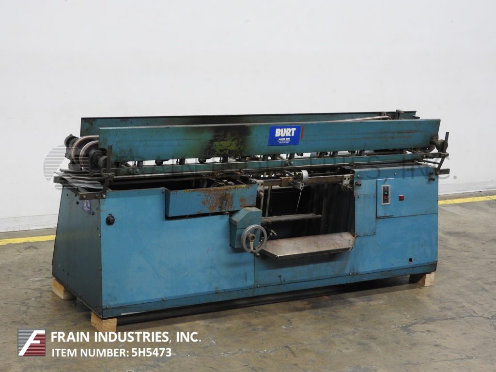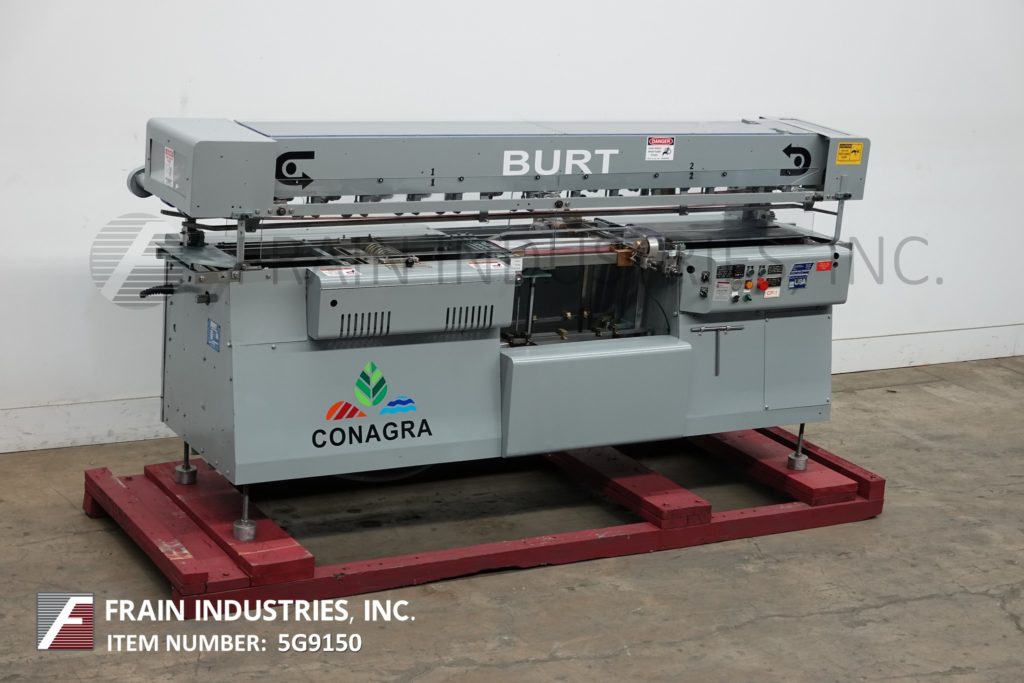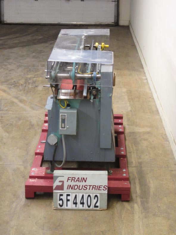 Mateer Burt,型号AU404自动,滚过,热胶包装标签。容器尺寸范围:1¾“到4½”直径;1(9/16)“至7½”的高度。标签尺寸范围:长度4-5/8"至15";1¼“到7”宽度。配备双皮带容器处理,机械标签杂志,热熔胶锅与涂胶器,热熔胶带搭接密封和手动曲柄容器调整。速度取决于材料,应用和机器配置。