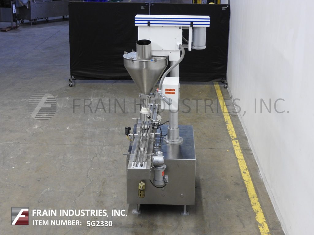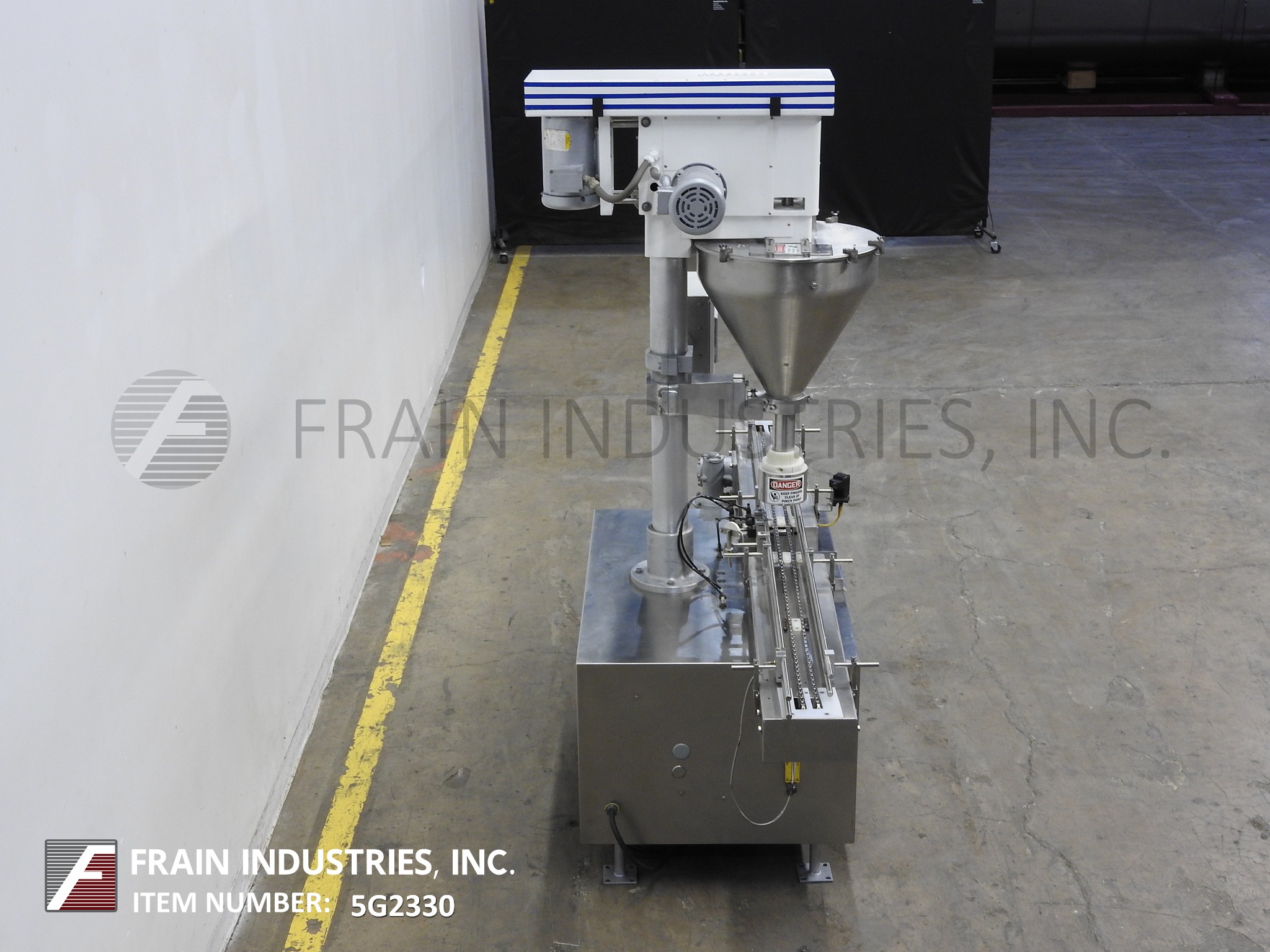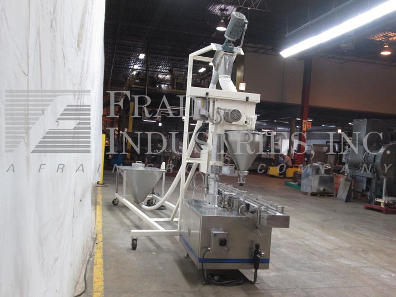 全自动不锈钢单头螺旋填料。可处理直径从1"到7"的容器。配有变速双滑链输送机,自下而上充填,产品沉降振动器。包括微集控制和318水平检测器。机组所有与产品接触的部件和橱柜均为不锈钢。料斗包括侧刮板,以防止产品桥接。速度取决于材料和应用。
