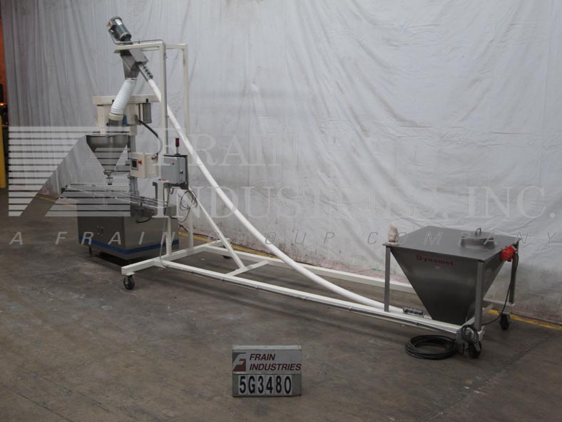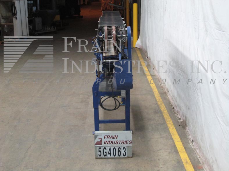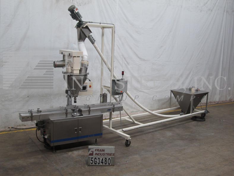 Mateer Burt Neotron, 3820型,单头,步进驱动螺旋填料。配备一个20"直径x 20"深不锈钢产品料斗与螺栓下防尘罩,7"外径产品在饲料溜槽和93"长x 2½"宽链输送机振动器,Bimba分度和密封手套箱在加注站连接到灰尘收集。控制面板有触摸板控制与数字读数,振动器速度拨号,传送带速度拨号和按钮启动/停止控制。安装在重型基础框架。速度取决于材料,应用和机器配置。