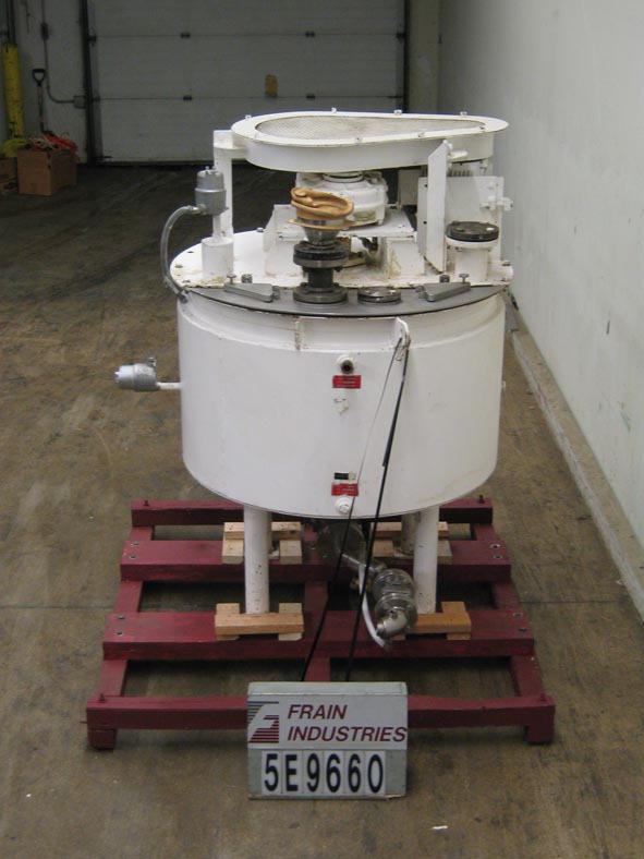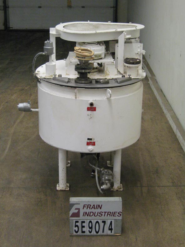麦卡特,1000磅,垂直,碳钢,全夹心巧克力融化和混合罐每小时的产品重量-取决于材料和应用。容器尺寸;45英寸直径x 24英寸直壁。配备平顶和螺栓下盖和桥安装双关闭设置扫描搅拌,(2)7-1/2"外径法兰顶部端口,(1)6"外径产品端口和另一个6"外径法兰顶部端口双翻转视图端口。全低压大气外壳,MAWP为15 psi,顶部和侧面安装温度探头,侧面温度计。碟底有7"外径法兰中心底部卸料与16"地板间隙,目前有7-1/2"外径法兰卸料附件与7"地板间隙。安装在(4)碳钢腿上。