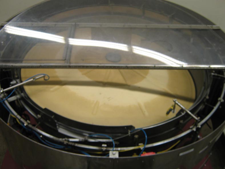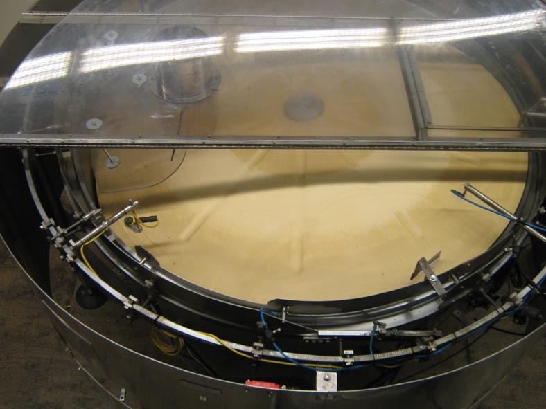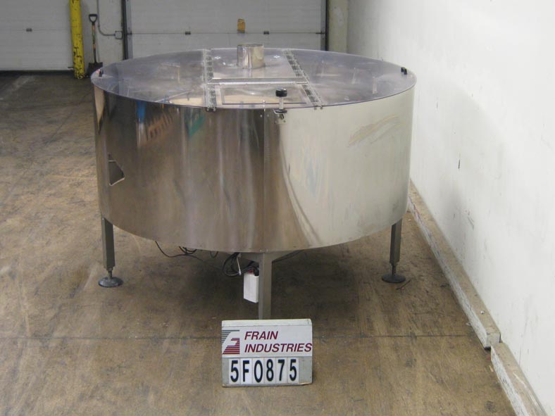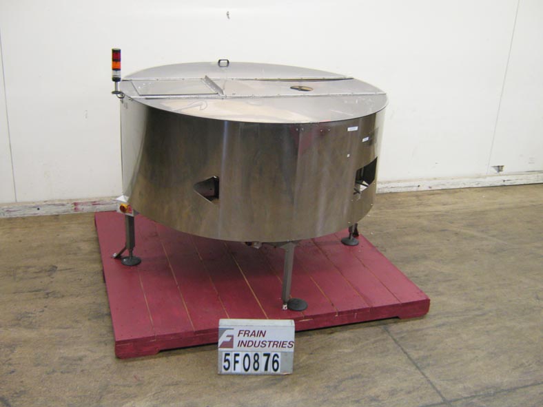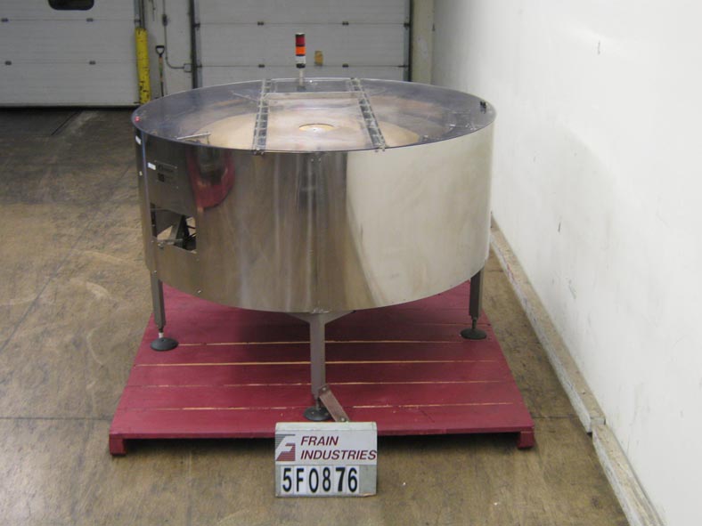 84“直径,不锈钢,碗送料器。配备塑料翻盖盖,8”直径入口和2“宽排放槽。安装在不锈钢架上,高度可调节腿。最后运行2盎司瓶装150瓶每分钟。