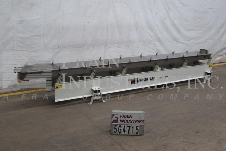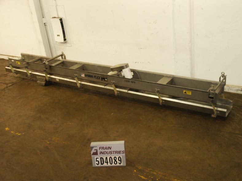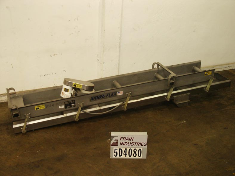 迈耶,VibraFlex VF11-12-6型振动输送机。配备12"W x 198"L不锈钢床与5½"高侧壁,8"直径充电端口,8"直径放电溜槽,21"放电高度,3 / 4马力驱动,控制面板上的开/关开关,不锈钢防尘盖。