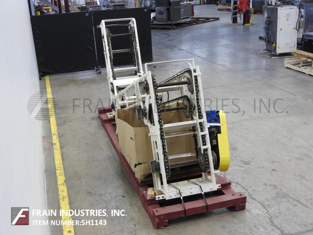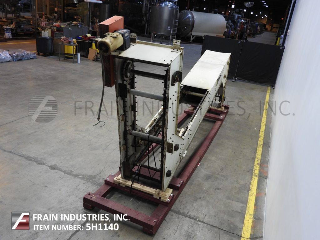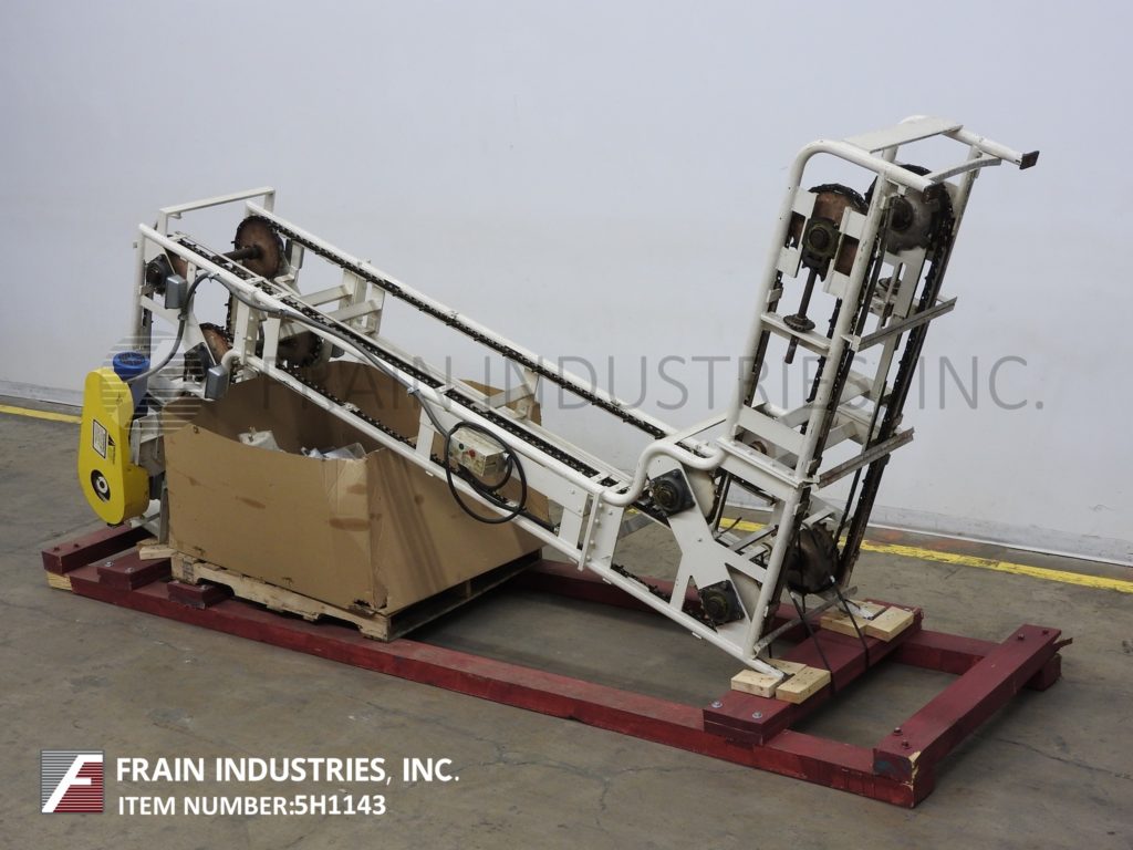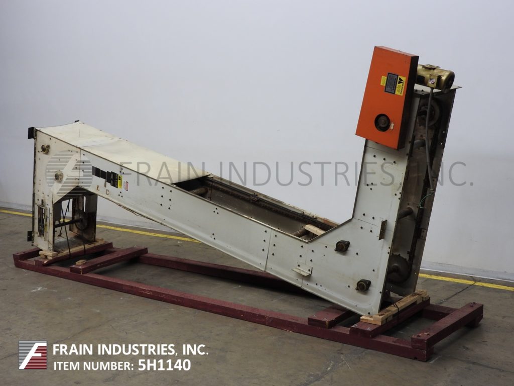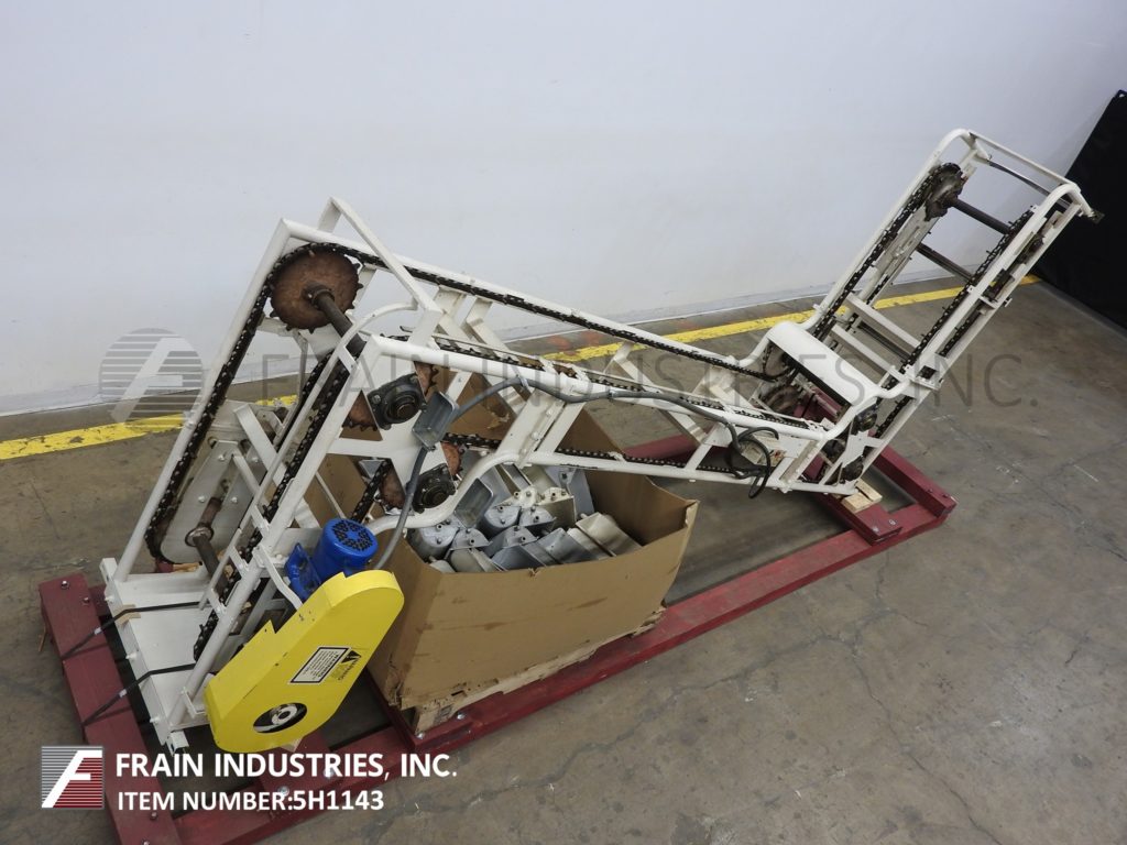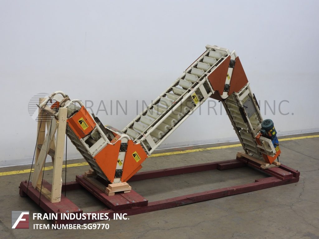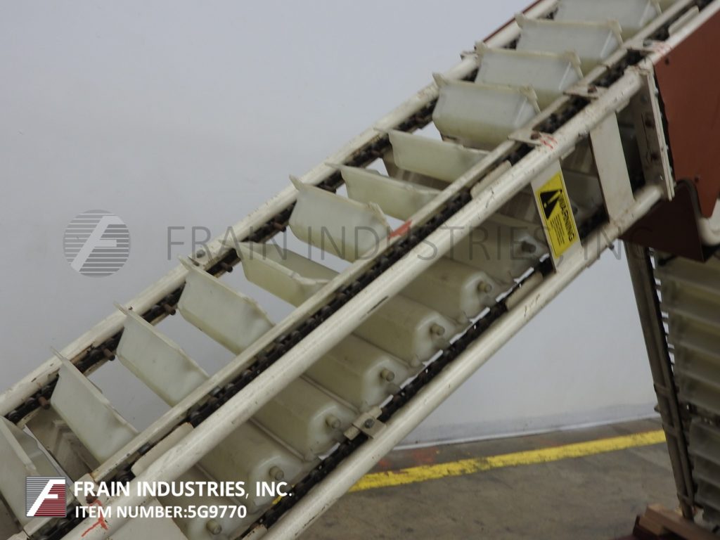 Meyer,型号PA45218S,Z样式桶电梯。每分钟产品的磅数-根据材料,应用和机器配置而定。配有白色塑料产品桶,内部尺寸为18英寸长x 5“宽x 2-3 / 4”深,具有79“长卧式楼层,饲料高度为30英寸,为182”垂直升降机,宽度为27“框架,到80“顶部水平顶部运行并具有开放式185”排放高度“。由1½HP顶部安装电机驱动器供电。