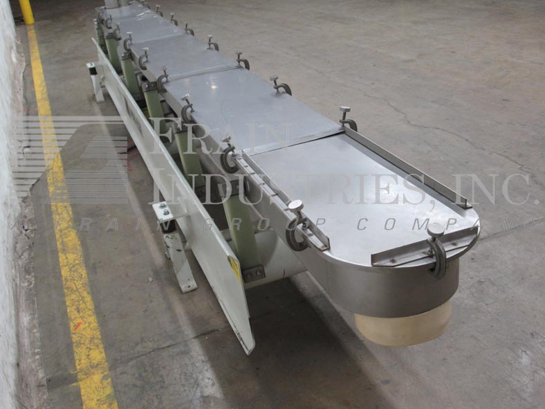 迈耶,不锈钢振动输送机。配备34英寸宽x 112英寸长床,2¾英寸侧壁。由1马力齿轮马达和A-B封闭式断开开关驱动的偏心振动器。45”高出料和51”高进料1/2”直径x 34”长水喷雾管。单元安装在一个69"长x 40"宽x 24"高不锈钢机架上。