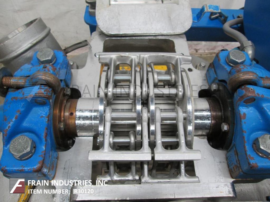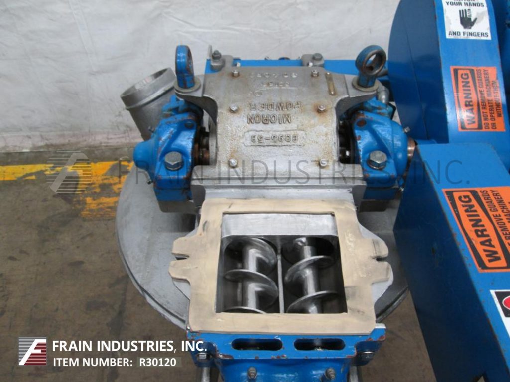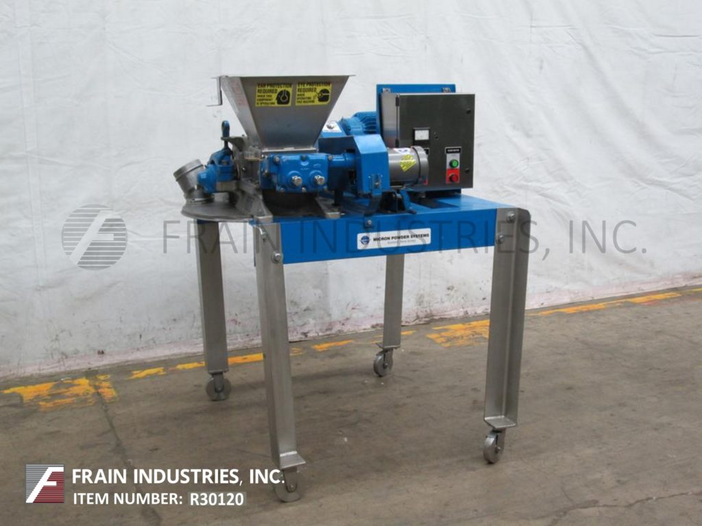 Micron型号Mikro 2DH,锤磨。配备不锈钢接触部件,16" x 16" x 13"深料斗,12"长x 3"双进给螺丝,(24)旋裂摆动锤由15马力电机驱动,24"外径盖5"外径放气口。用脚轮安装在底座上。生产速度取决于材料,应用和机器配置。