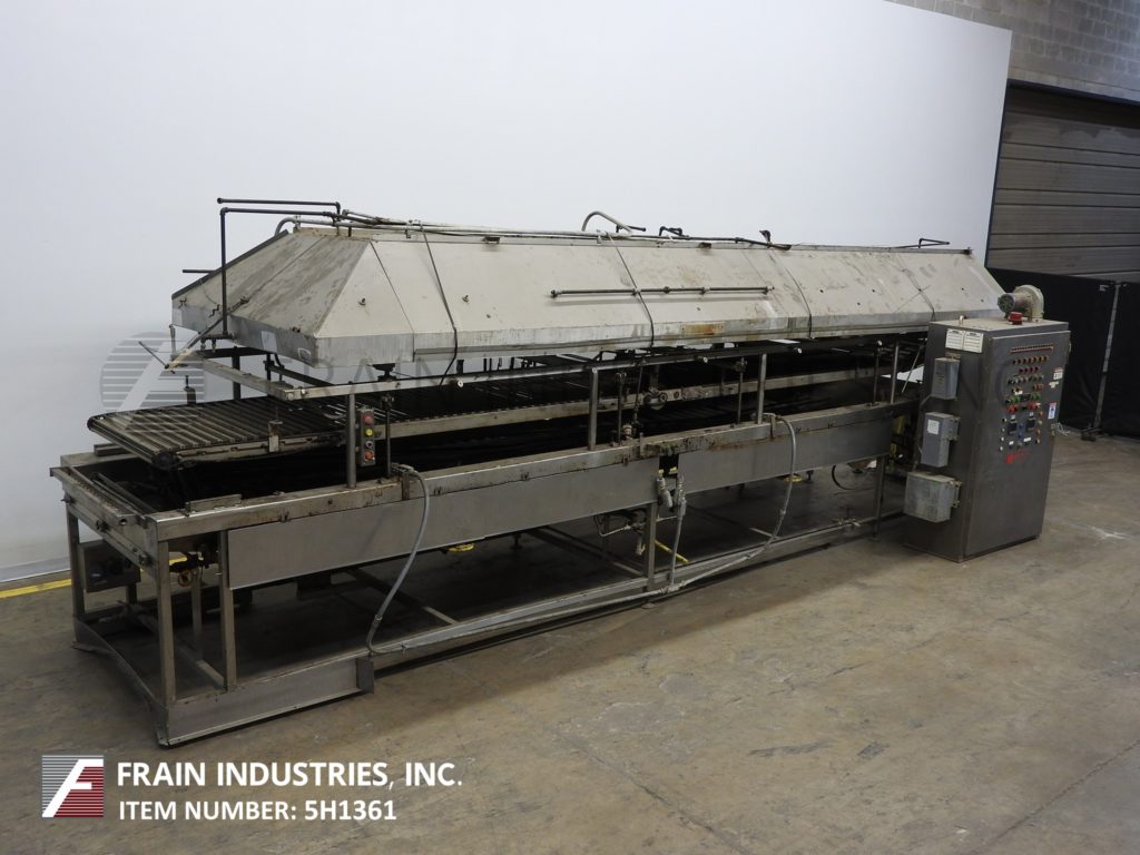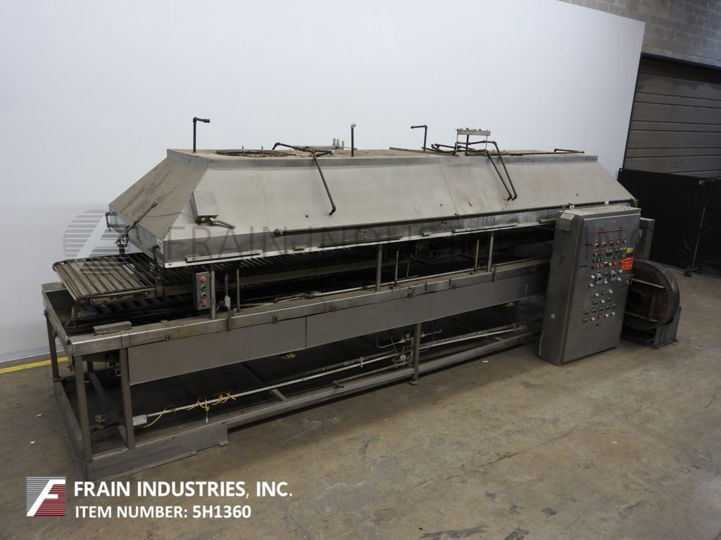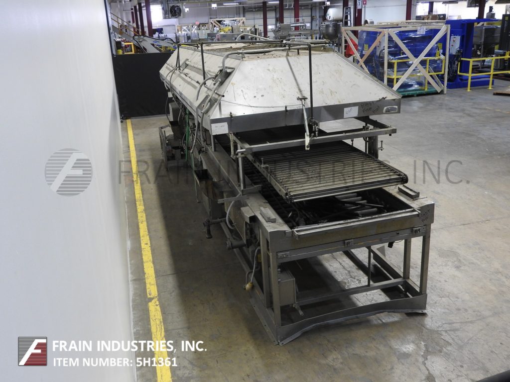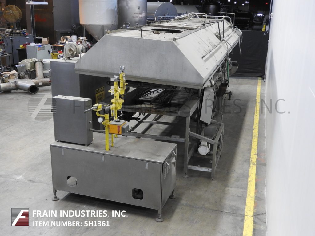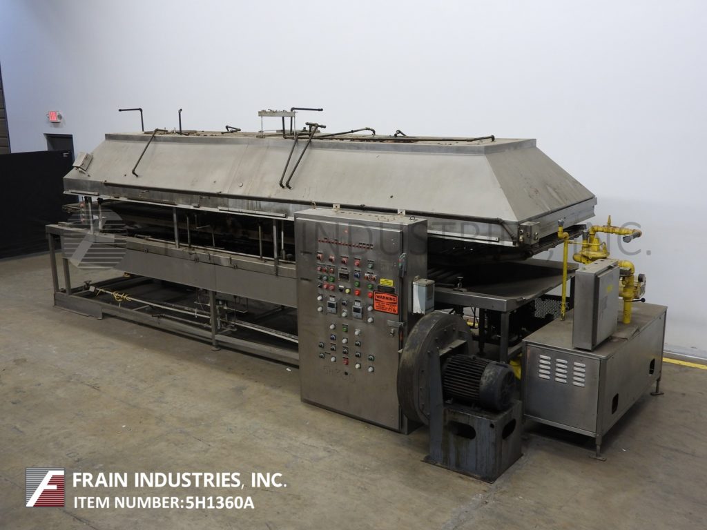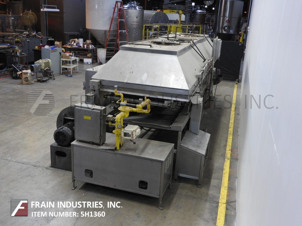莫林连续,全不锈钢结构,直接燃气,热油循环,浮动油炸圈饼每小时油炸圈饼数量-取决于材料和应用。鱼苗室尺寸:230"长度;宽度为44英寸,可油炸区为40英寸,燃烧器侧裙为不锈钢。下辊输送段76"前和84"后在长度,28"长不锈钢网斜卸输送机。前108”和后108”长度辊式输送机部分和中心联机甜甜圈特纳。配备了模块化不锈钢排气罩顶棚,直接安装在油炸锅上方,气动降低和提高,不需要天花板支撑,有(2)长笛烟囱和燃气列车与燃烧器和控制。遥控面板有1区和2区热控制器开关和油炸速度开关缩短泵,雨棚。主驱动和点火启动,停止,e-停止按钮控制。安装在重型不锈钢底座框架上。用来处理蛋糕和酵母发酵的甜甜圈。