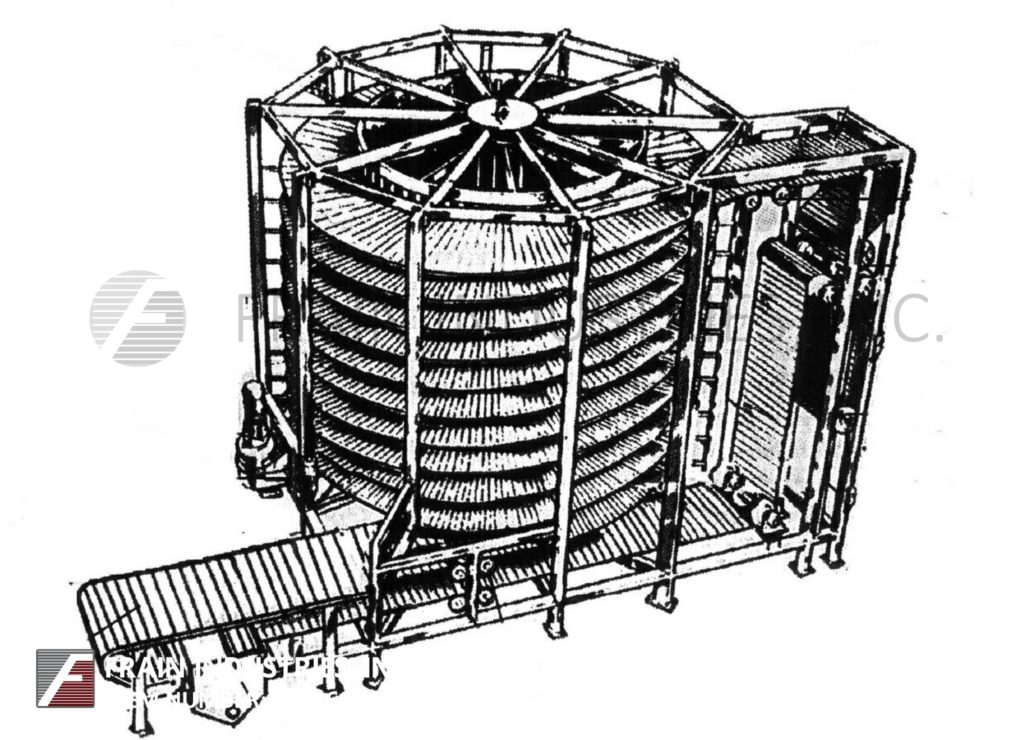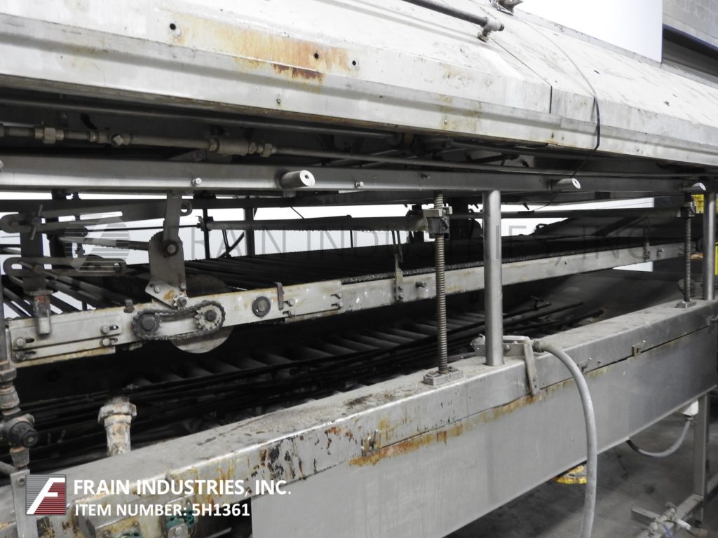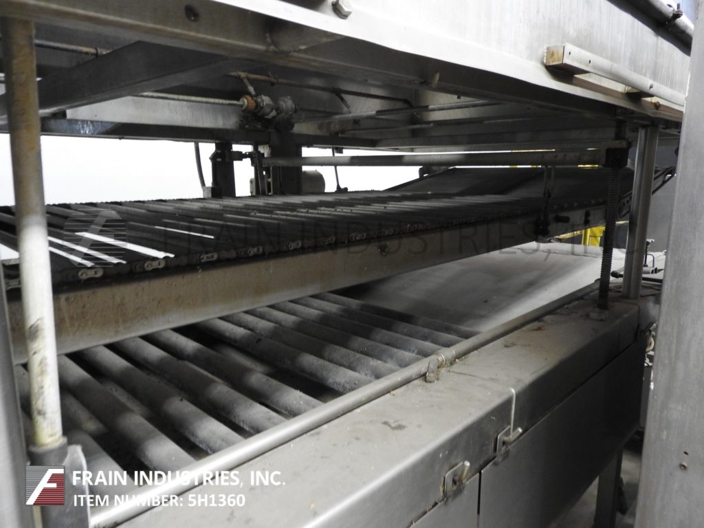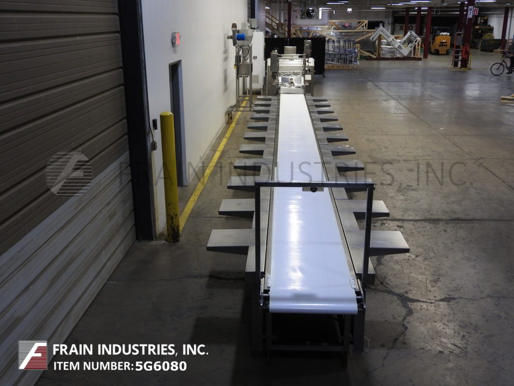 完整的甜甜圈,切割,沉积,油炸,冷却和糖衣线每小时的数量甜甜圈-取决于类型和大小运行。线由DCA不锈钢、18头甜甜圈面铣刀,存款人与双面团漏斗,喂食器和18切割头安装在风车式的直接燃气,与230年热油炸锅”长x 44”宽室40”的可行的弗莱区,顶部和底部辊子输送机部分与中心在线特纳甜甜圈,模块化排气罩适合直接在炸锅和气动降低和提高,没有天花板支持。我J白色(9)层、不锈钢,desending,螺旋,环境空气冷却系统与宽30“宽,28”可用1 x 1不锈钢flex网产品带,总长度为640的和有效的冷却长度为582 6“层间距和11 10”产品在饲料和6 ' 10”产品排放高度,风车式的连续,不锈钢,粉状,粒状或肉桂糖甜甜圈鼓涂层系统有24" ID x 88"长的涂层鼓,1"长x 1/2"宽的内部穿孔,36“长在饲料和24”长时间放电降落伞和10“OD结束糖回收槽不锈钢回收苏格本与内外桨以及4”OD不锈钢底丝杠- 80“长斜坡高花纹馈线与6”宽腰带和1 - 1/2“高防滑钉上设置6”中心带盖。所有安装在不锈钢底座框架和独立的控制器。