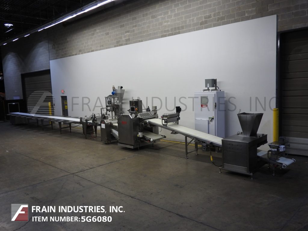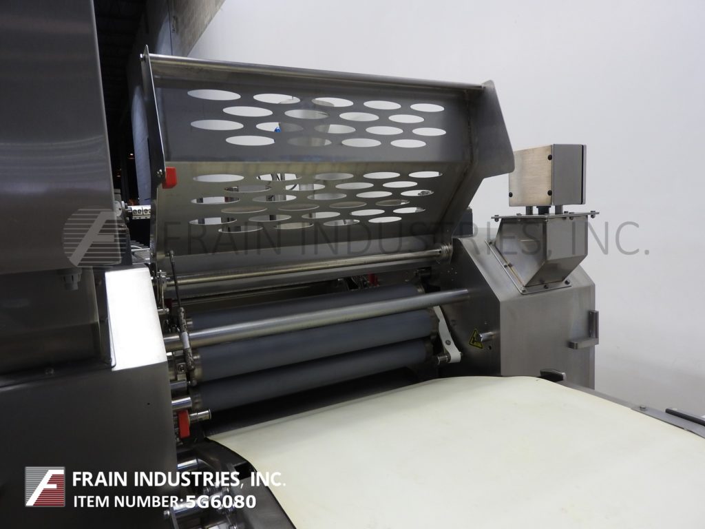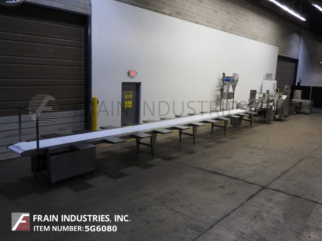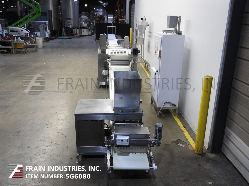 Moline,完全不锈钢板线每小时磅产品-取决于材料,应用和操作灵巧。配备24“宽产品带与带喷粉机,20”宽面团挤出机24“宽x 20“长x 25“深料斗,面团上喷粉机,(6)酒吧面团辊成(2)辊压缩,中等生面团压辊,旋转模切,吸尘罩和400年“长包输送机(20)操作员站工作。系统由AB PLC和AB panel view触摸屏HMI远程控制面板控制。所有安装在不锈钢框架与水平腿。