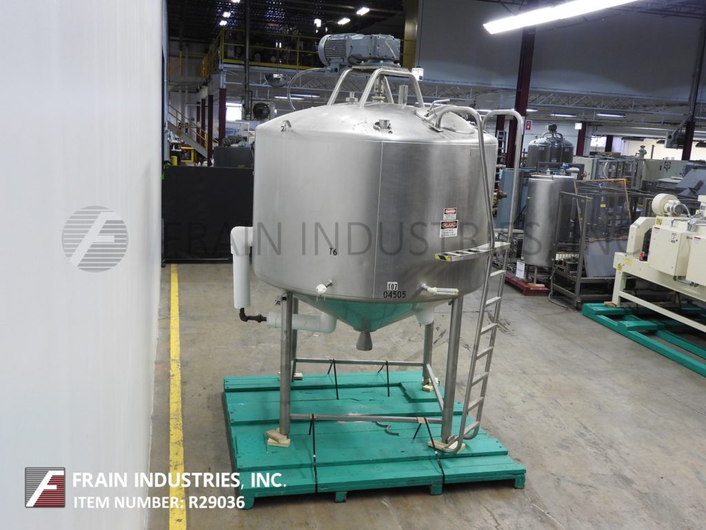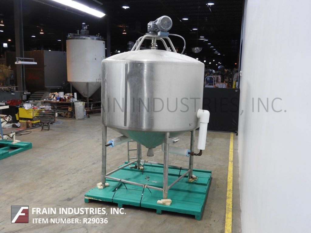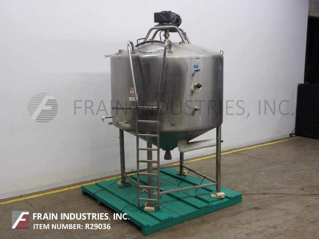 Mueller,900加仑,316不锈钢,单墙,混合罐。血管尺寸:60“直径; 72”直墙。配备圆顶顶部,中心桥式桨式搅拌,18英寸“直径通道,四个固定挡板,两个3.5”od三层顶尖入口,菜底,以及3“OD三星中心底部放电,10”地面清关。安装在不锈钢腿上。