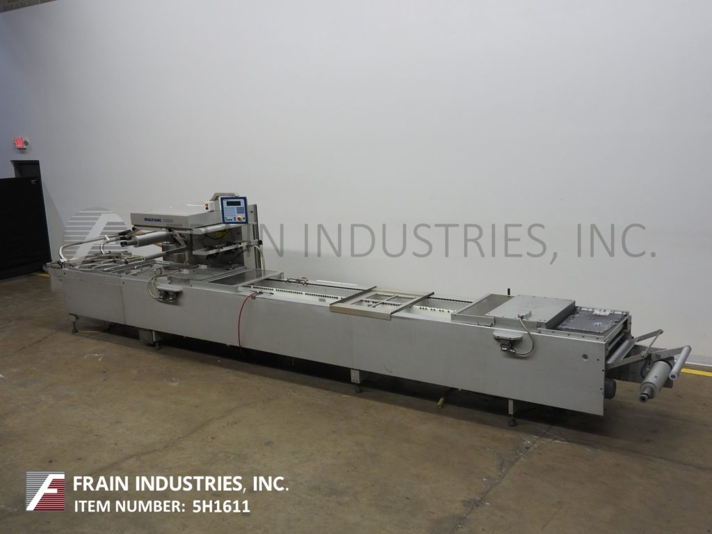 Multivac型号R5200,内线,间歇运动,卷料,形式,填充和密封热压former与每分钟产品的周期和数量-取决于材料和应用。膜宽320mm - 620mm,最大深度130mm,最大截止长度600mm。(工具是每个应用程序需要更改的部分)。配有28“长底膜卷2 - 1/2”OD核心与顶部和底部flexable成膜死了,112年“长产品负载面积与气体冲洗和步进驱动的舞女酒吧24”长膜卷2 - 1/2“OD核心,顶部和底部密封死24”长十字刀,(2)套longital扶轮纵割机。控制面板有PLC控制器摆动臂触摸板控制,面板视图和启动,停止,e-stop按钮与Bellmark打印机和Neslab制冷水冷却器。安装在重型基础框架与水平腿。