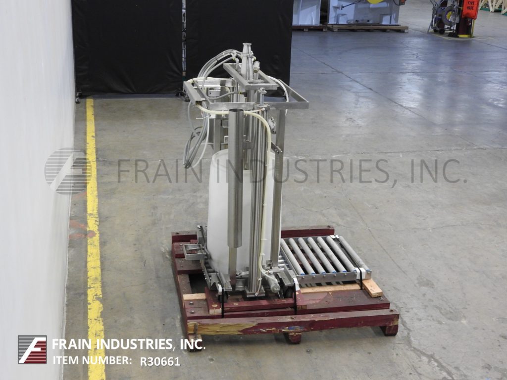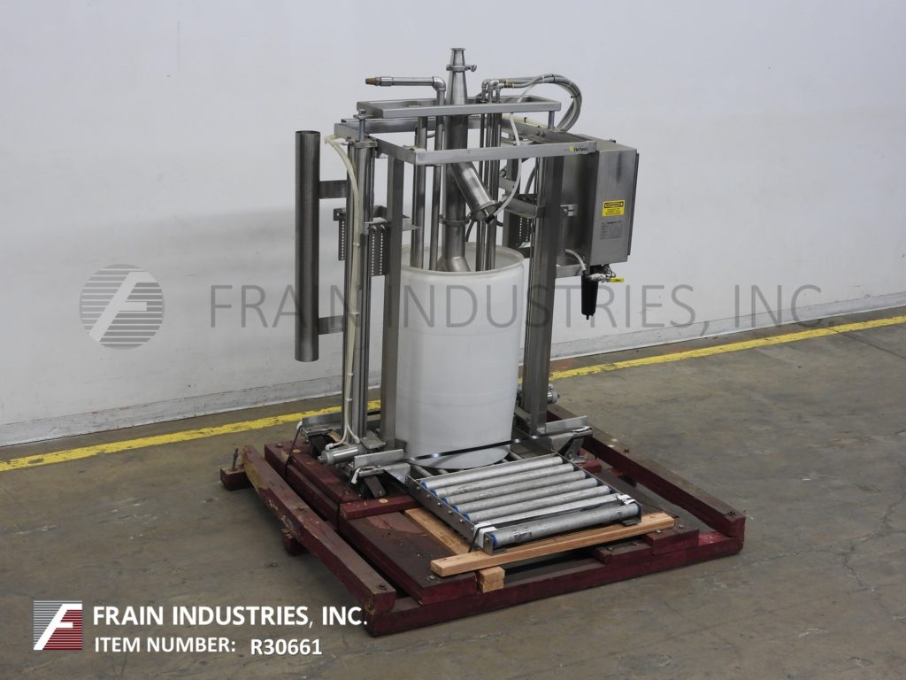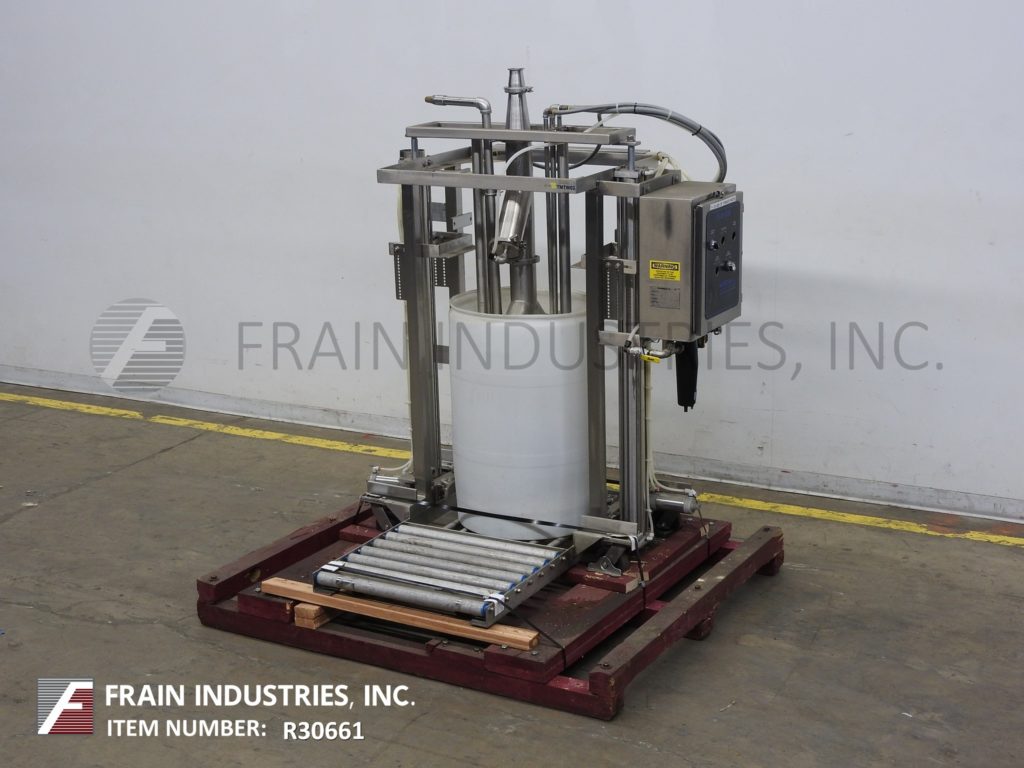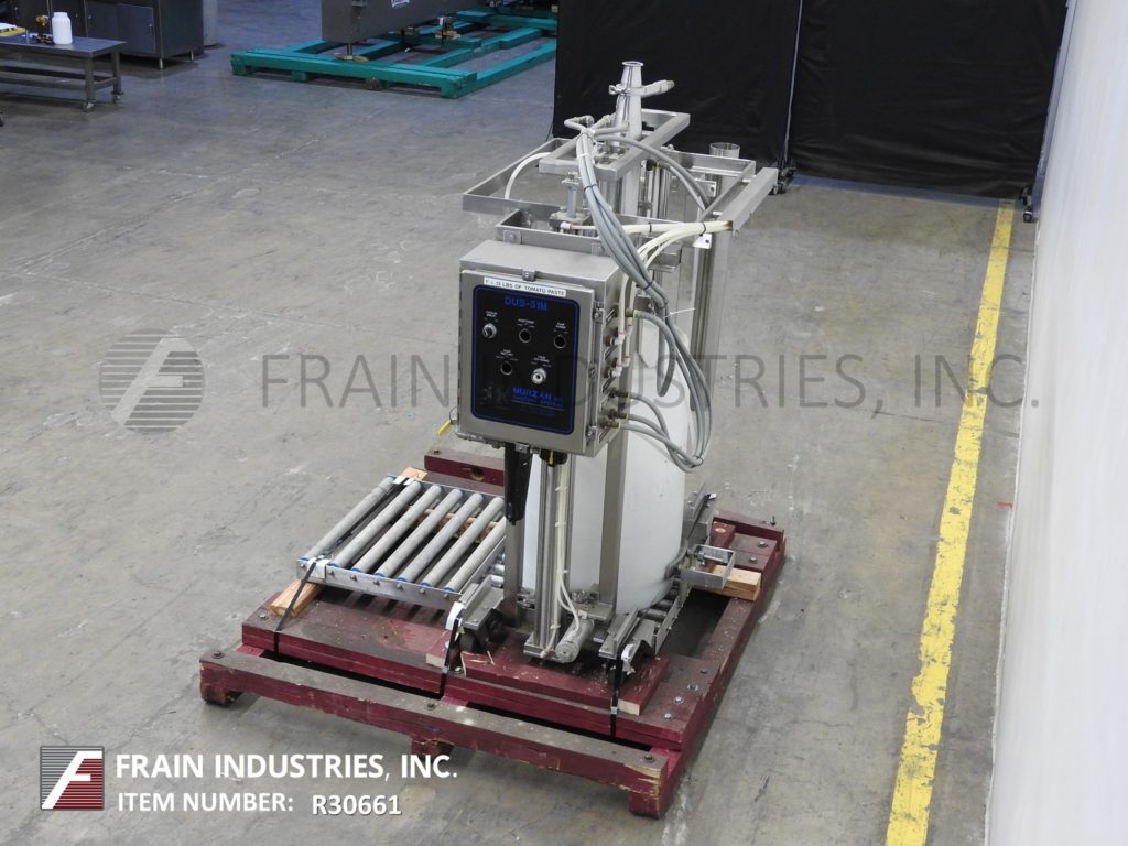 Murzan型号DUS-10M,卫生,不锈钢,55加仑桶卸料机,每小时桶数-取决于材料,应用,泵配置和操作熟练度。配备Murzan PI-50型双隔膜泵,21英寸不锈钢从动件板。非润滑,无油空气阀。控制面板上有机器和袋吹气开关。吹袋/泵,提高,降低和重新启动控制。可泵送金属、塑料或纤维制成的桶,有或没有内衬。可以处理大多数粘度高达150000厘沉和固体高达6英寸的粘性产品。CIP可选配适配器。安装在39"长x 31"宽不锈钢平台框架。