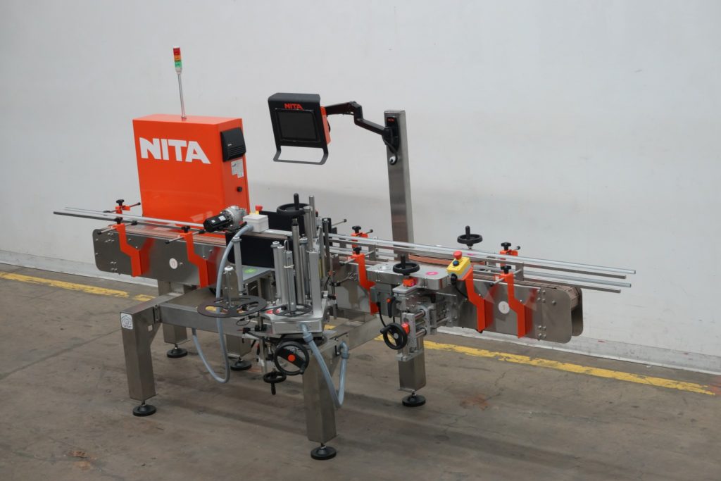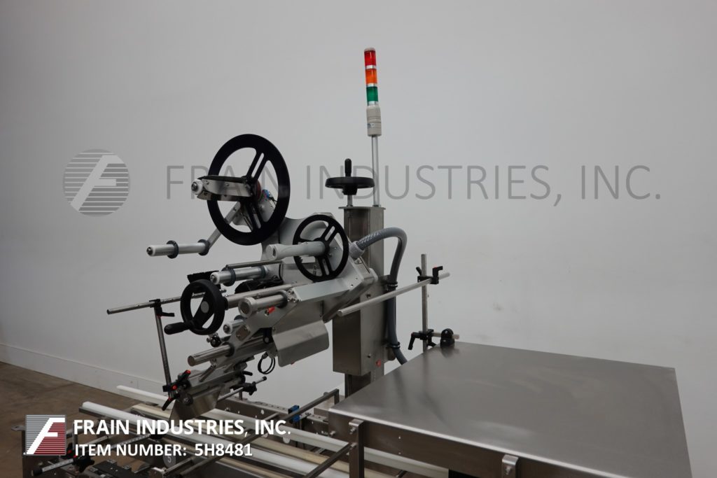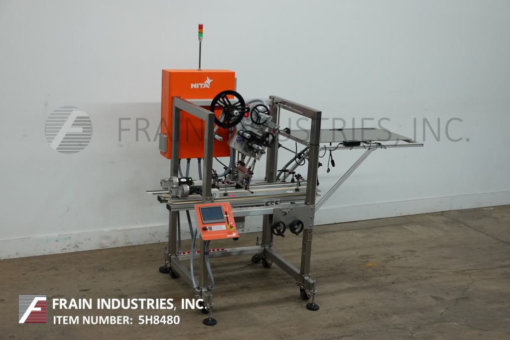 Nita, XP100型,不锈钢,包装压力敏感标签额定从100"至1570"包装标签每分钟容器数量-取决于材料和应用。标签大小范围:1“到9”的高度。配备116"长x 4"宽塑料德林产品在饲料输送机与可调导轨,对齐皮带为集装箱方,标签头10"高剥离板和16"长x 6"高侧包装输送机所有手曲柄可调。控制面板有触摸屏人机界面。安装在不锈钢底座框架与脚轮和调平腿。