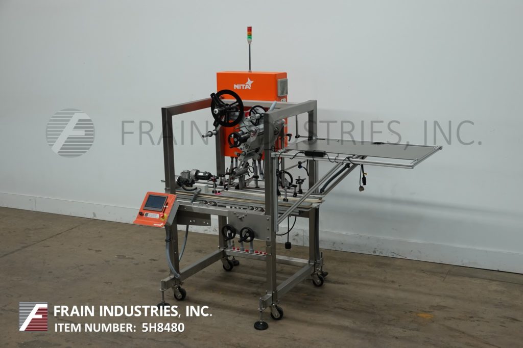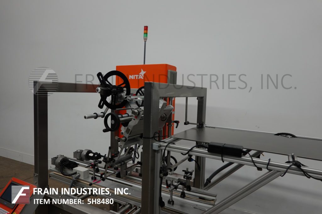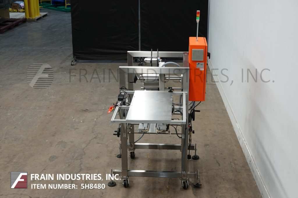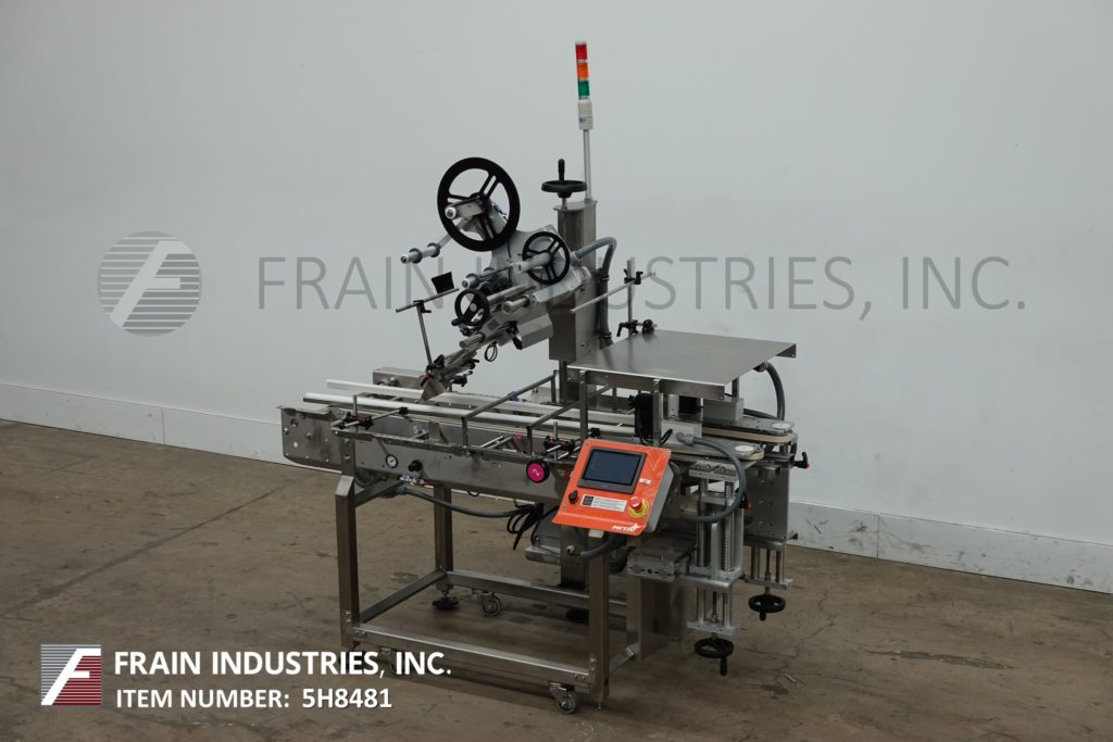 Nita型号SSK“C”型(顶部,前缘和底部)压敏标签额定从0到1570“每分钟容器数量-取决于材料,应用和机器配置。不锈钢结构。容器尺寸范围:宽度可达15";高达13英寸的高度。标签尺寸范围:1/2"至6"宽度;1/2"到12"长度。精度:+ / - 1/32”。配备双58" by 2"侧带产品输送机,可调节导轨,压敏擦拭标签涂抹器,擦拭门系统和照片眼。标签规格:12"外径3"芯。伺服驱动和触摸板控制器。 Mounted on (4) leg frame with casters and leveling legs.