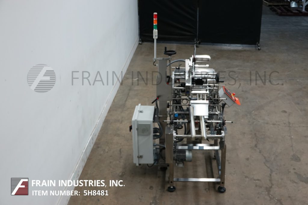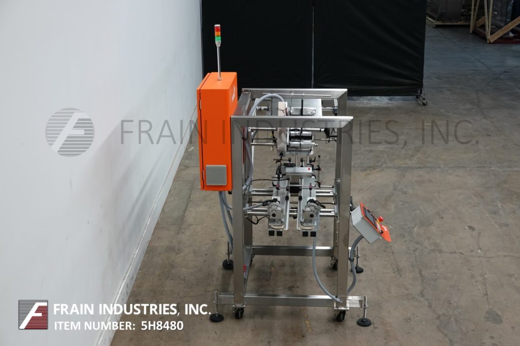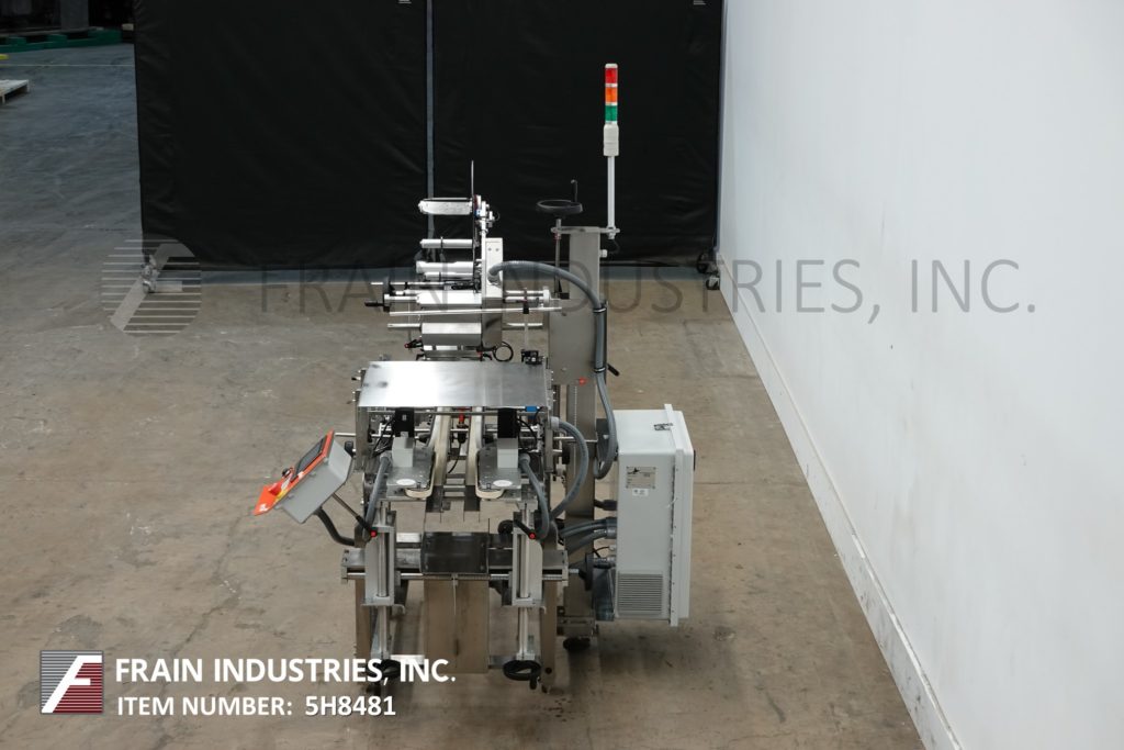 Nita型号SSK“C”型(顶部,前缘和底部)压敏标签额定从0到1570“每分钟容器数量-取决于材料,应用和机器配置。不锈钢结构。容器尺寸范围:宽度可达9";高达10英寸的高度。标签尺寸范围:1/2"至6"宽度;1/2"到12"长度。精度:+ / - 1/32”。配备双16"长边带产品馈送输送机,双56"长x 1½"宽底部输送机,可调节导轨,压敏擦拭标签涂抹器和照片眼。标签规格:12"外径3"芯。伺服驱动,触摸屏人机界面。 Mounted on (4) leg frame with casters and leveling legs.