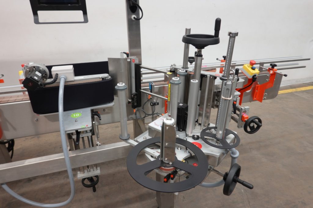 尼塔,模型Joust SSK 360,压力敏感,360度标签涂抹器。容器尺寸范围:宽度可达15.5";高达14英寸的高度。标签尺寸范围:宽度可达6英寸。配备伺服双侧带式产品输送系统,配有可调导轨,伺服压敏贴标器(额定1570" /分钟),刷擦系统,同步伺服后贴标摆臂,触摸屏控制器。标签精度为1/32"。标签规格:直径12“3”芯。安装在脚轮和调平腿上。速度,集装箱高度,集装箱长度和标签长度取决于材料,应用和机器配置。